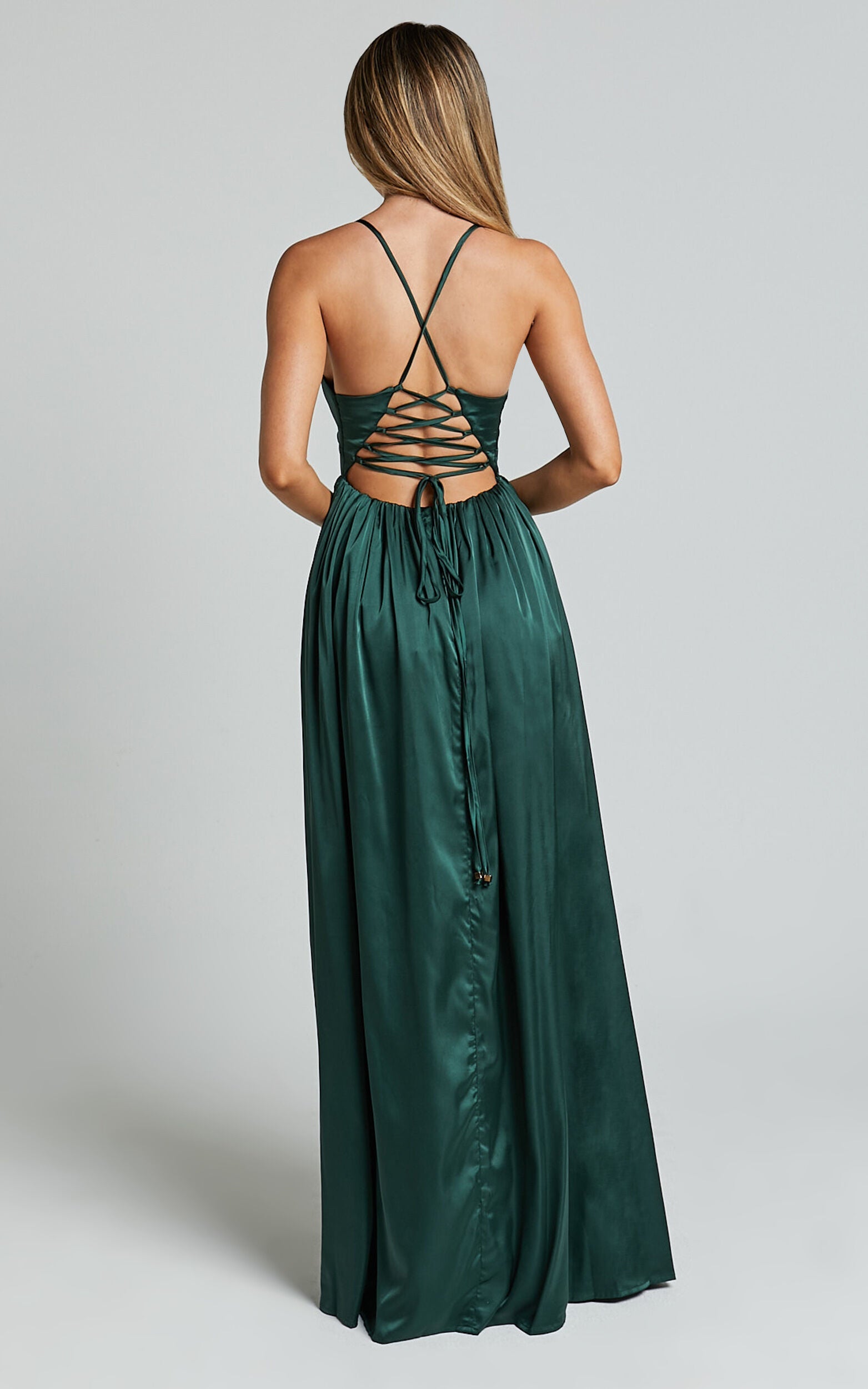 Stun the crowd in our I Want The World To Know Dress! Crafted from a sumptuous satin fabric, it features a plunging neckline and a fitted bodice with spaghetti straps that tie at the back for a corset-inspired look. Below the waist, a full maxi skirt with dense gathers and a deep side split gives it a striking finish. We dare you not to swish!