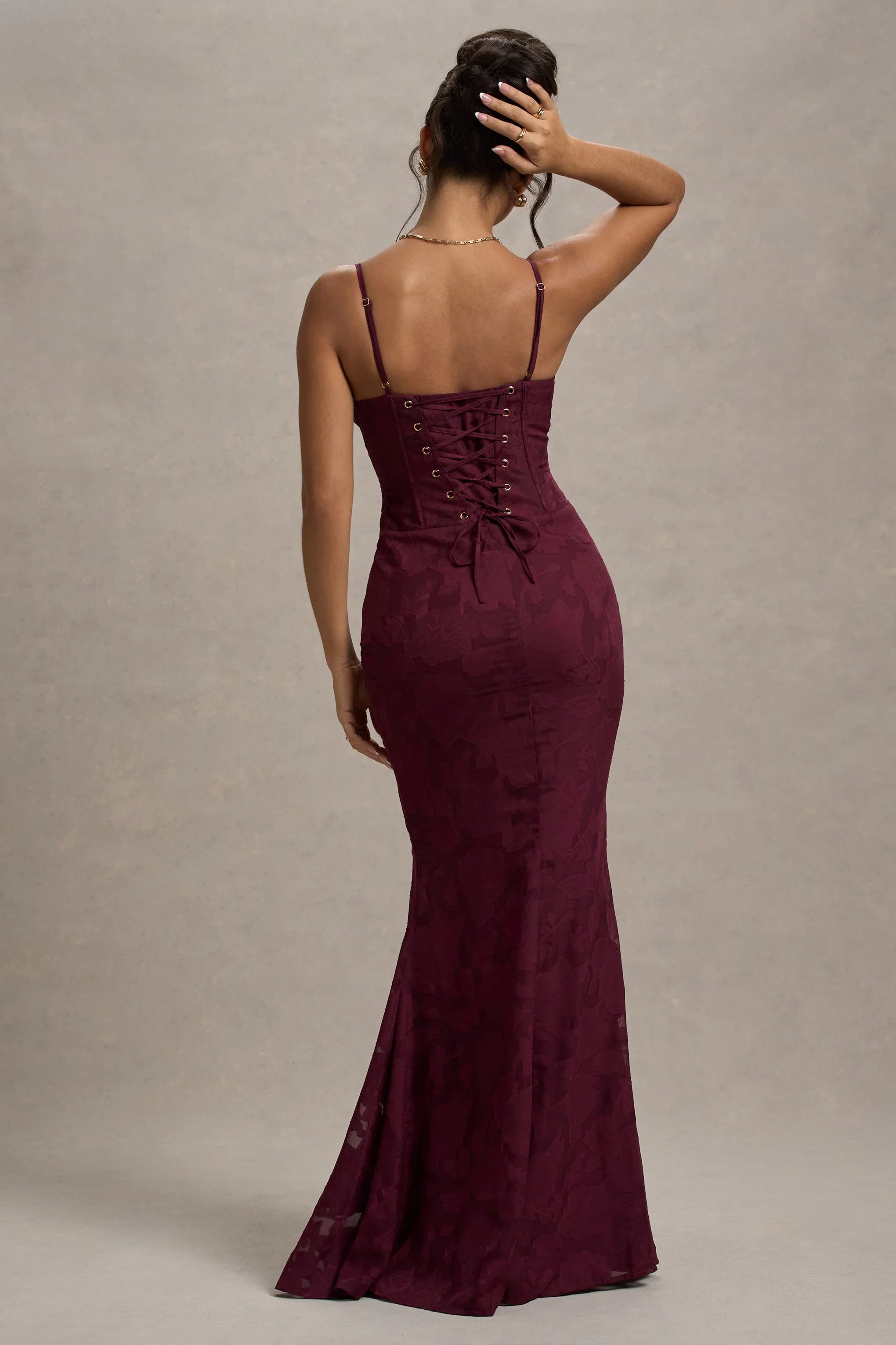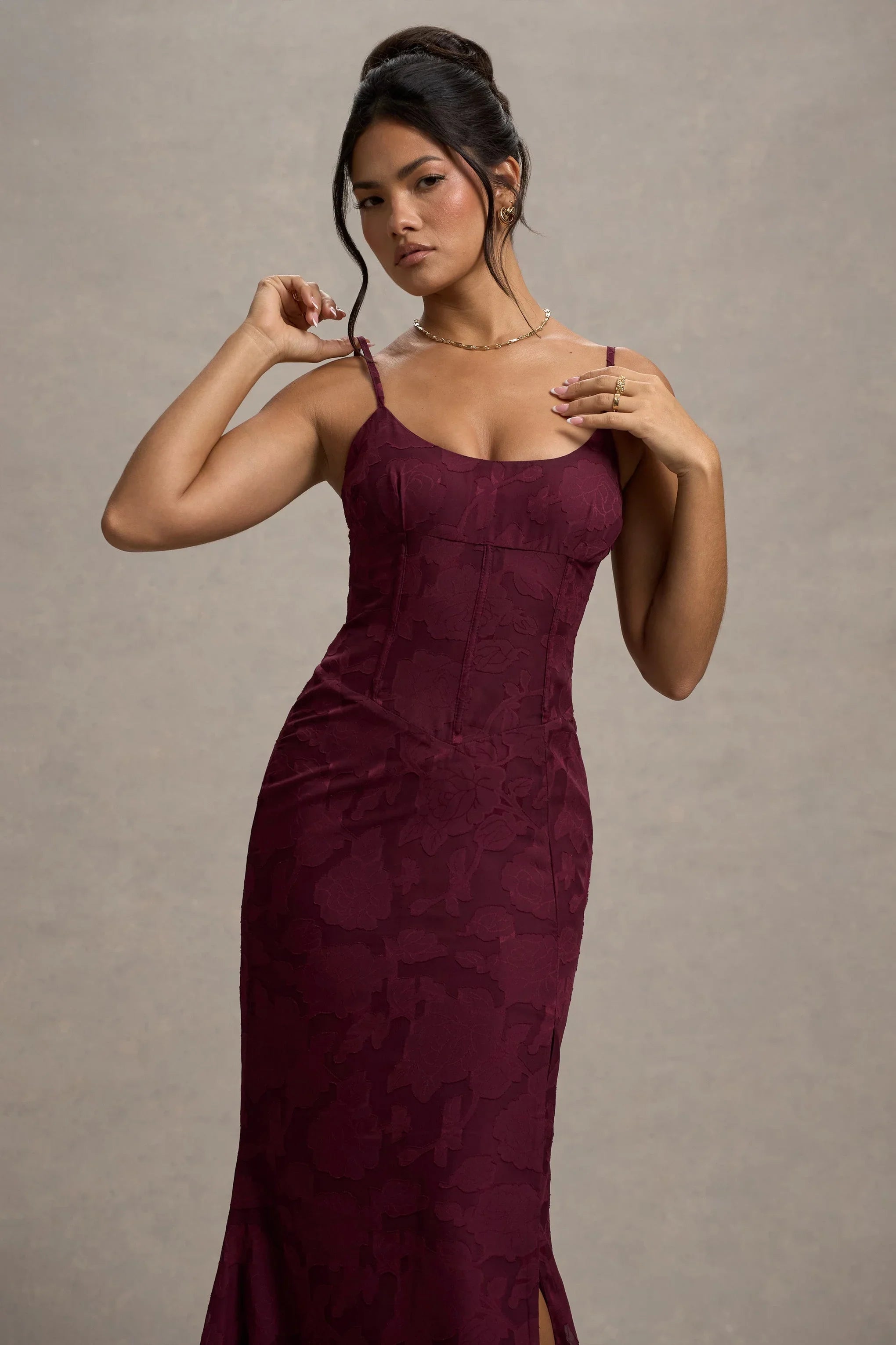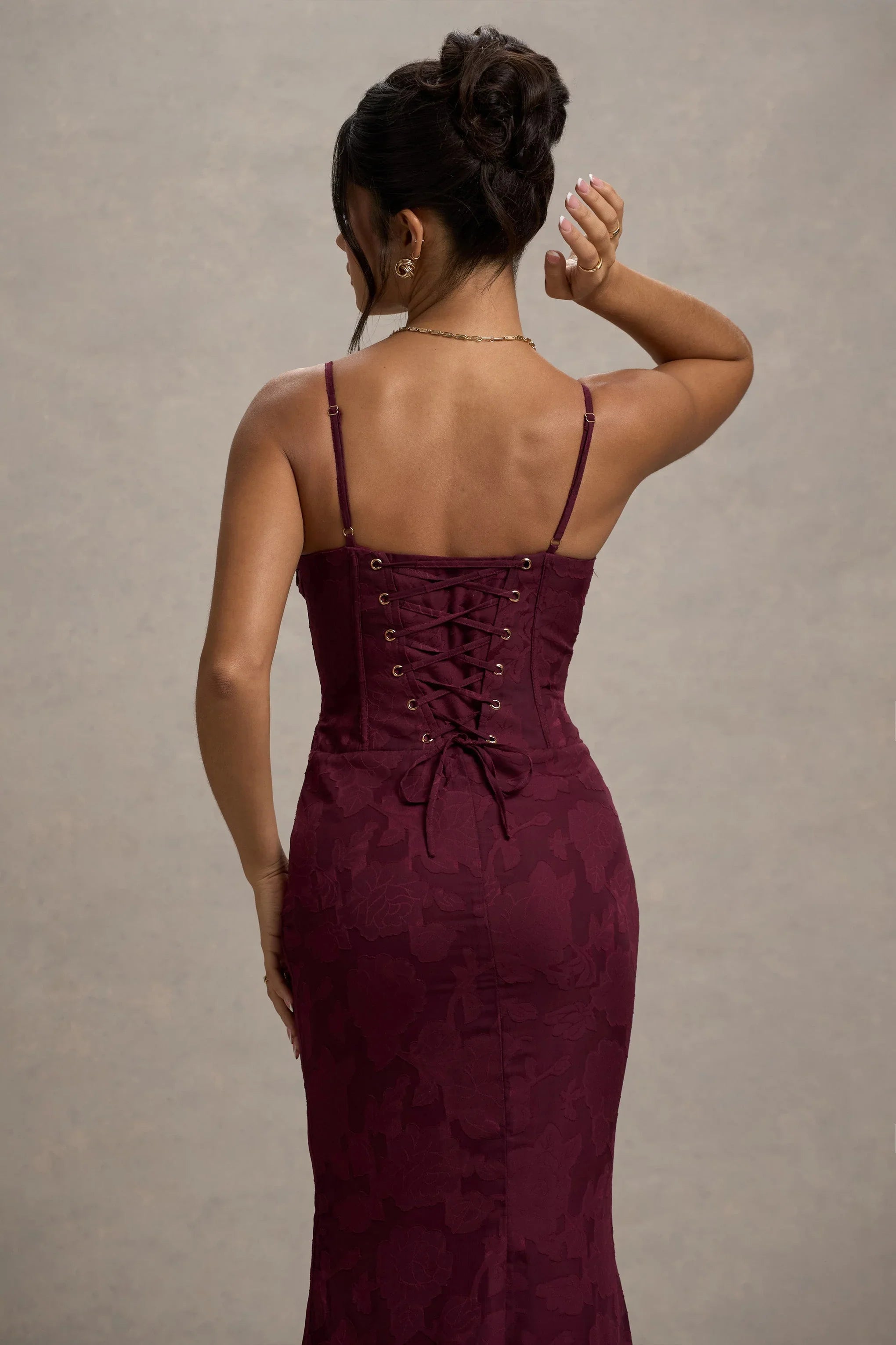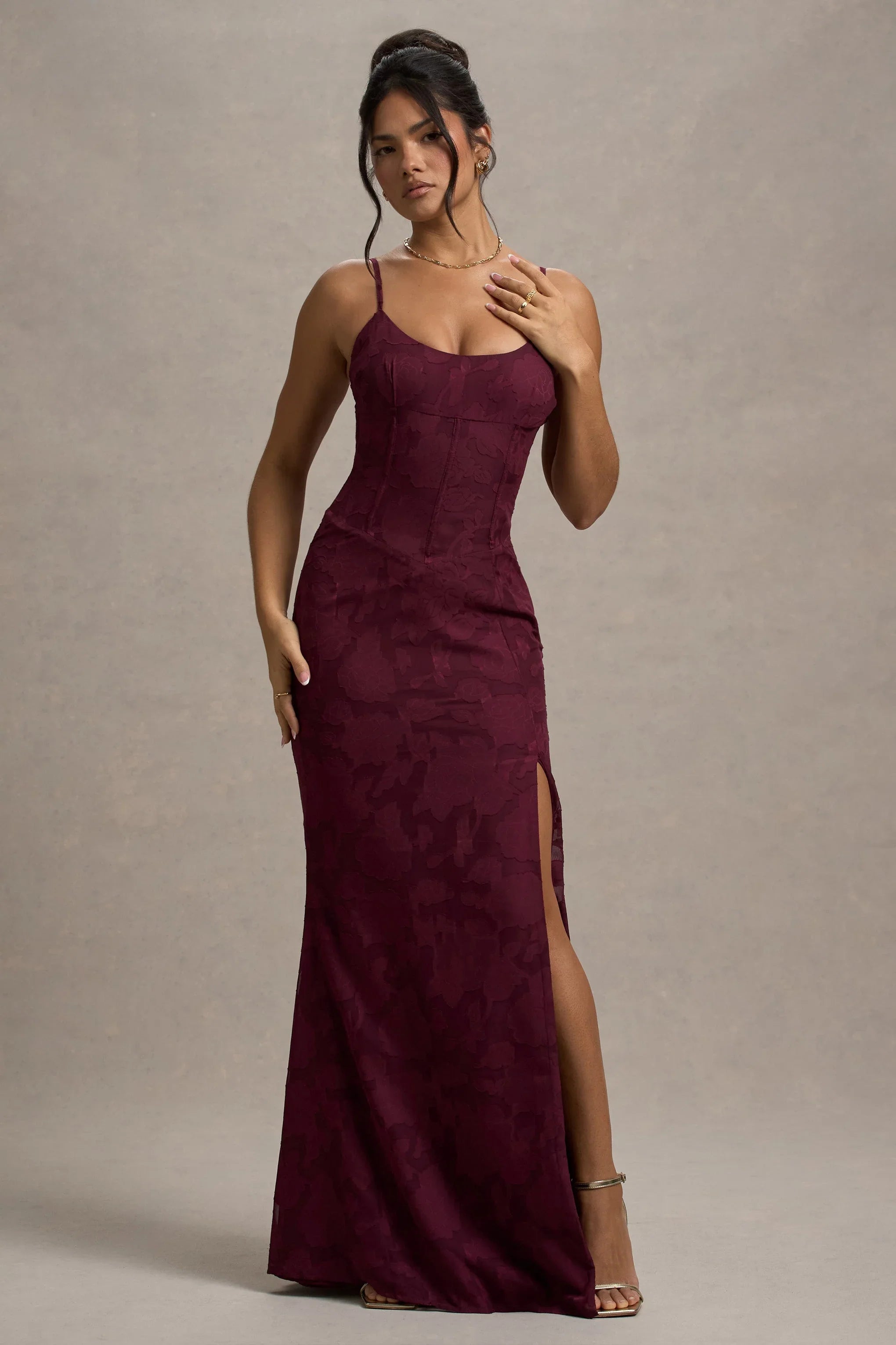Captivate from all angles this summer in Intimacy, our figure-flattering maxi dress. Designed in a rich plum shade highlighted by soft floral detailing, this ethereal piece features a sculpting corset bodice, lace-up back adjustable cami straps for a personalised fit. Complete with a tantalising leg split, there are so many details to love with Intimacy.