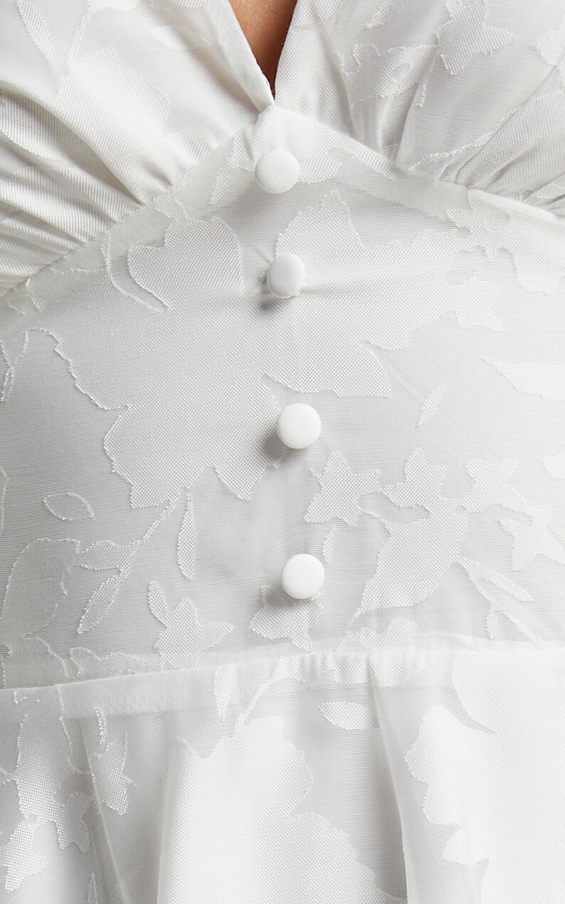 Make a statement in the Jammae Puff Sleeve Mini Dress in White. This dress is perfect for any occasion - whether you're looking to dress it up for a party or keep it casual for a day out with friends. The playful puff sleeves add an extra touch of femininity, while the fit and flare design cinches at the waist and flares out to create a flattering silhouette.The plunging neckline adds just the right amount of allure, making this mini dress perfect for autumn evenings. Don't miss out on this must-have addition to your wardrobe!
