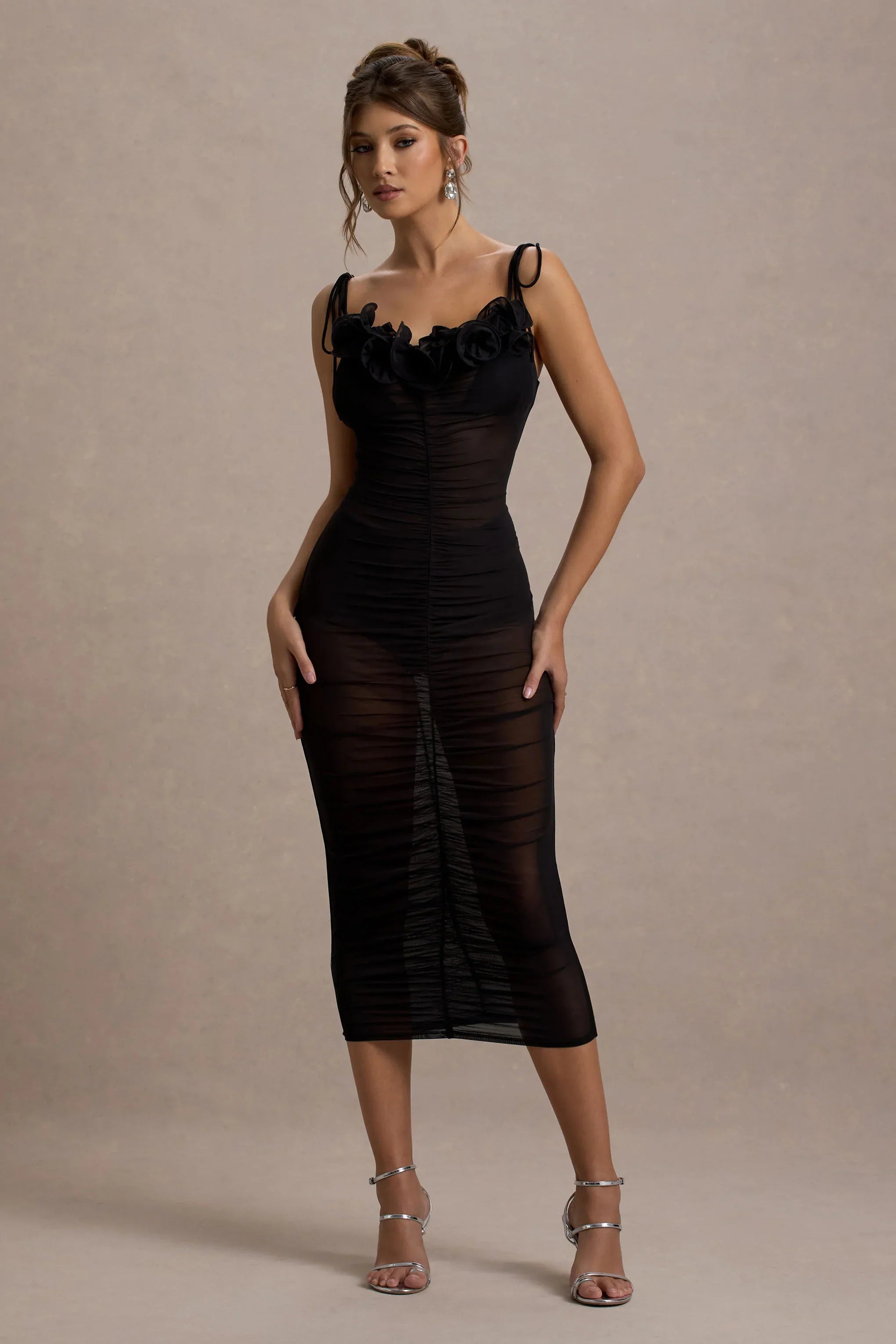 Opt for sheer perfection in our mesh LBD, Jesi. Designed in a curve-accentuating ruched silhouette, this black midi dress is detailed by an artful ruffle neckline and self-tie straps. Style yours with a tousled bun and some golden accents for a sultry Saturday night ensemble.