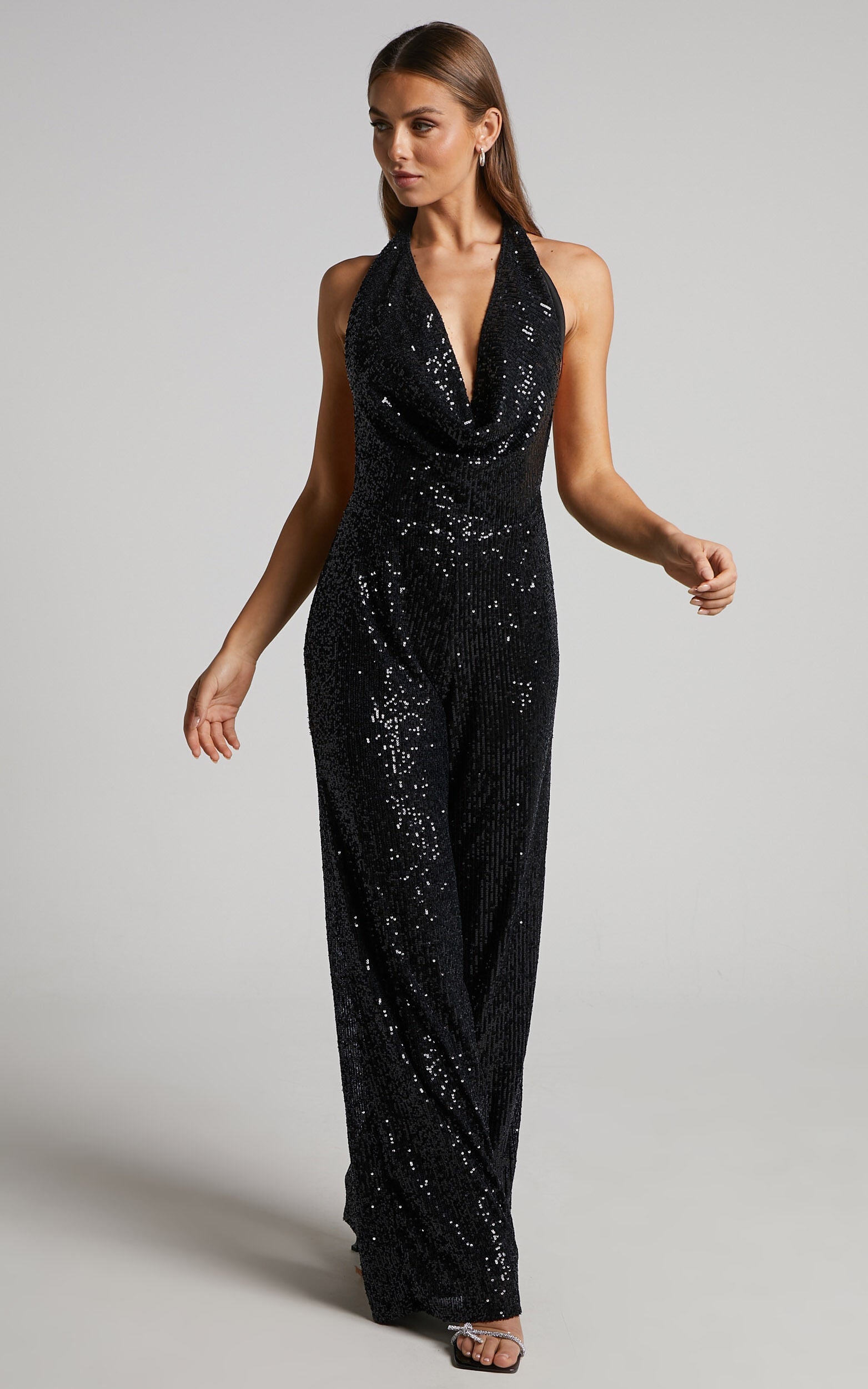 Keep it chic and luxe all weekend long in our Julien Jumpsuit! This one-and-done sequin piece will be your go-to from day parties to soir��es and everything in between. Featuring a plunging halter cowl neck, open back and wide legs, this sequin ensemble will have you feeling like a total main character wherever you are. Wear it with platform heels, hoops, a clutch and tie your hair in a slick back ponytail for a classy look!