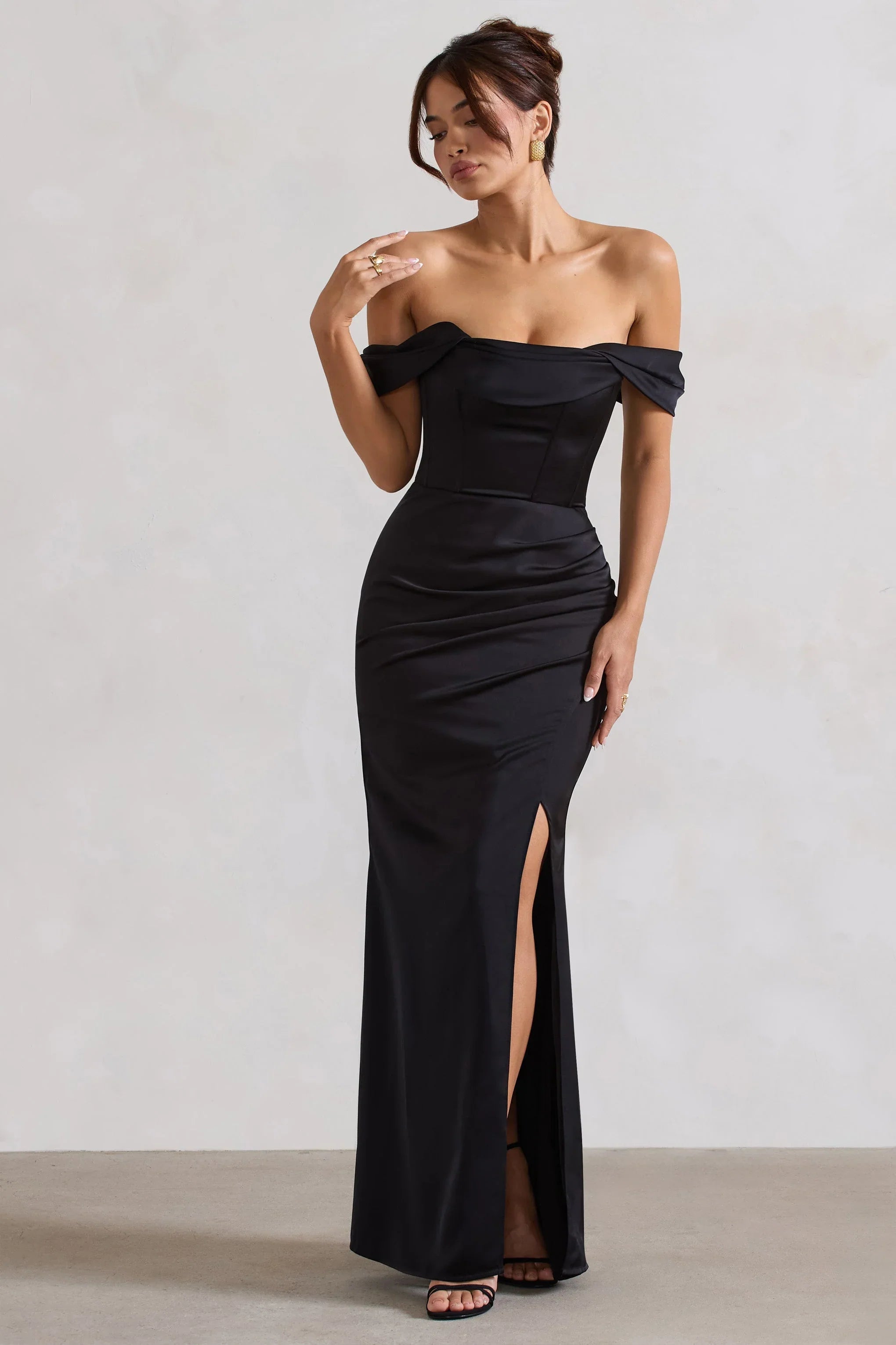 Bring the glamour to any special occasion in our black Kimberly maxi dress. Boasting a contouring corset, draped short sleeves and a bardot neckline, this dress is sure to make a statement and leave other guests envious. Carefully crafted in weighted satin and complete with a floor-sweeping skirt, Kimberly is the must-have maxi for weddings, birthdays and black tie events.