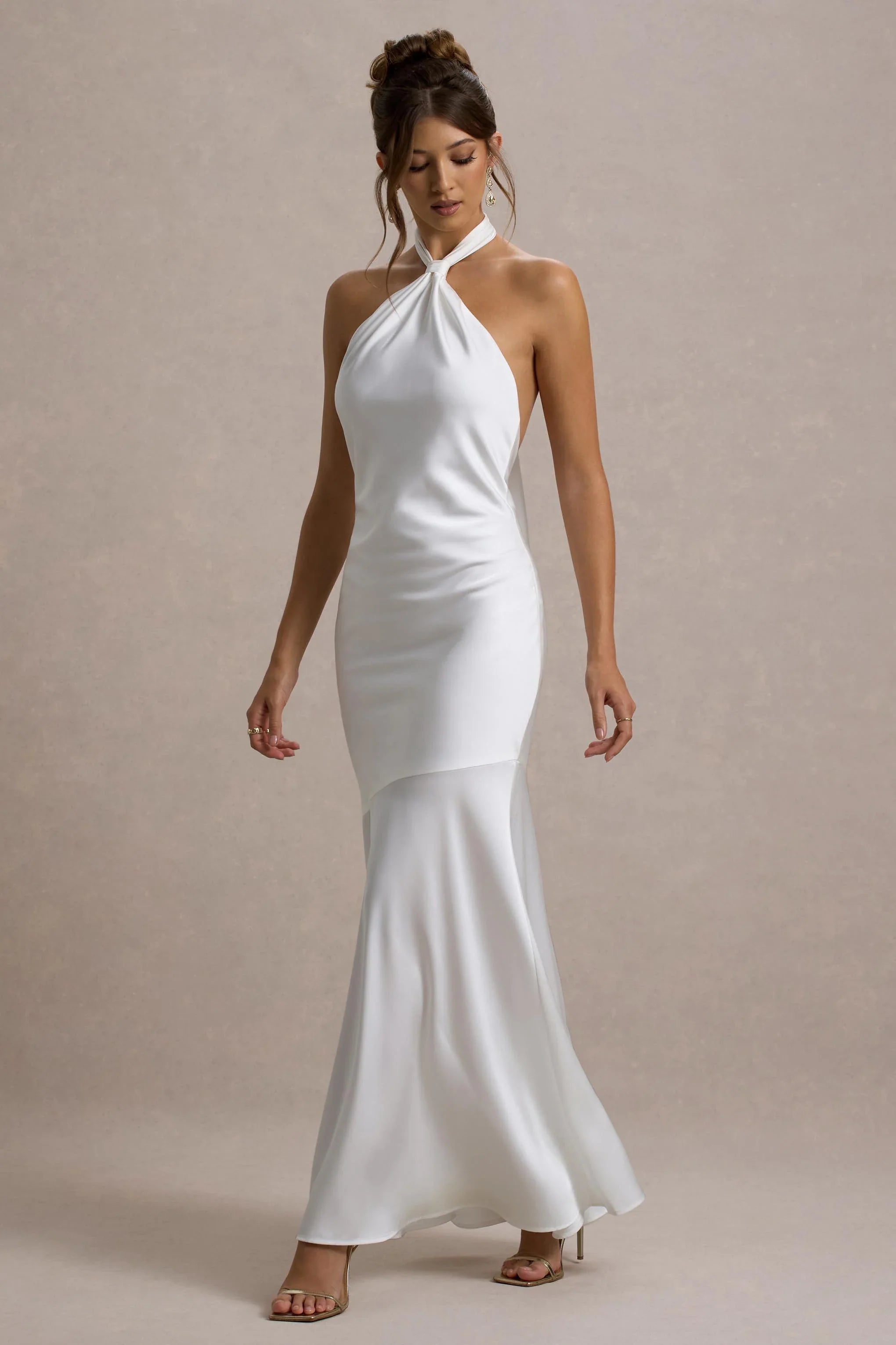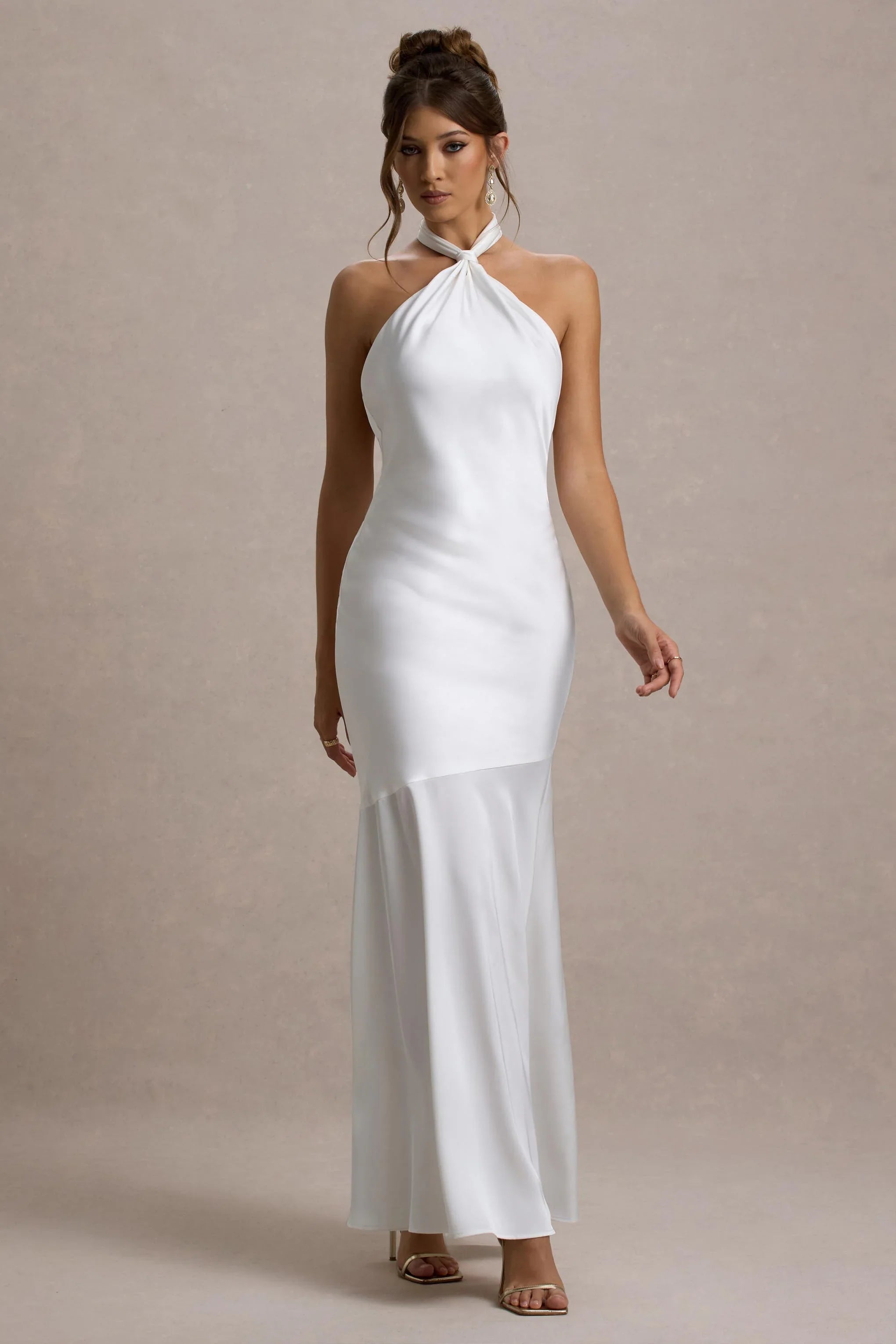 Defined by sleek lines and refined elegance, Knox is a stunning choice for the modern bride. Crafted from our premium stretch satin, this white maxi features a chic knot halter-neck that adds a touch of contemporary sophistication. The form-fitting silhouette gracefully flatters your curves, while the floor-length maxi skirt flows effortlessly for a timeless look. Knox is the perfect statement piece for your unforgettable day.