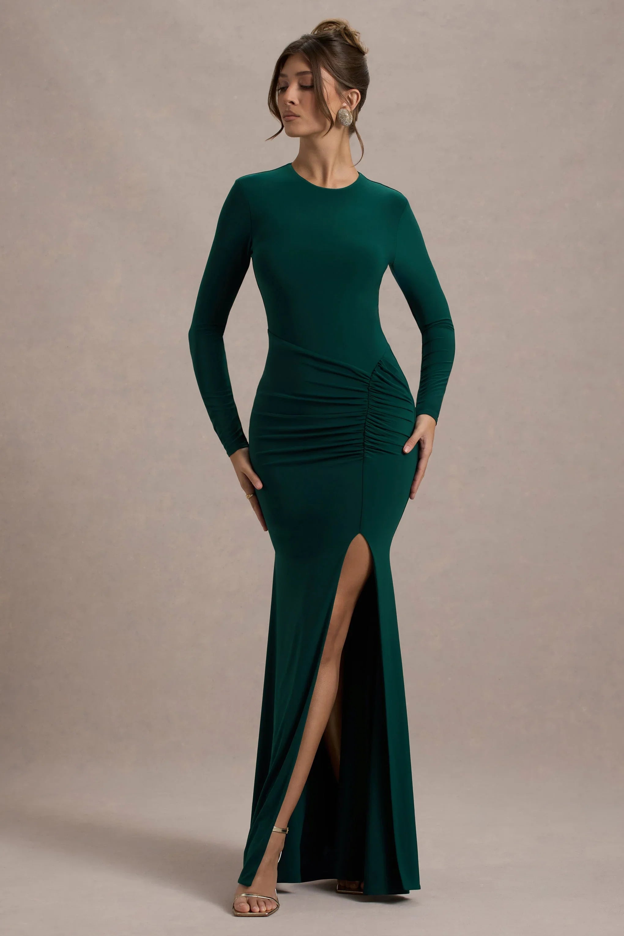 Sculpt your silhouette in Leslie, our form-flattering maxi dress. Arriving in a rich bottle green shade of our dual-layered jersey, this stand-out staple boasts a gathered waist, long sleeves and high-leg split. Compliment Leslie's deep shade with some gold accents like Virtue.