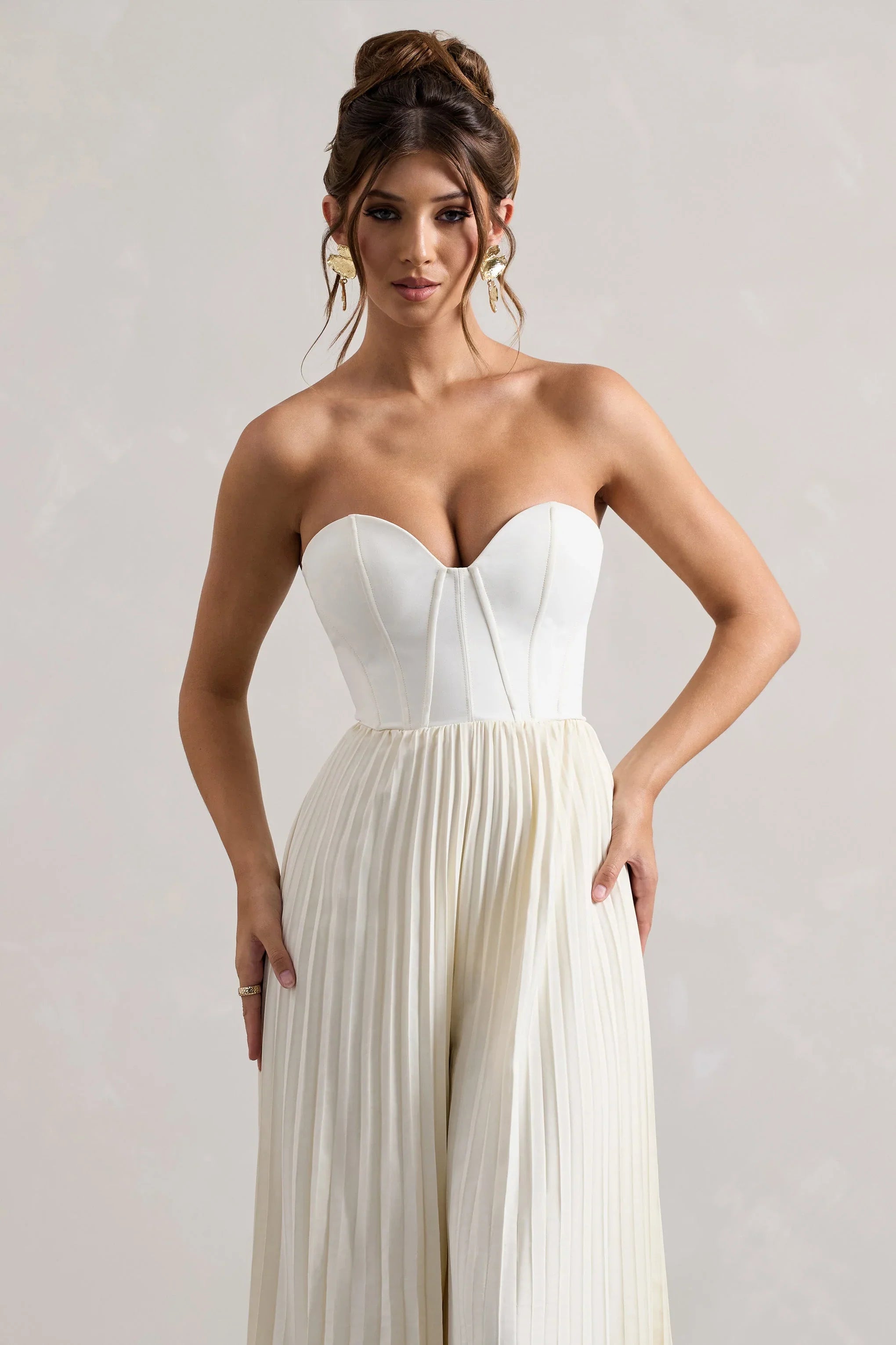 A simplistic and sophisticated jumpsuit that gives you and elevated occasion look is Lorelai. Arriving premium crepe and woven fabrics, this cream jumpsuit boasts a structured corset bodice creating that cinched waist look. Lorelai showcases flowing elegant plisse legs giving them dimension.