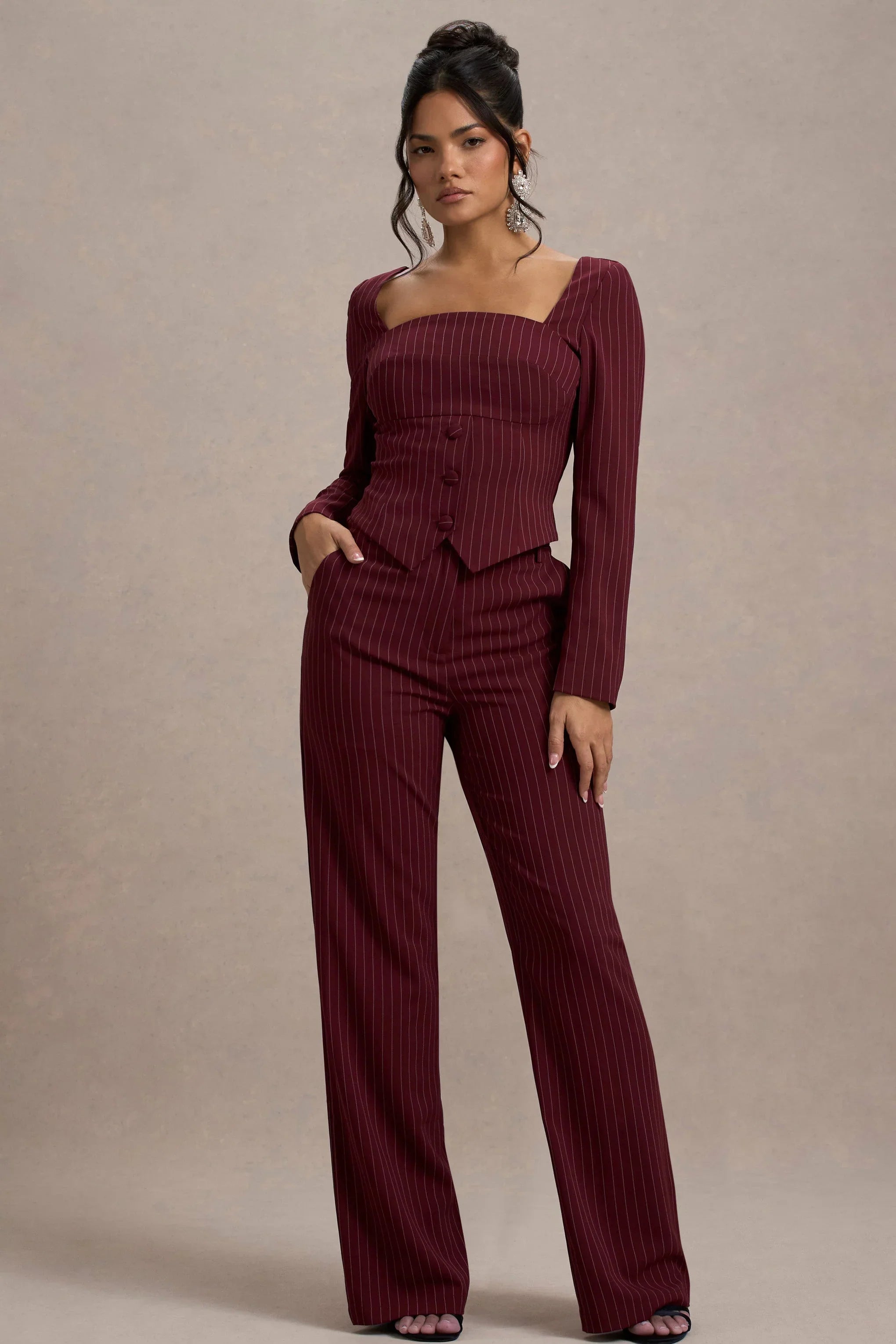 Take yourself from office to bar in our premium tailored top, Los Angeles. Designed in a wine pinstripe, this staple feature a flattering square neckline, long sleeves and mock button-up front. Pair yours with its matching trousers New York for a preppy co-ord ensemble.