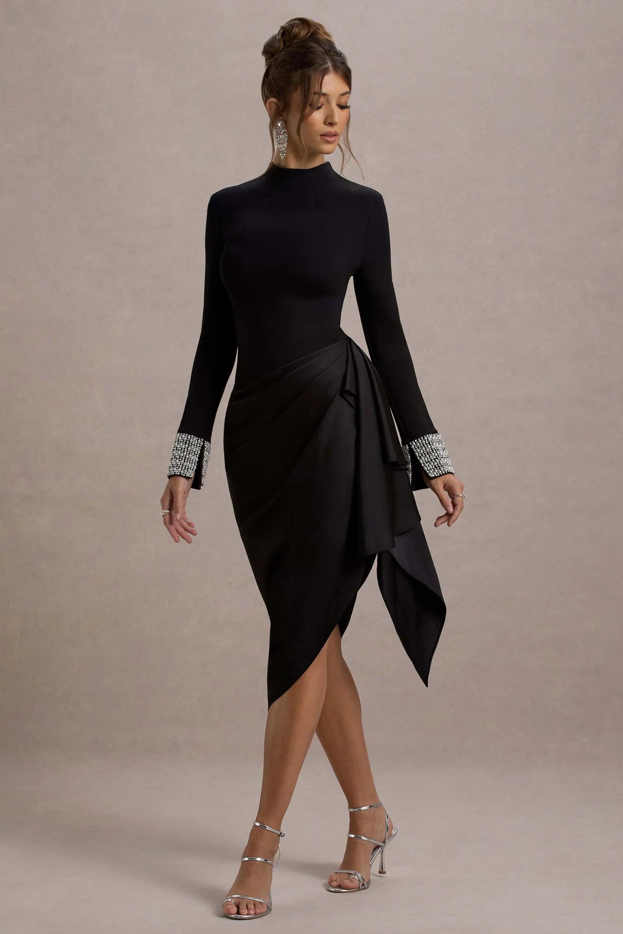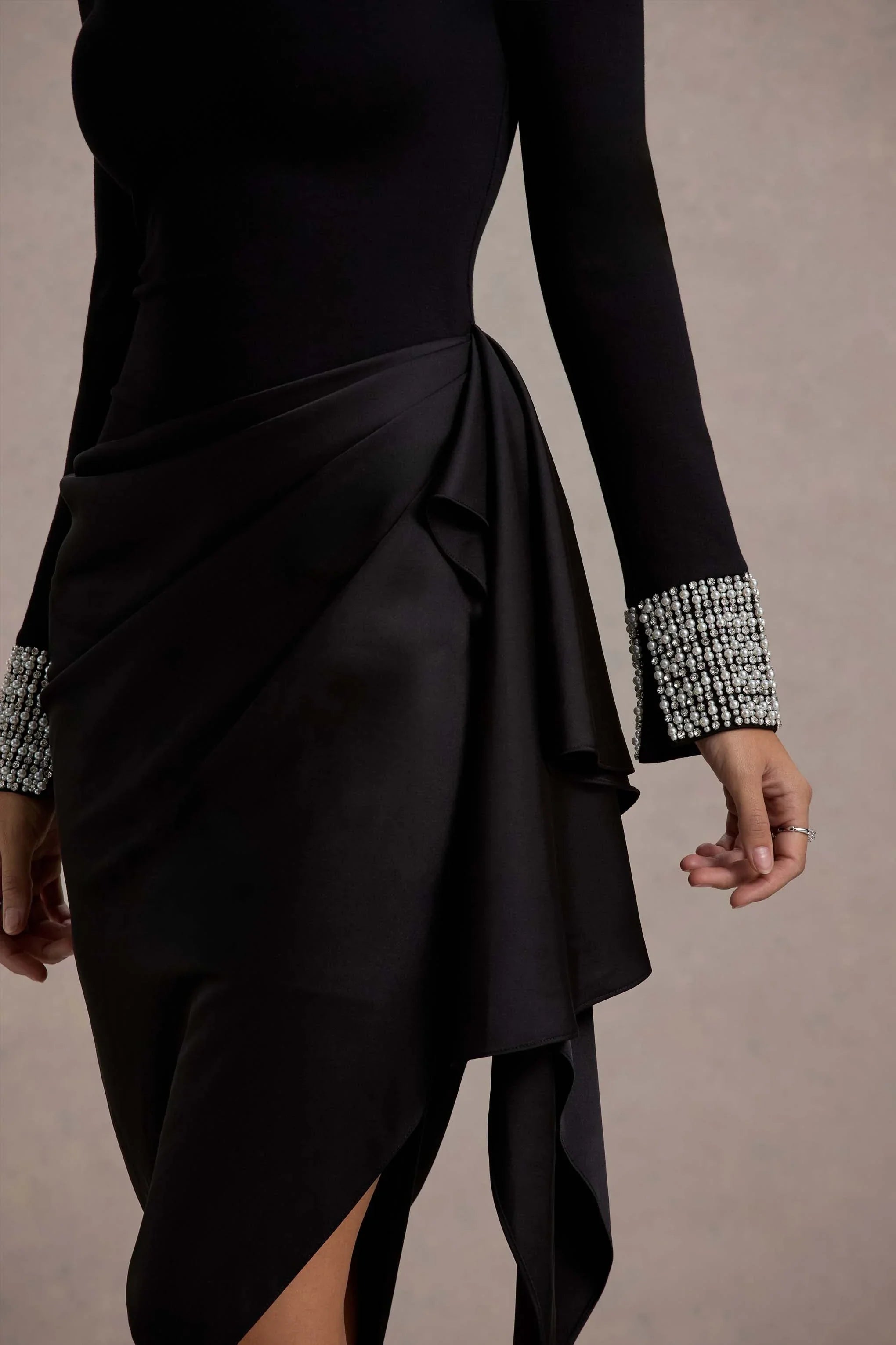 A midi made for magical nights, say hello to Luanna. Adorned with artful asymmetry, this black midi dress boasts a fitted bodice, long sleeves and embellished cuffs that effortlessly catch the light. Complete with a fluid satin skirt that drapes over your silhouette, whats not to love with Luanna?