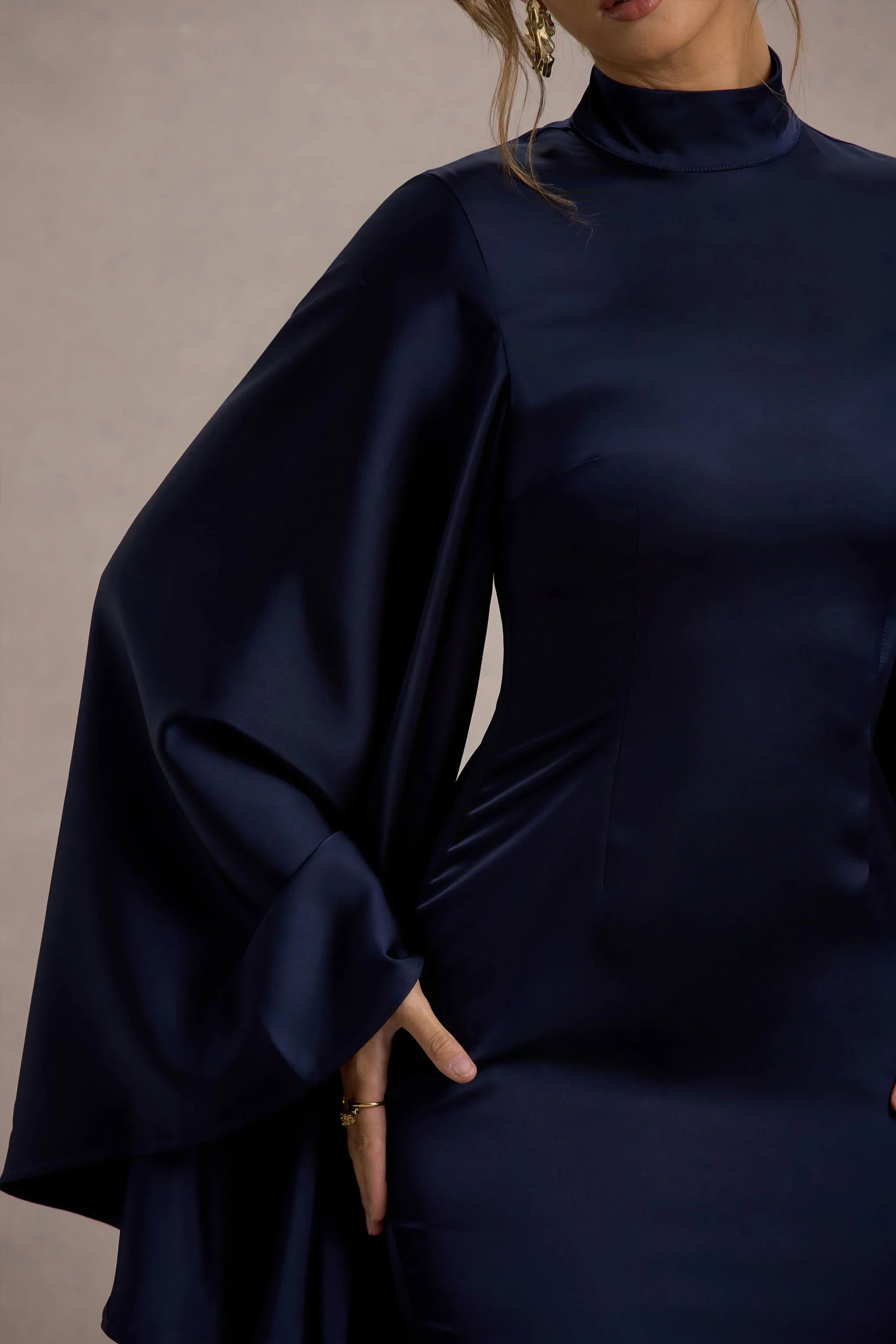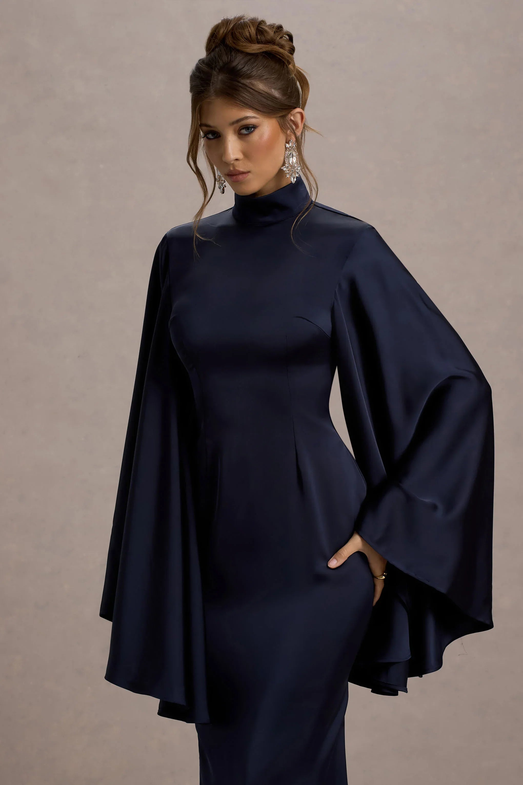 Billowy and ethereal, Maceline is an elegant addition to every wardrobe. Carefully crafted in a silky navy satin, this floor-sweeper boasts a demure high neckline and flowing cape sleeves. Compliment yours with a sleek bun to show off all Maceline has to offer.