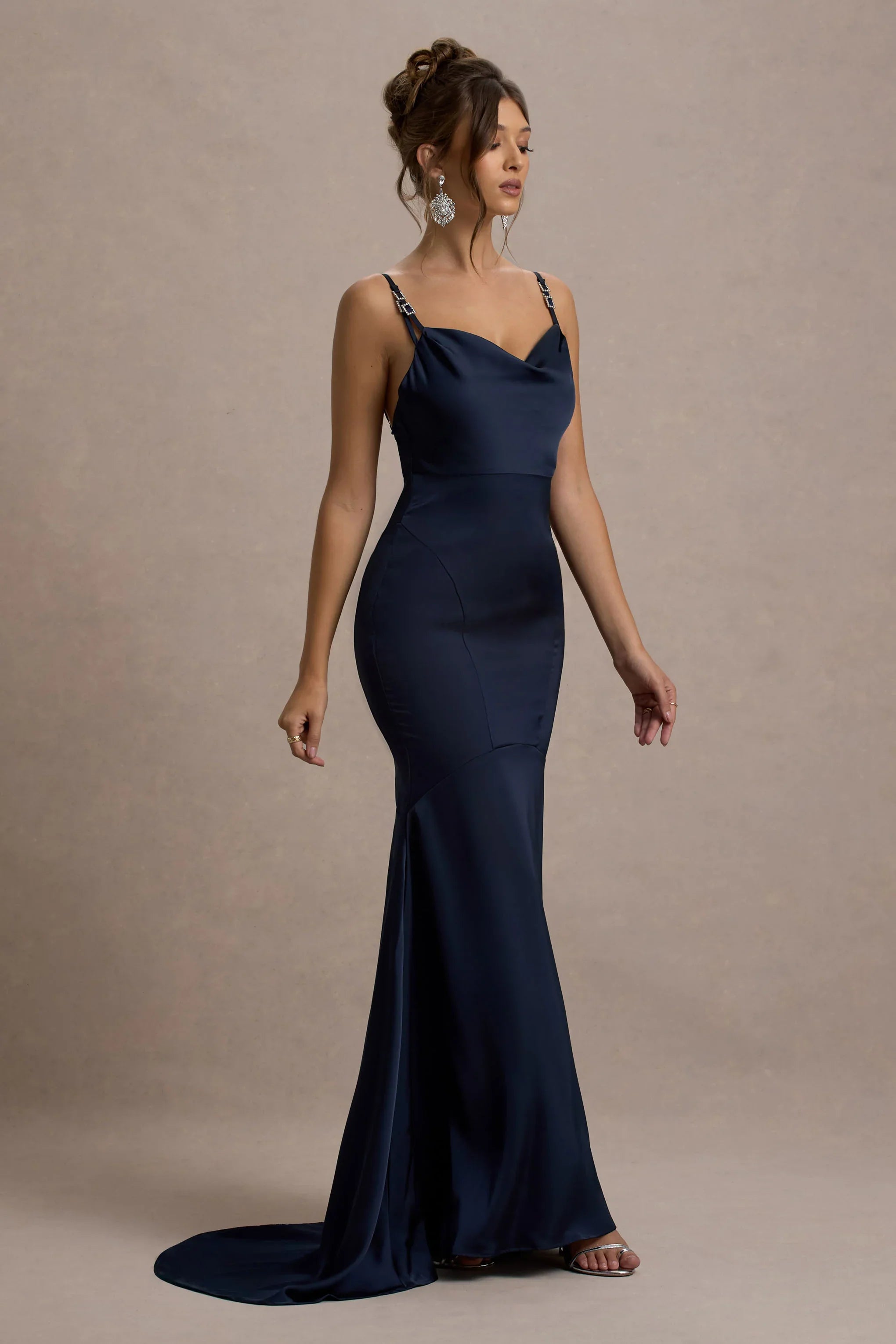 Our latest navy floor-sweeper Made With Love has been carefully crafted in a premium stretch satin to fit you like a glove. This maxi is detailed by its cowl neckline, held up by diamante decorated cami straps that continue into an ultra-flattering open-back. Try styling this fishtail dress with a pair of strappy stilettos for the perfect prom ensemble.