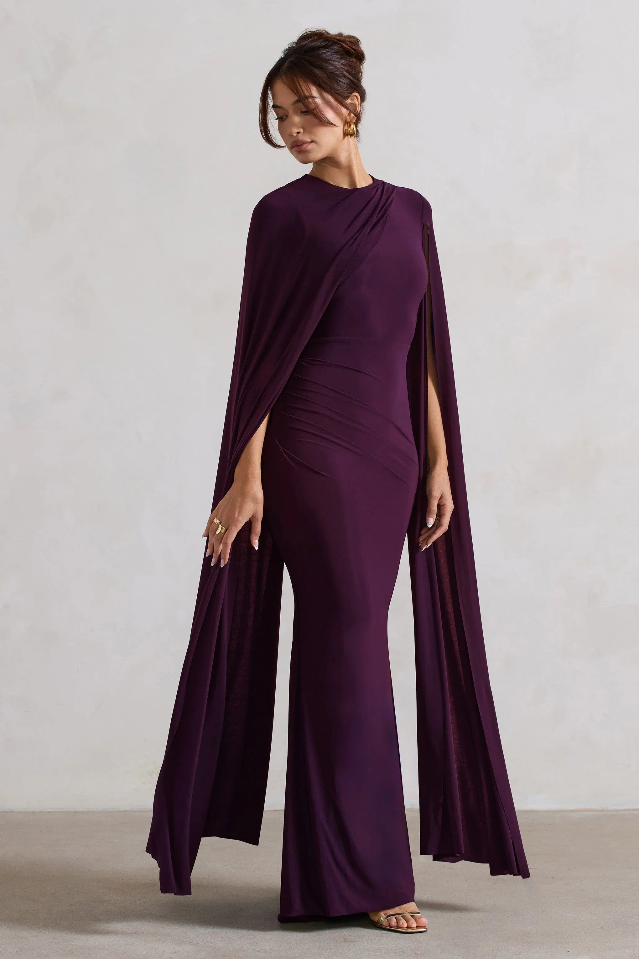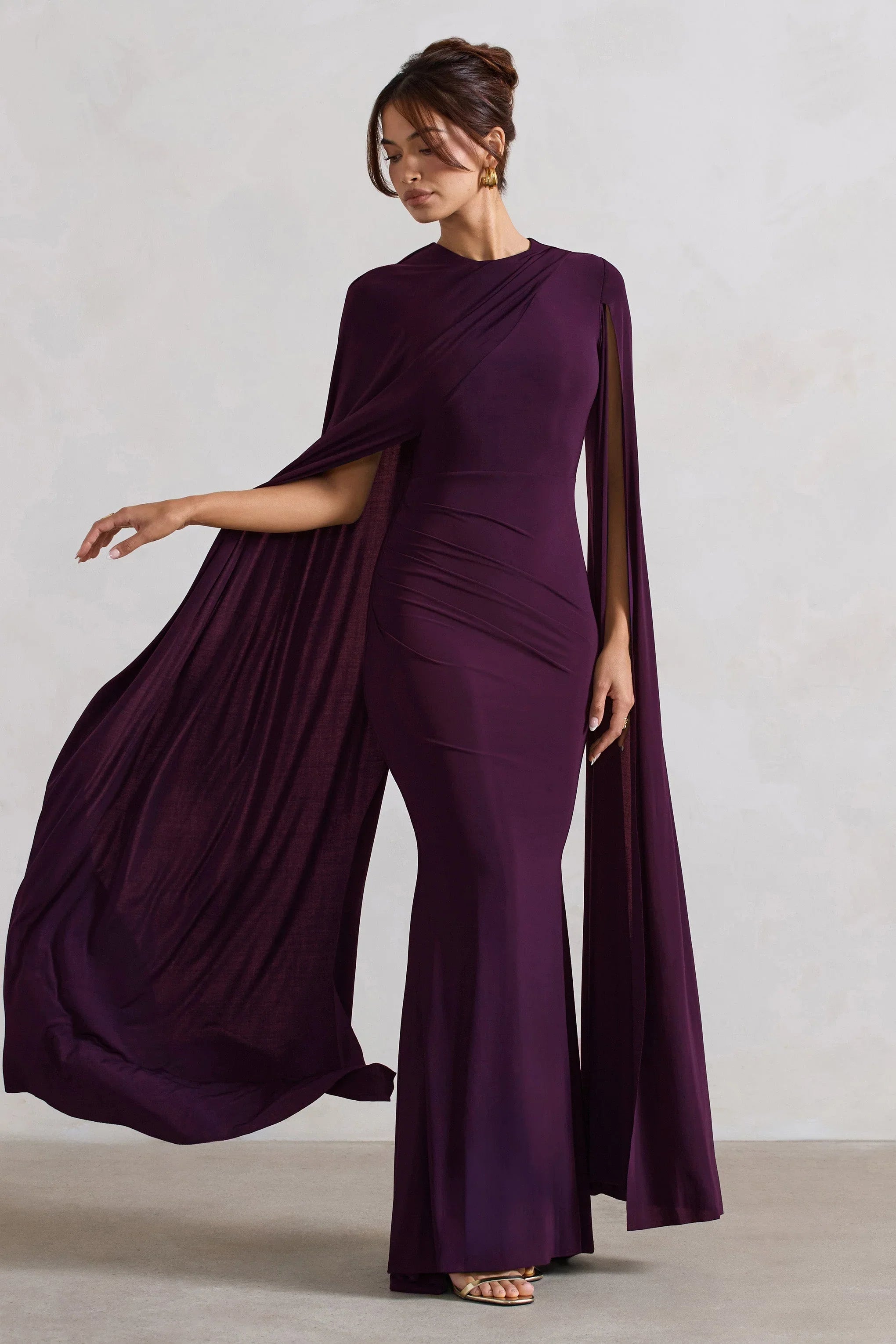 Defined by an extravagant asymmetric cape, Magdelena is a sophisticated option for your next black tie wedding or race day event. Crafted in our signature stretch jersey, this plum maxi dress features a high neckline and gathered waist before falling into an elegant floor sweeping skirt.