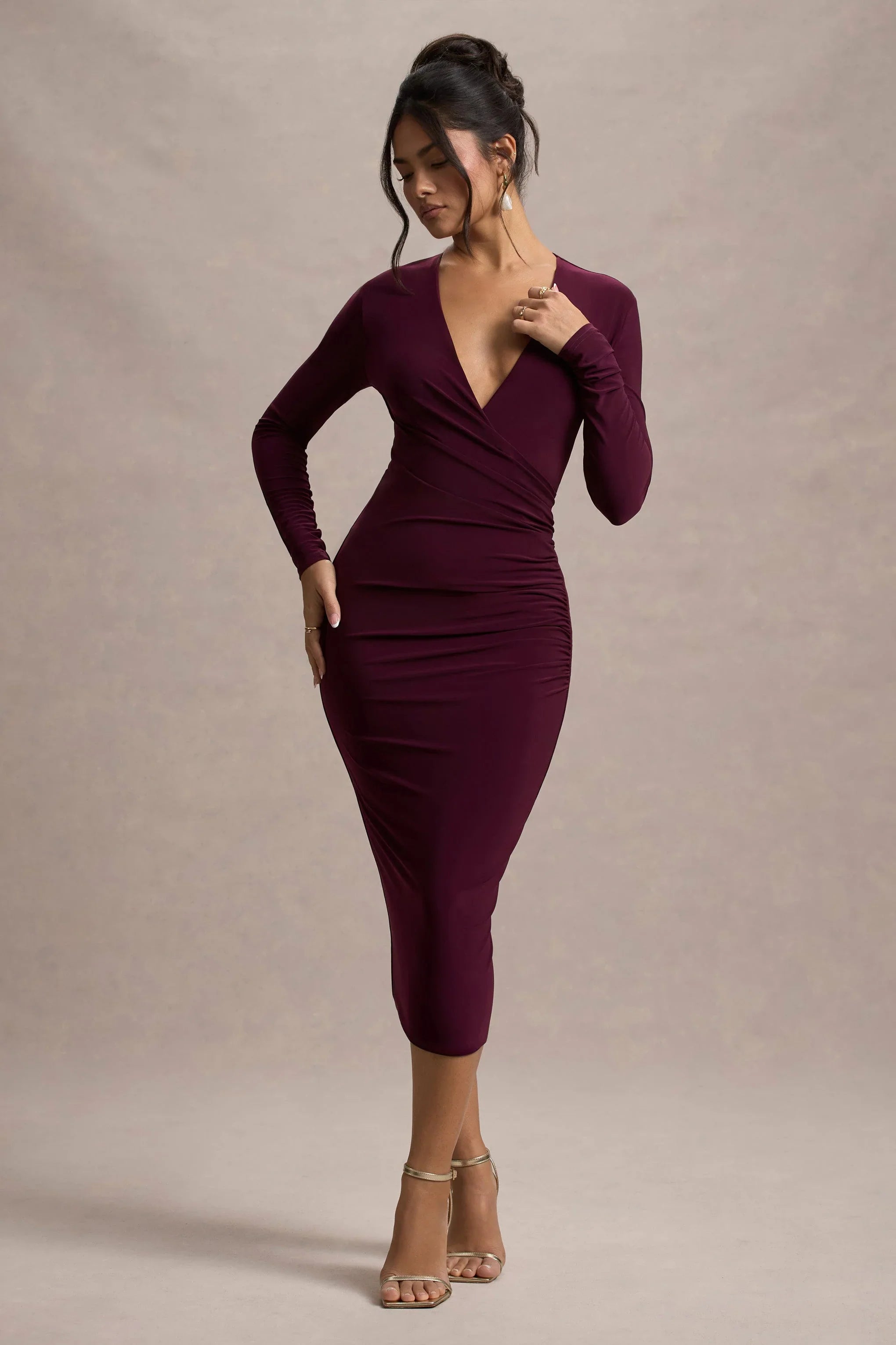 Every wardrobe needs a sculpting staple like Marcia. Crafted in a port shade of our premium stretch jersey, this bodycon midi features a plunge neckline, gathered waist and long sleeves. For a sophisticated evening look, try styling Marcia with a sleek bun and gold accents.