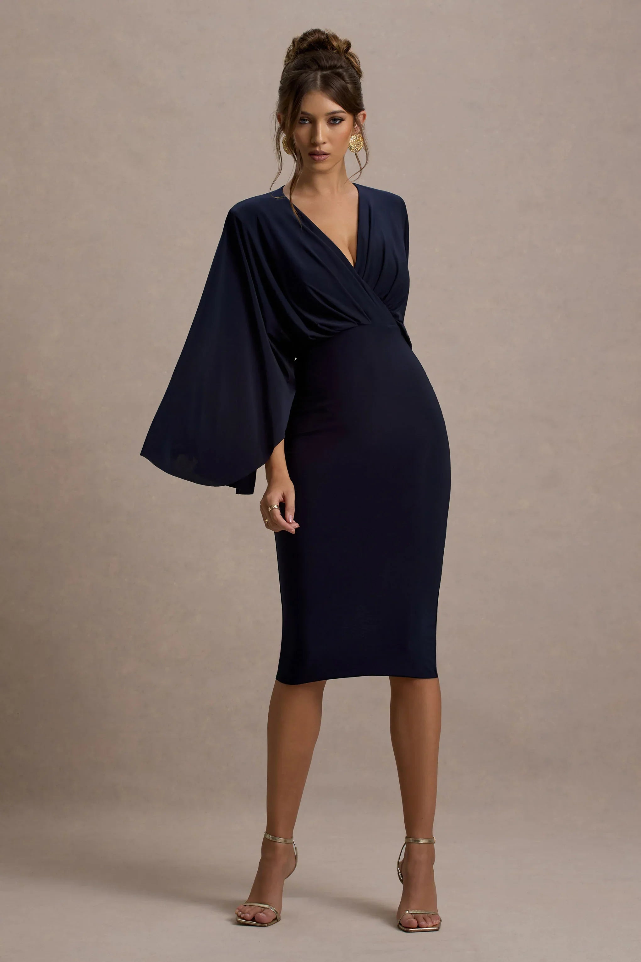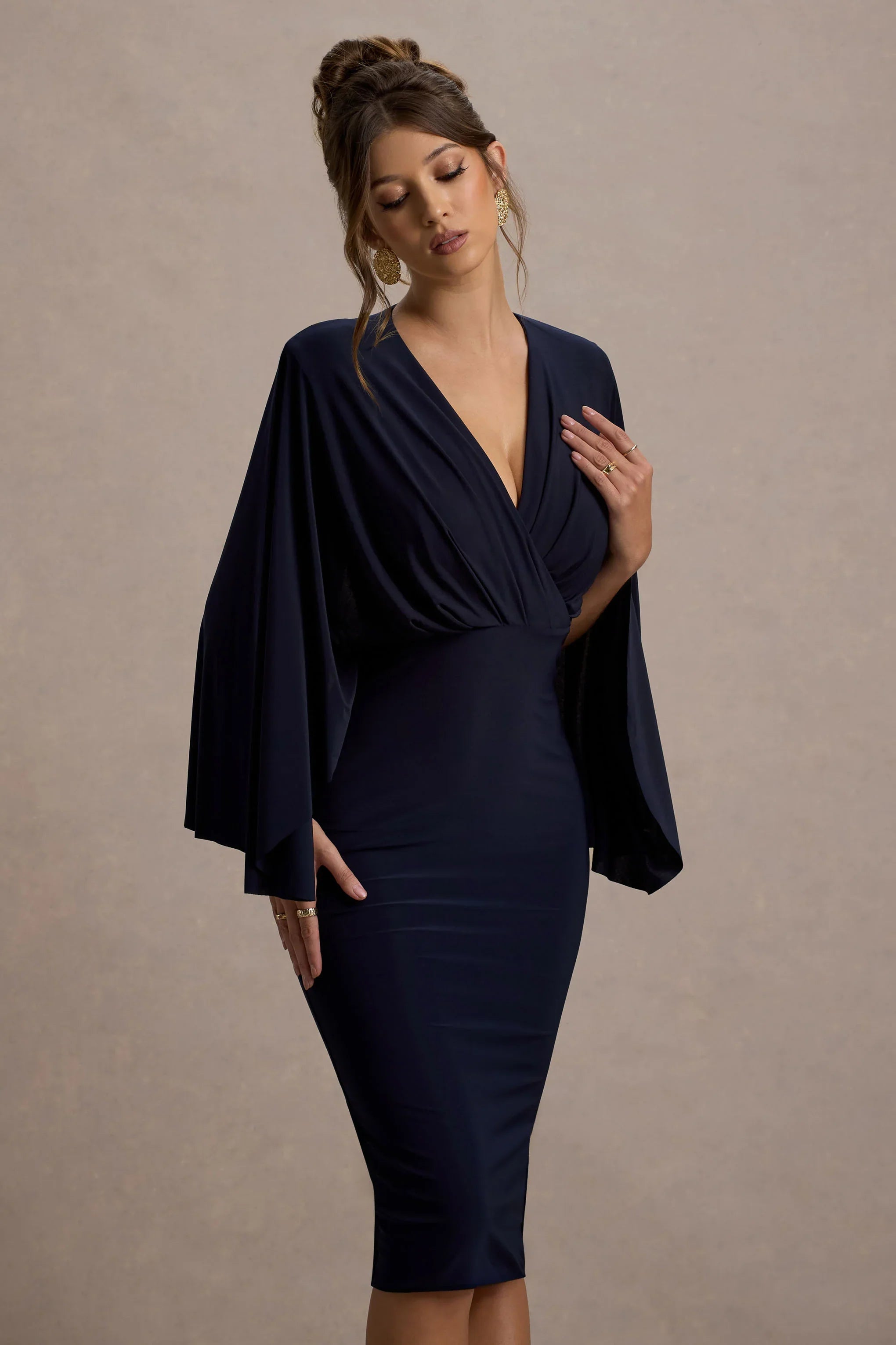 A classic silhouette with a bit of drama, say hello to Mishka. Carefully cut in our premium stretch jersey in a deep navy, this midi features a draped plunge neckline that leads into cape sleeves that flow delicately down the back. For the perfect day to night look, style Mishka with some gold accents and court heels.