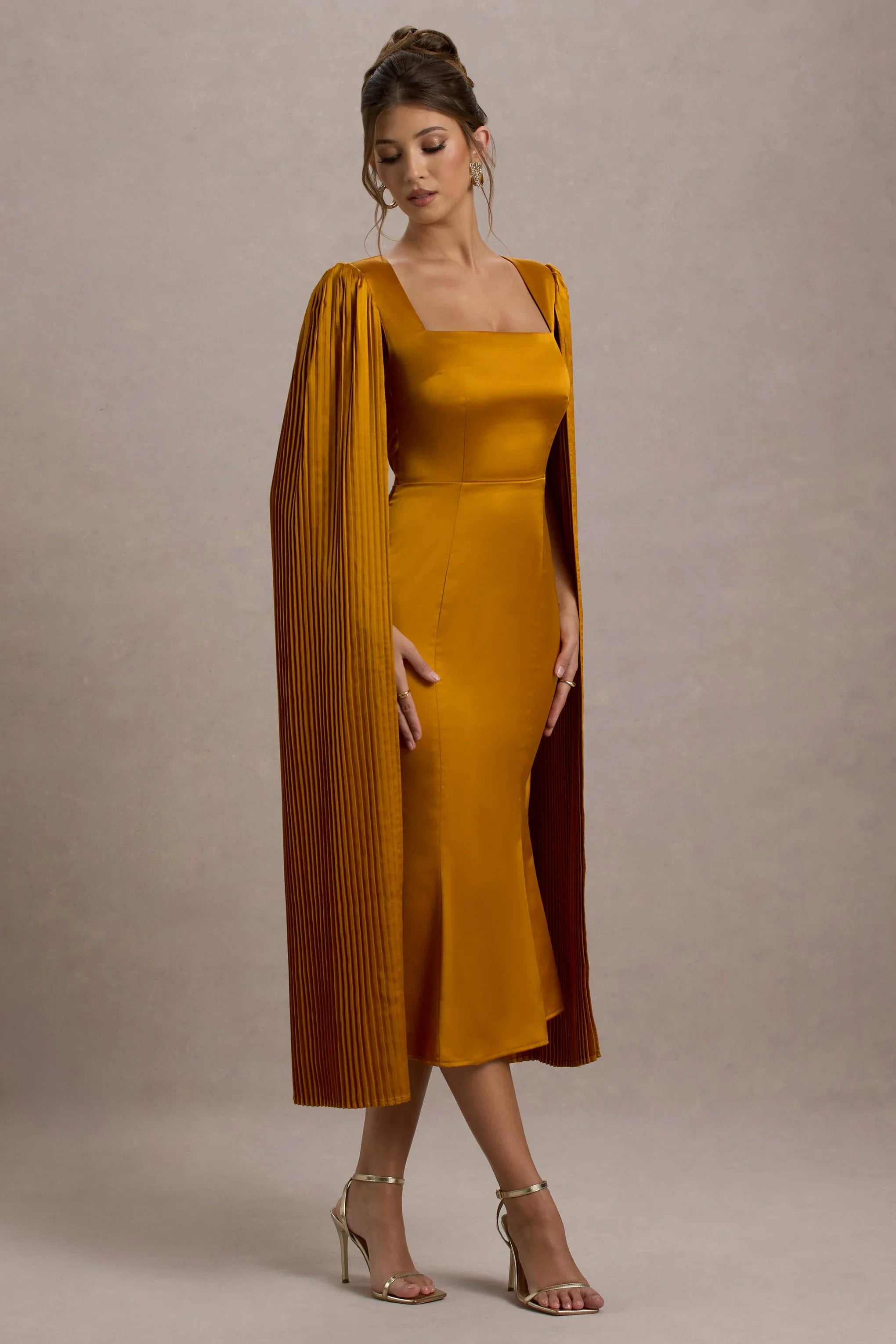 If sophistication was a dress, Nalda would be it. Crafted in a deep mustard hue of our premium satin, this timeless midi dress is detailed by a flattering square neckline, pleated cape sleeves and elegant flute hem. For the perfect wedding guest ensemble, style yours with some bouncy curls and earrings like Glint.