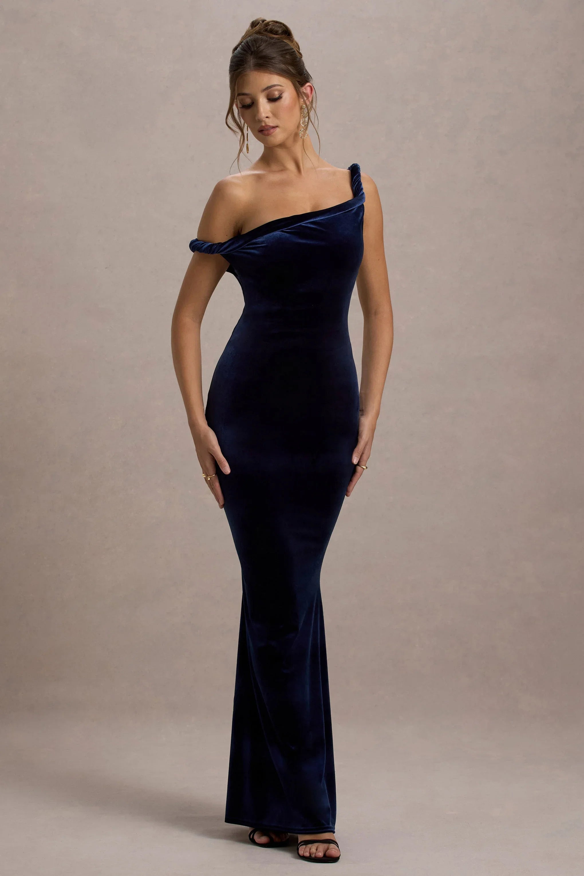 Defined by its luxurious fabric and bold design, Neeka is an unforgettable option for your most glamorous occasions. Crafted from our rich navy velvet, this asymmetric maxi dress features a twisted front detail that effortlessly sculpts your silhouette, while the thigh-high split adds just the right amount of drama. The sumptuous velvet creates a striking, curve-hugging fit, and the unique asymmetric hemline ensures you stand out from the crowd. Keep Neeka at the forefront of your look by pairing it with sleek, pointed heels and delicate jewelry.