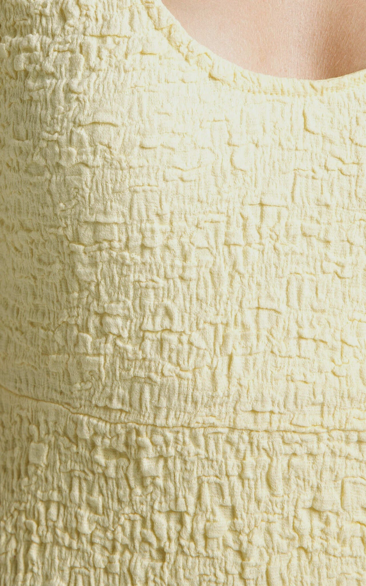 Get ready to turn heads in the Novida Midaxi Dress! This textured bodycon dress in butter yellow is a must-have for your wardrobe. Made from soft jersey rayon, this dress is not only comfortable but also incredibly flattering with its fitted silhouette. The V-neckline adds a touch of femininity, while the midi length and sleeveless design make it perfect for both casual day outings and dressed-up occasions. Whether you're going out with friends or attending a summer event, this basic dress will make you feel confident and empowered. So why wait? Add a pop of sunshine to your style with the Novida Midaxi Dress today!