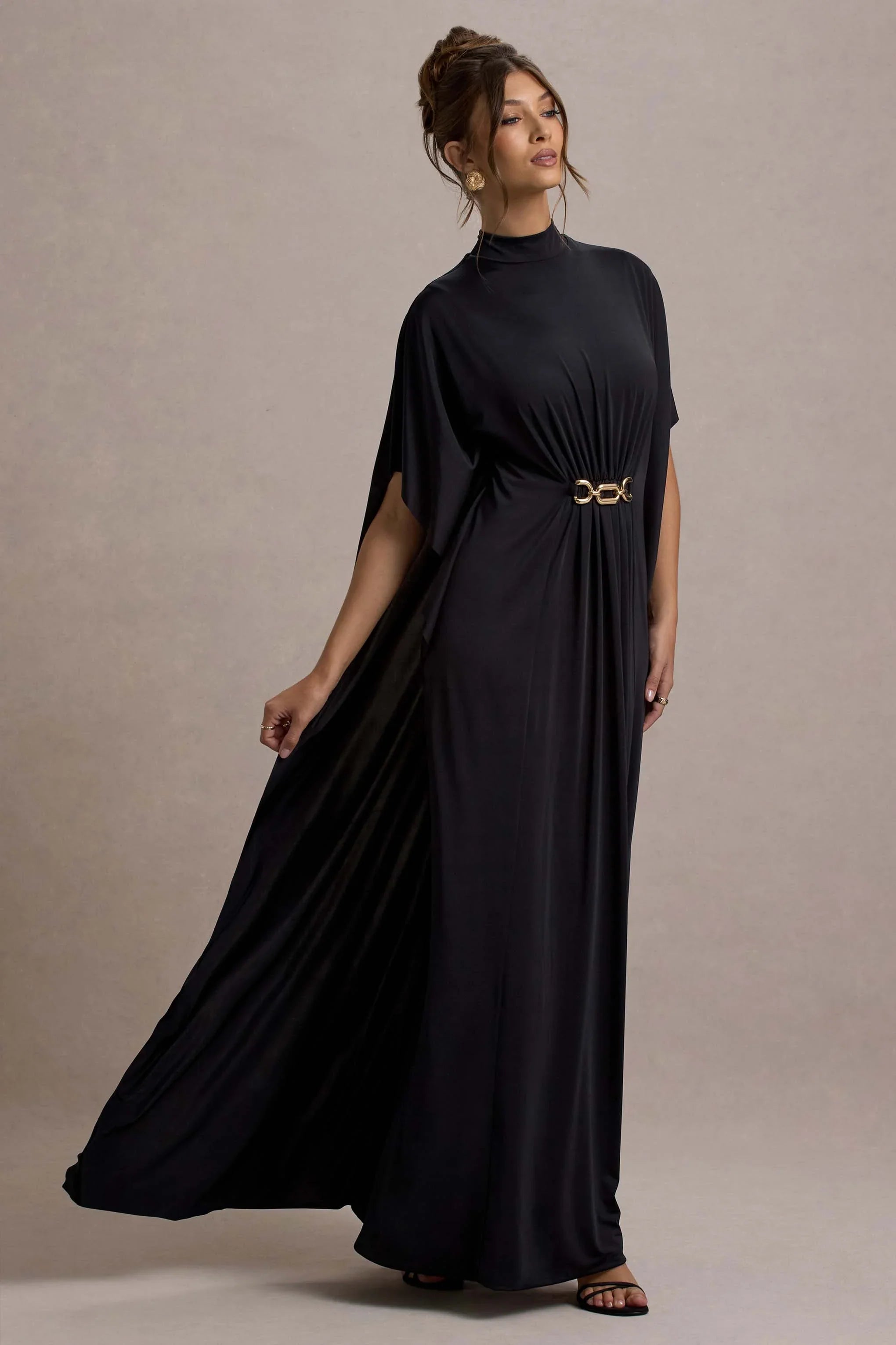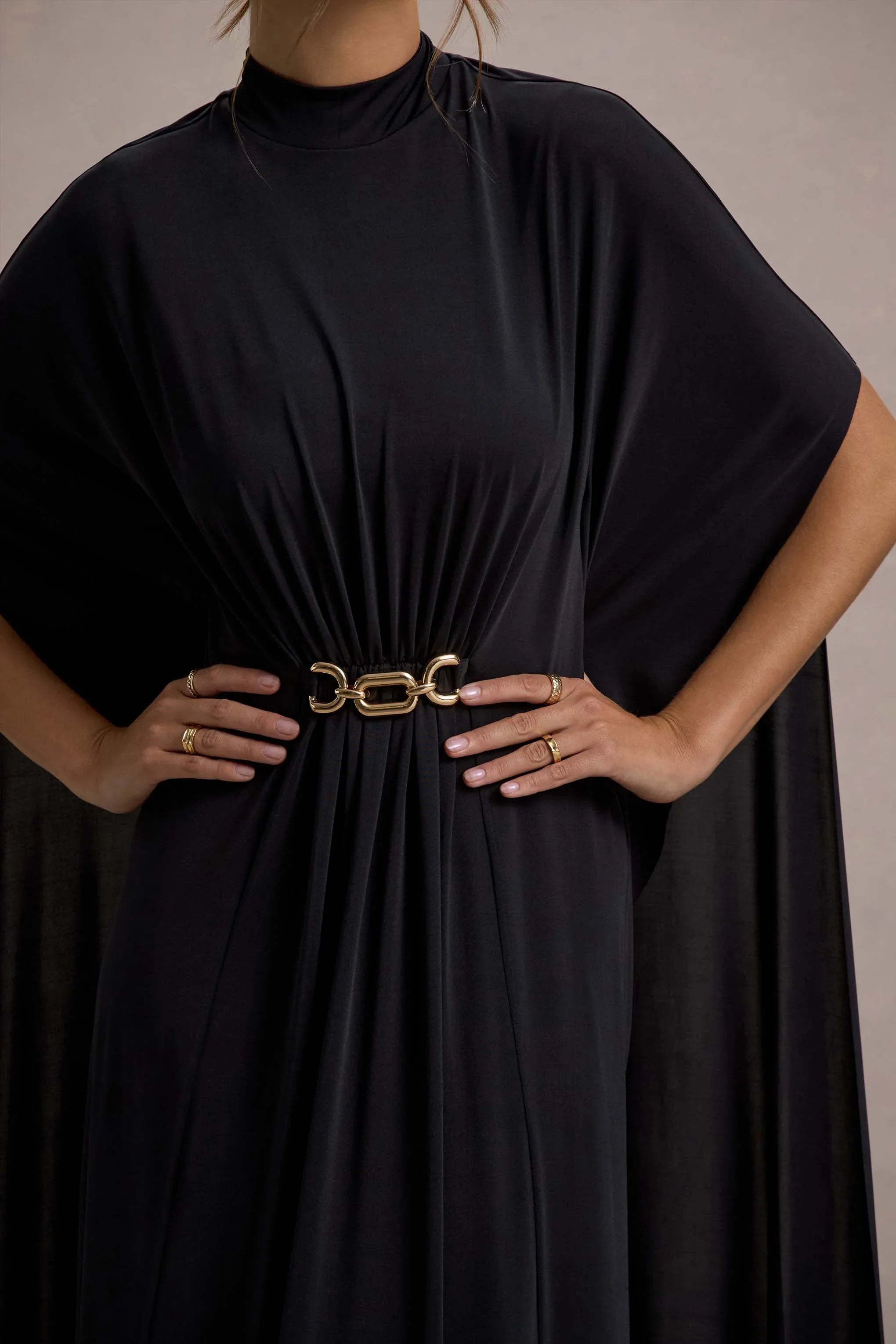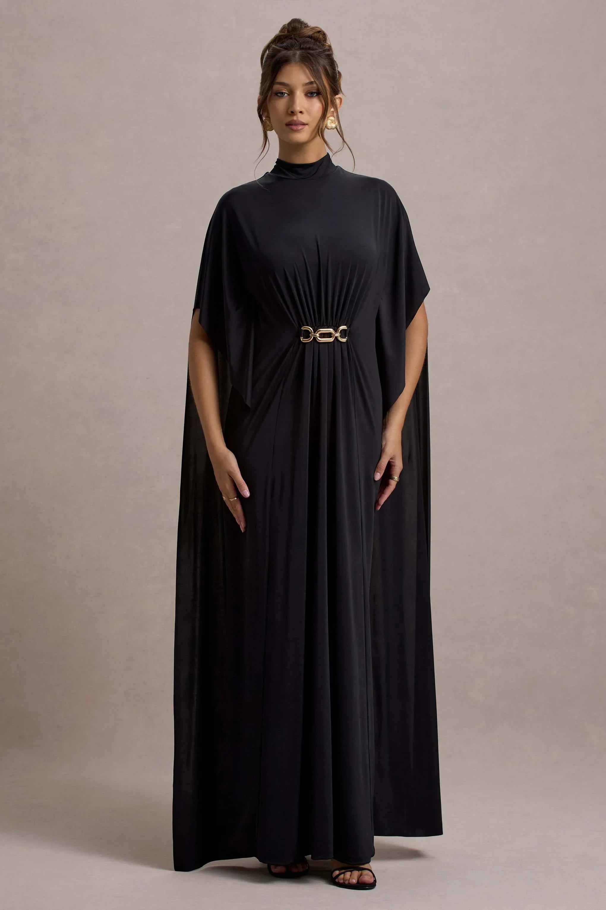 Defined by its flowing silhouette and dramatic details, Olessia is a striking option for your next special occasion. Crafted from our premium disco jersey, this black maxi dress features gathered cape sleeves that add a bold, elegant touch. The belted waist cinches your figure, enhancing the fluid design for a flattering fit. Perfect for evening events or formal affairs, keep Olessia in focus with sleek accessories and strappy heels for a look that effortlessly combines sophistication and drama.