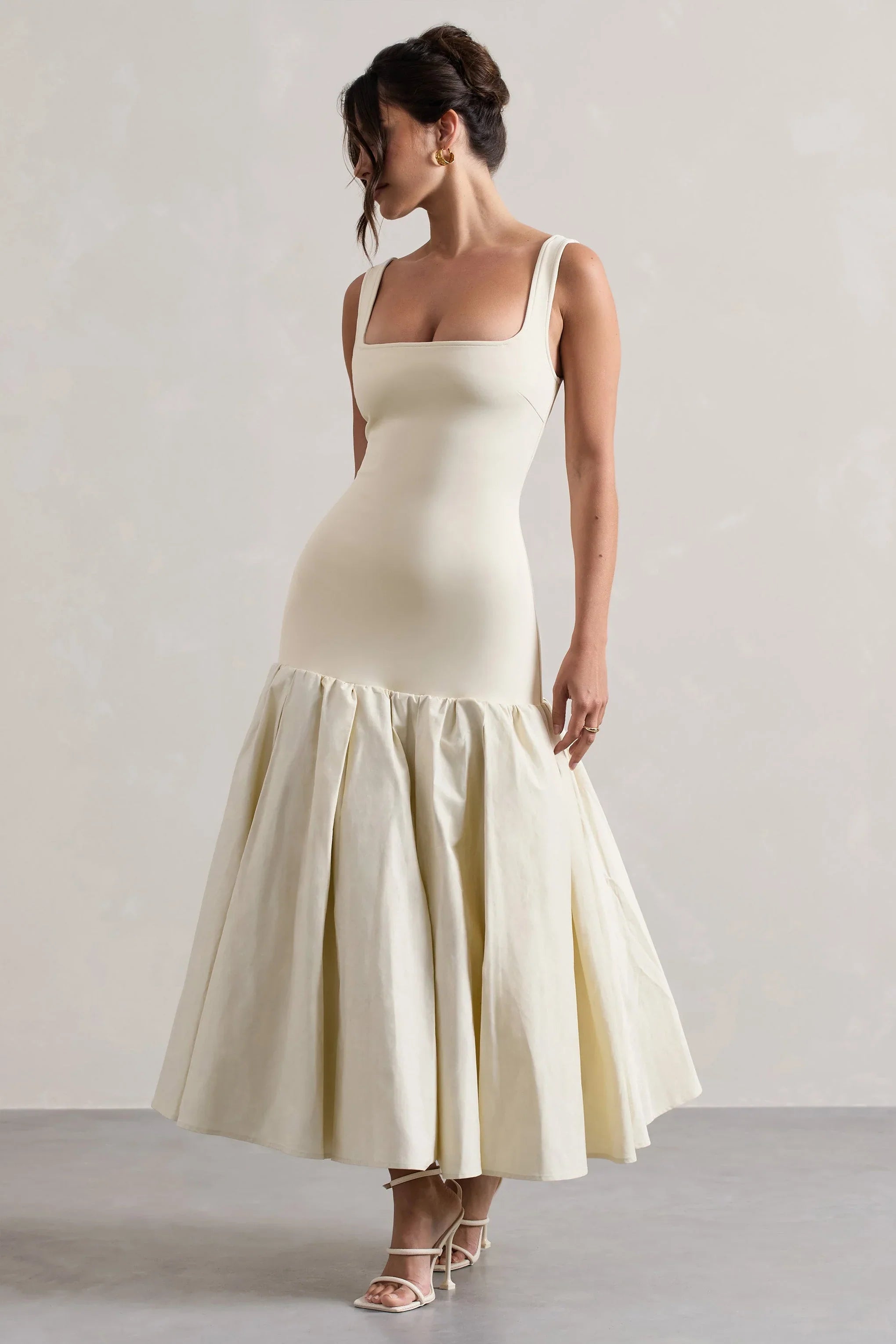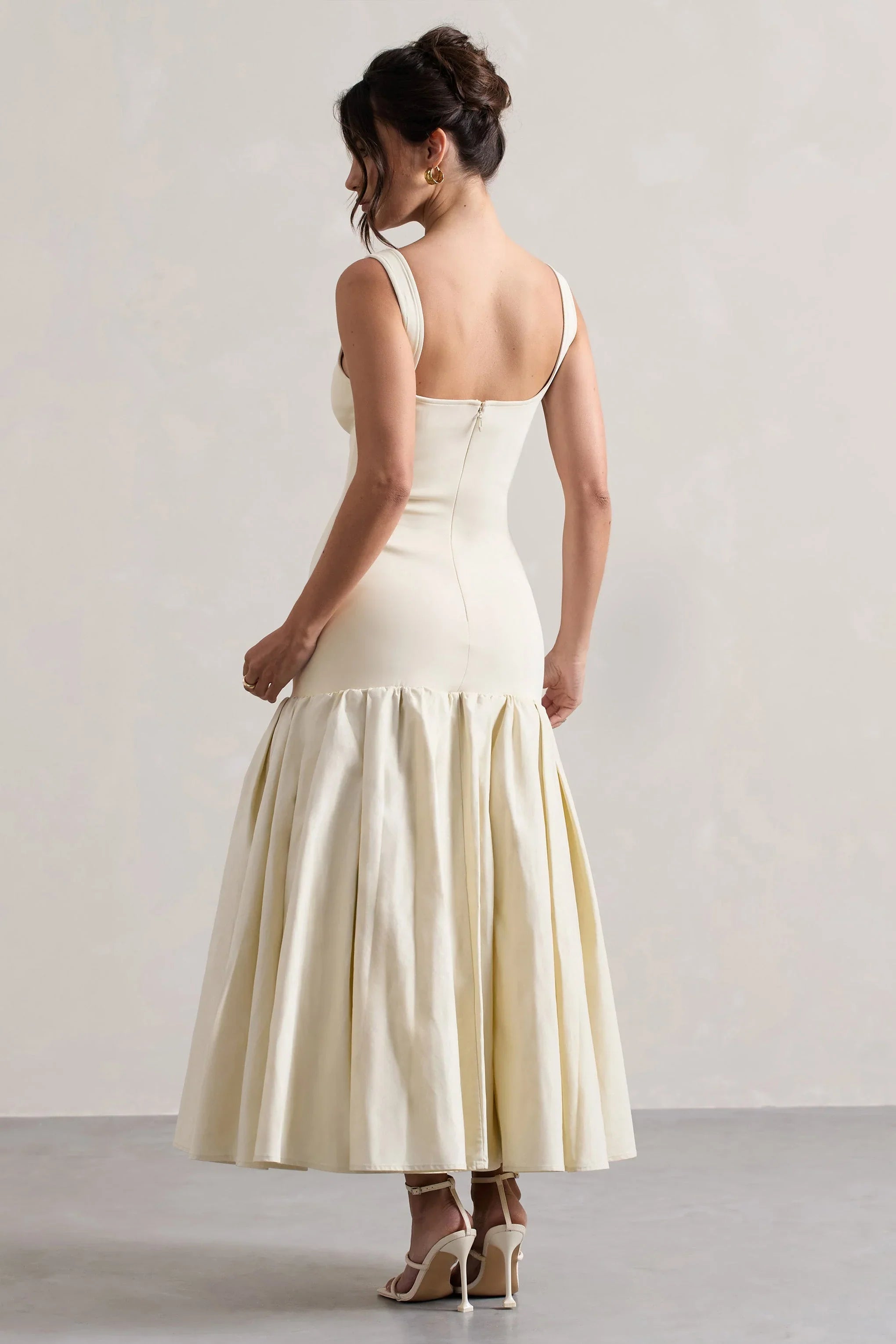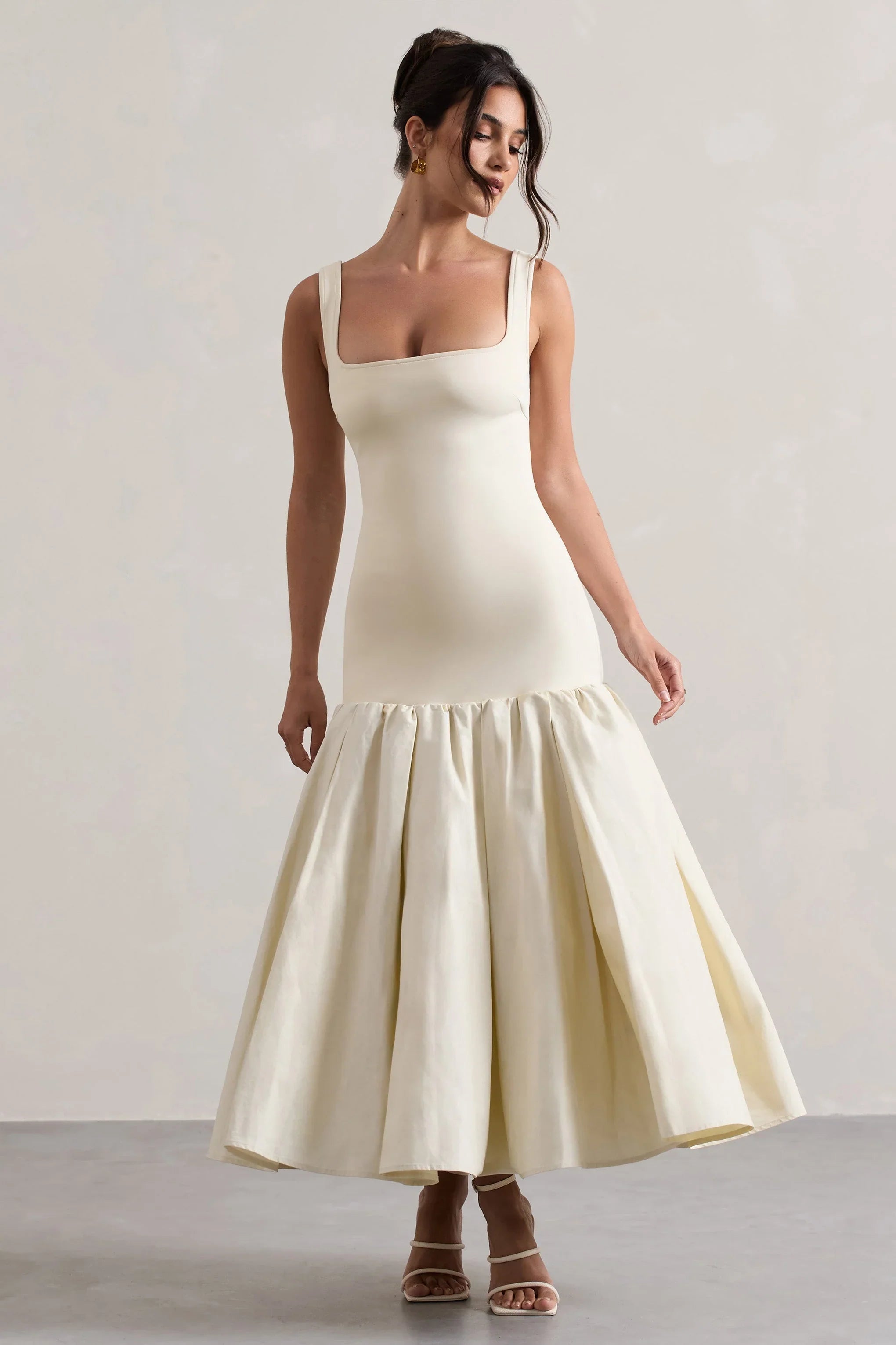 If you're looking for a make an entrance dress Parida is the one. Crafted in a flattering jersey in a elegant cream this maxi is detailed with a scoop neck and voluminous peplum hem creating dimension and drama. Parida showcases a glamorous sophisticated silhouette perfectly styled with some strappy stilettos for your next event.