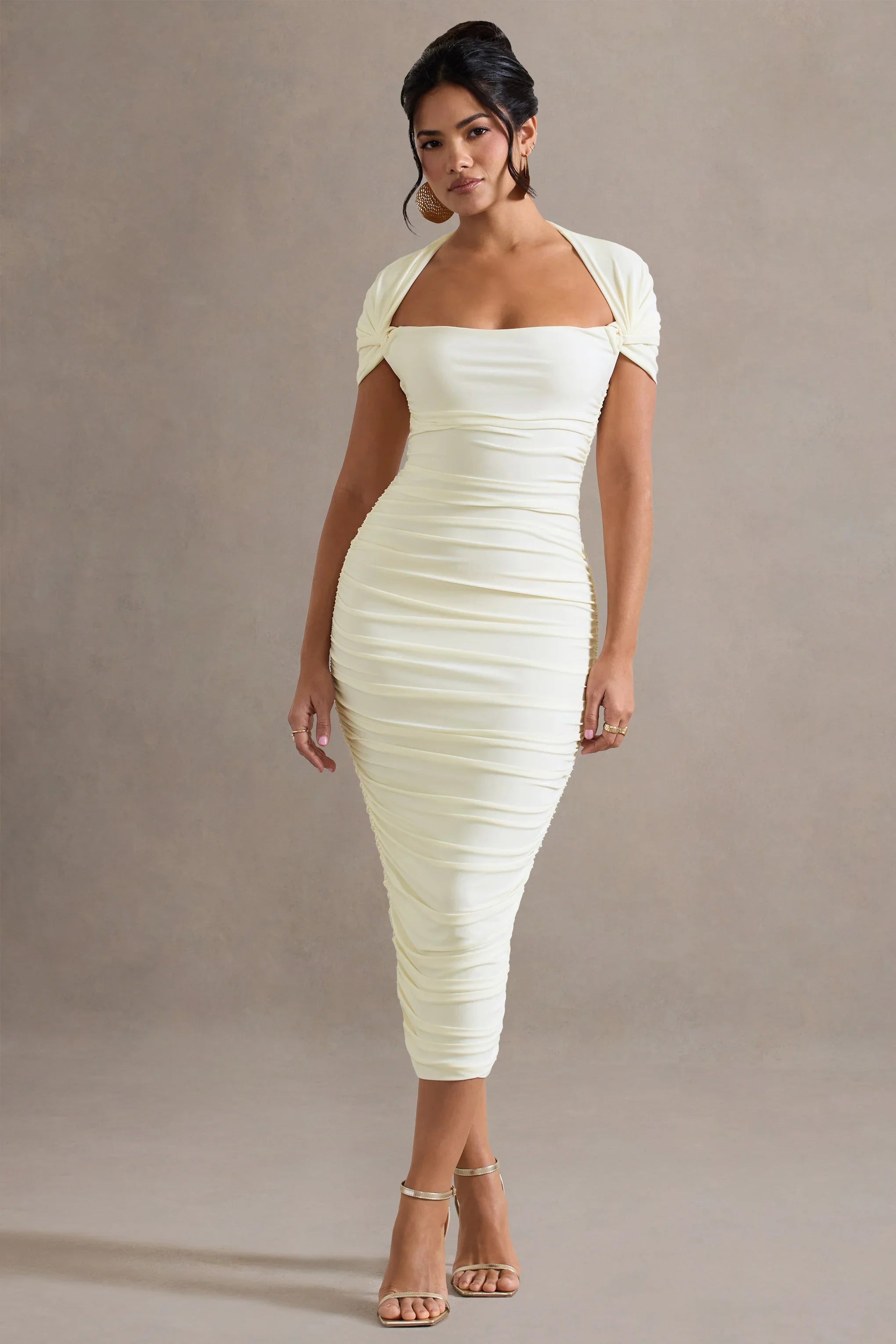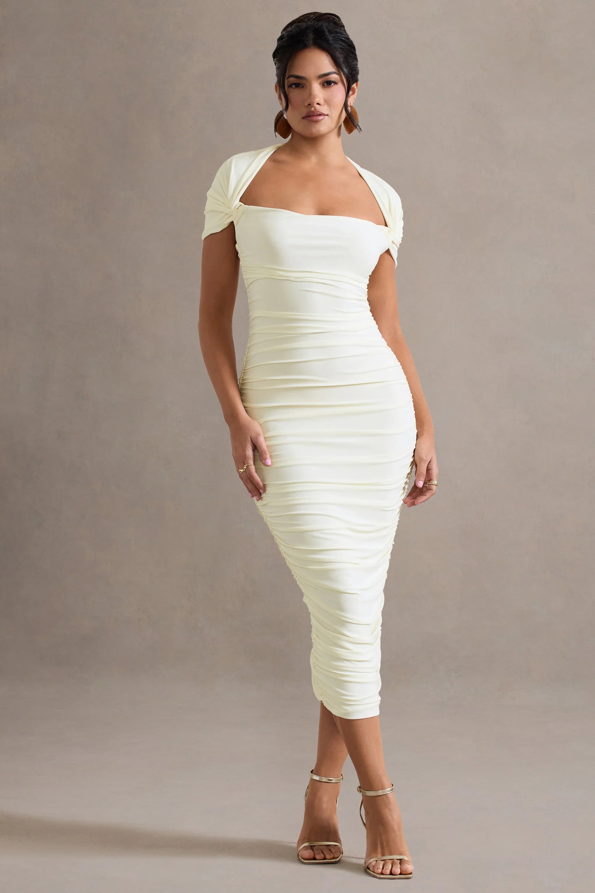 Every wardrobe needs a ruched midi dress and Paxos is the perfect choice. Expertly cut in an ecru shade of our signature stretch jersey, with ruching to sculpt your figure. Paxos is detailed with short twisted sleeves and would look stunning styled with a tousled bun and some gold accents.