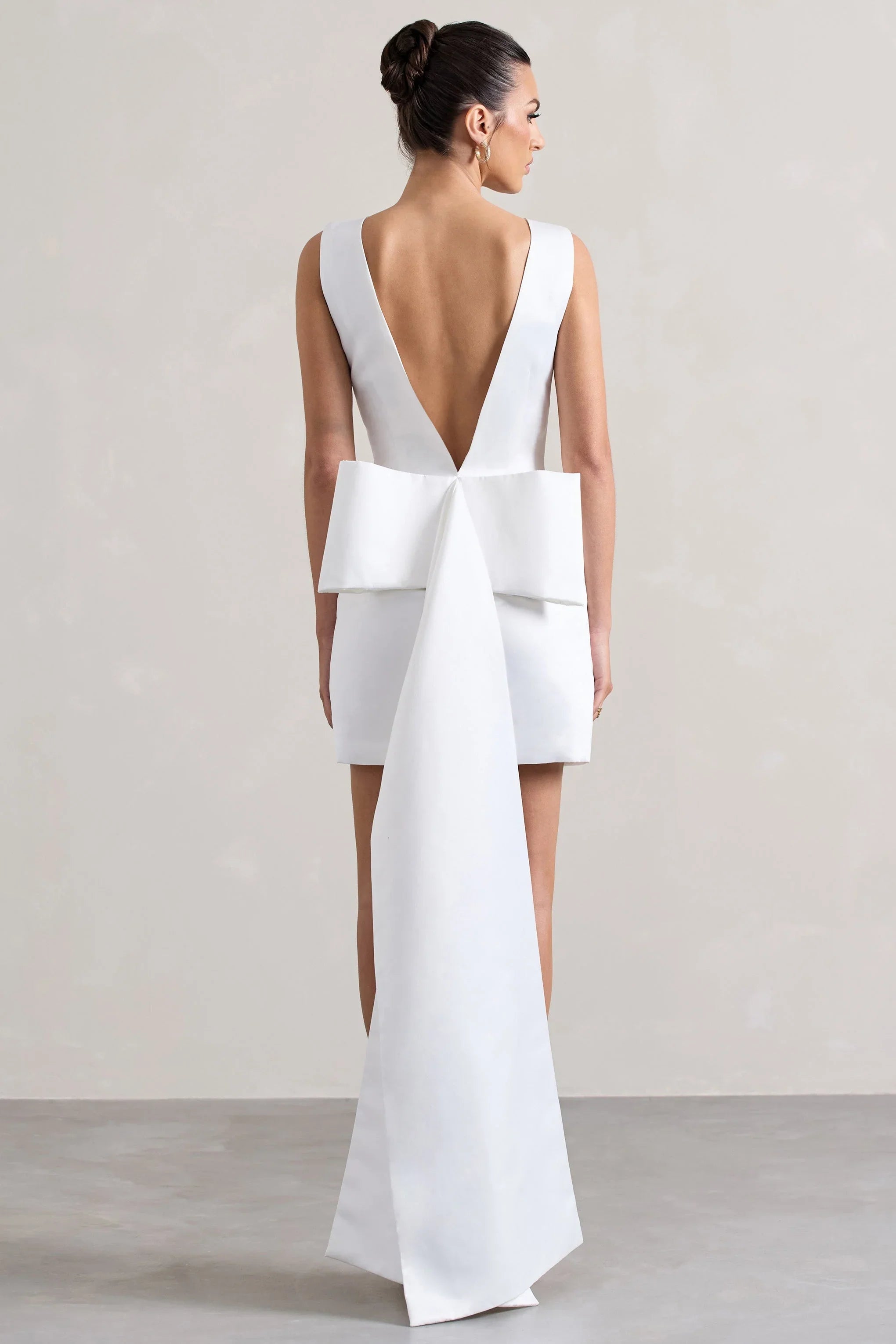 You're a gift, so you should dress like it. Peace arrives in an angelic white shade of our shimmering satin, boasting a tantalising plunge back and eye-catching draped bow. For the perfect birthday girl ensemble, elevate this white mini dress with a pair of heels like Flashing Lights.