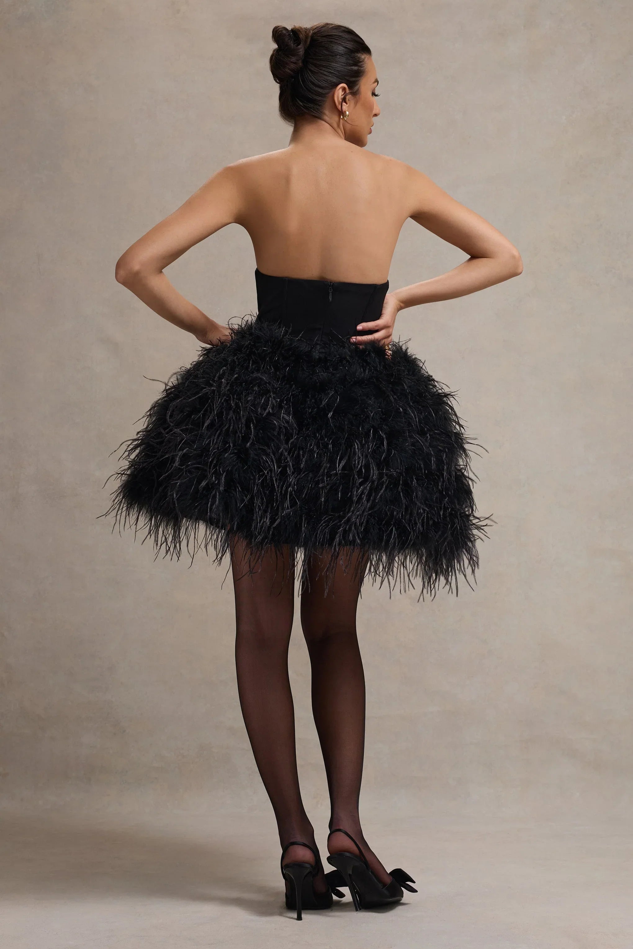 Party season calls for a statement mini like Peaches. Designed in a premium black crepe, this enchanting LBD sculpts your silhouette through a boned corset bodice and structured strapless neckline. Complete with a voluminous feather skirt, steal the spotlight in Peaches.