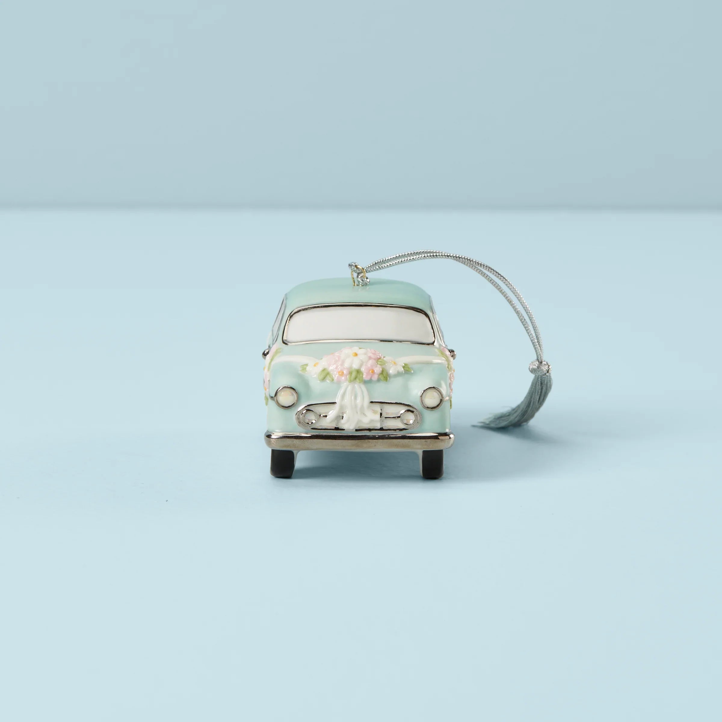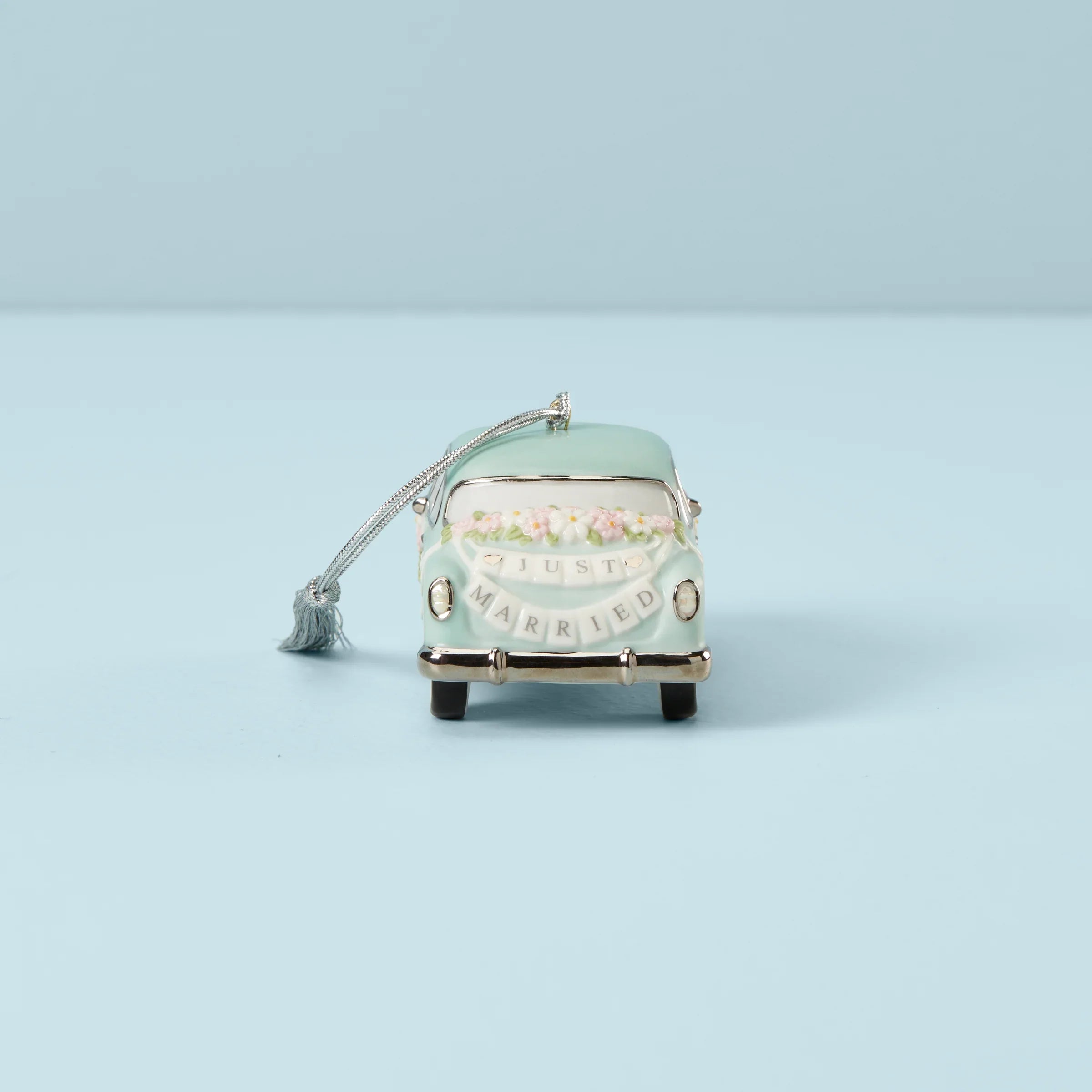 Celebrate your big day with this sweet, retro-inspired ornament. This pretty vintage car is decorated for a just-married couple! Personalize this ornament with your names and date to make it even more special. A perfect gift for newlyweds.
