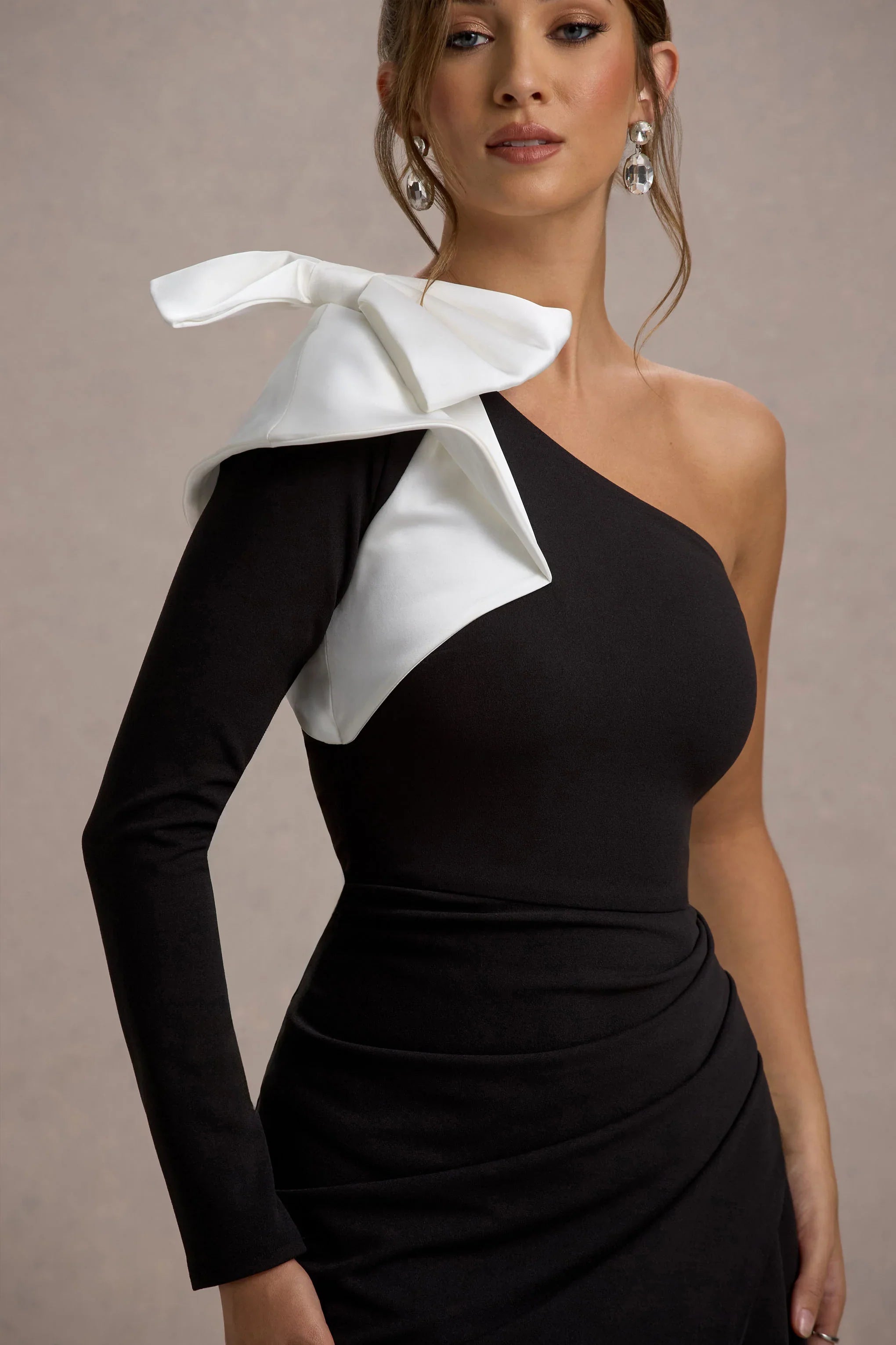 Philomena is a show-stopping choice defined by its bold, refined details, perfect for your next special event. Crafted from our premium crepe and satin, this black one-sleeve maxi dress features a striking white bow detail on the shoulder, adding a touch of elegance to its sleek silhouette. The high leg split enhances the drama, offering a glimpse of skin with every step. Style Philomena with minimalist heels and sleek accessories to let its sophisticated design take centre stage at your next occasion.