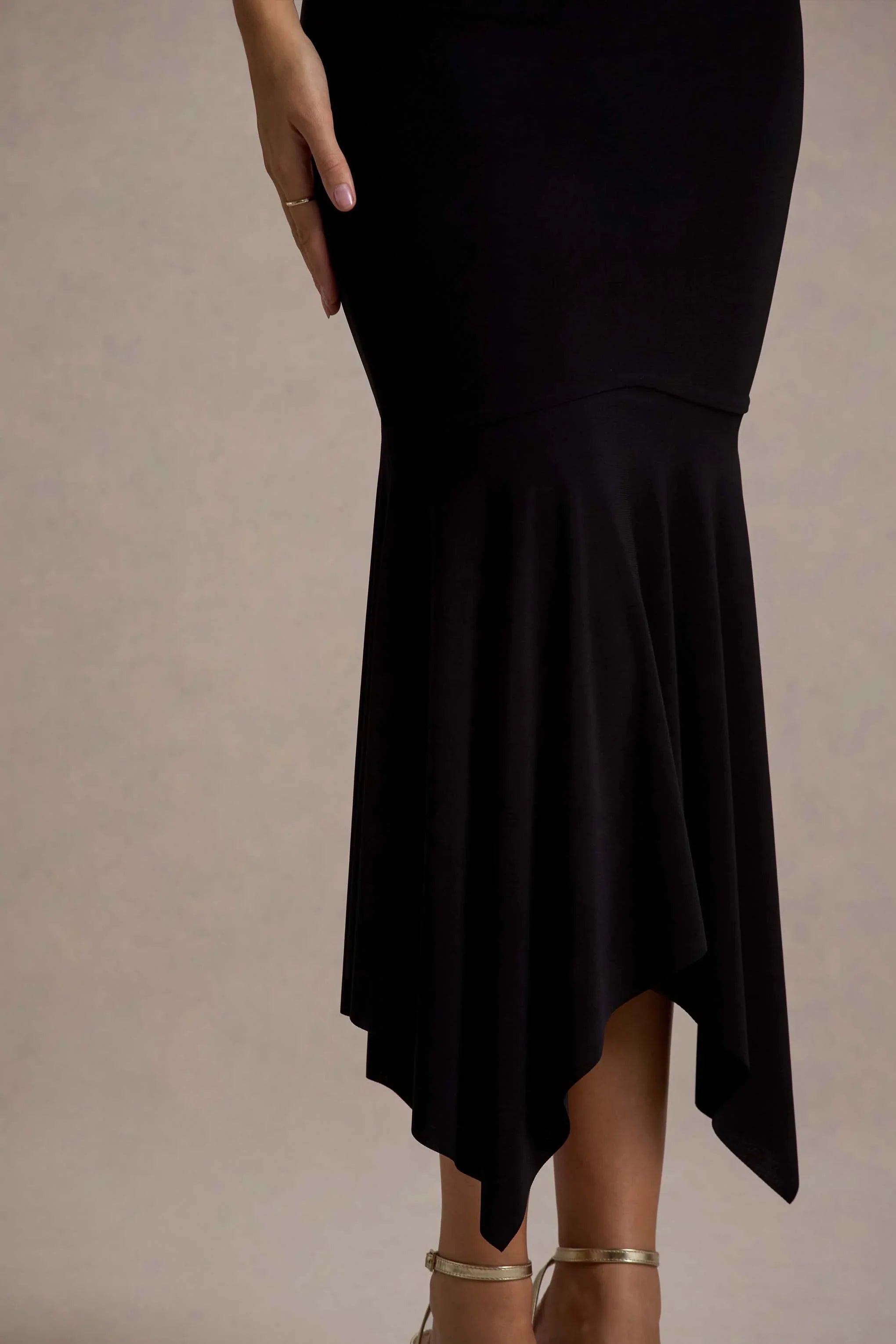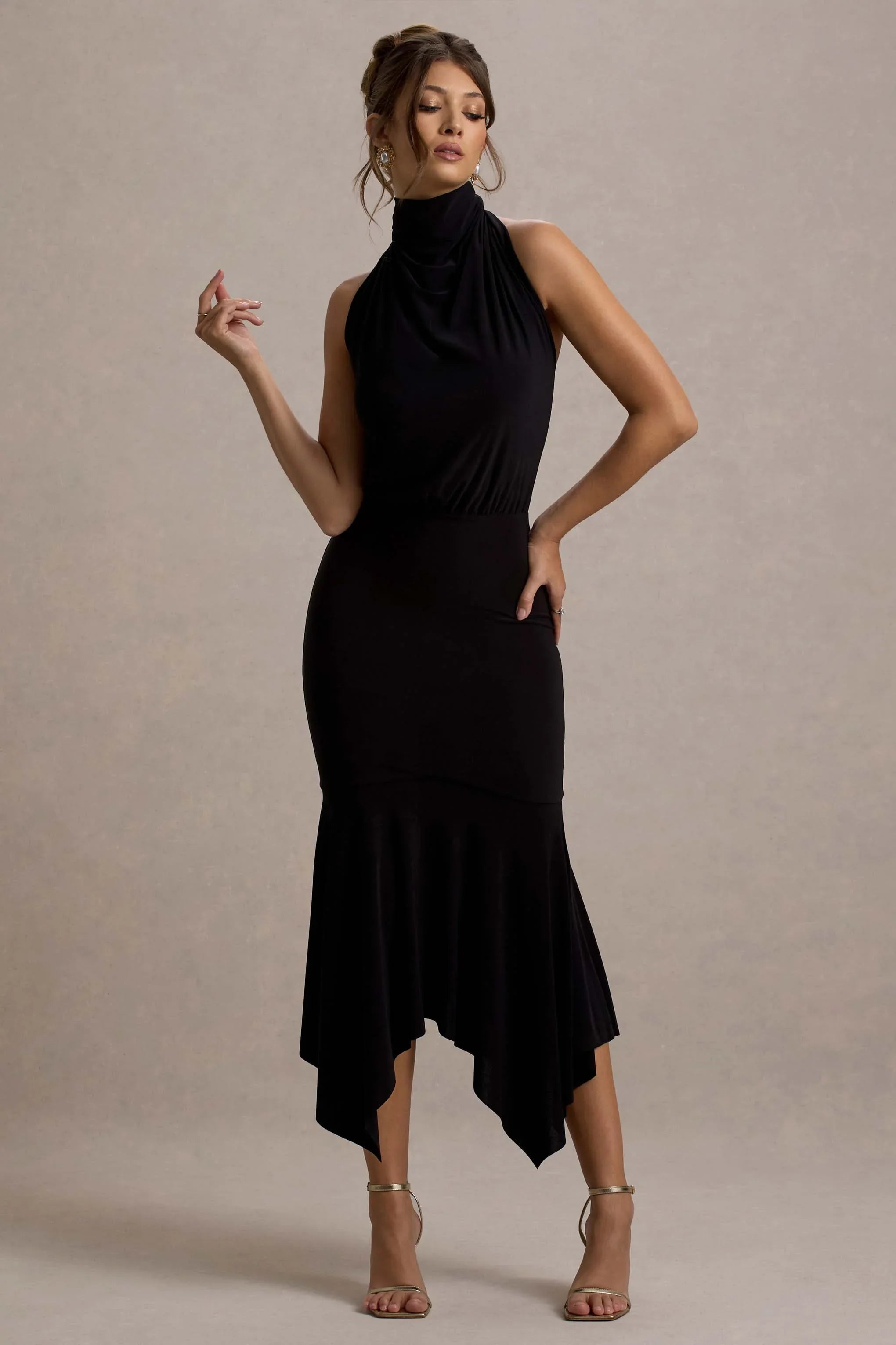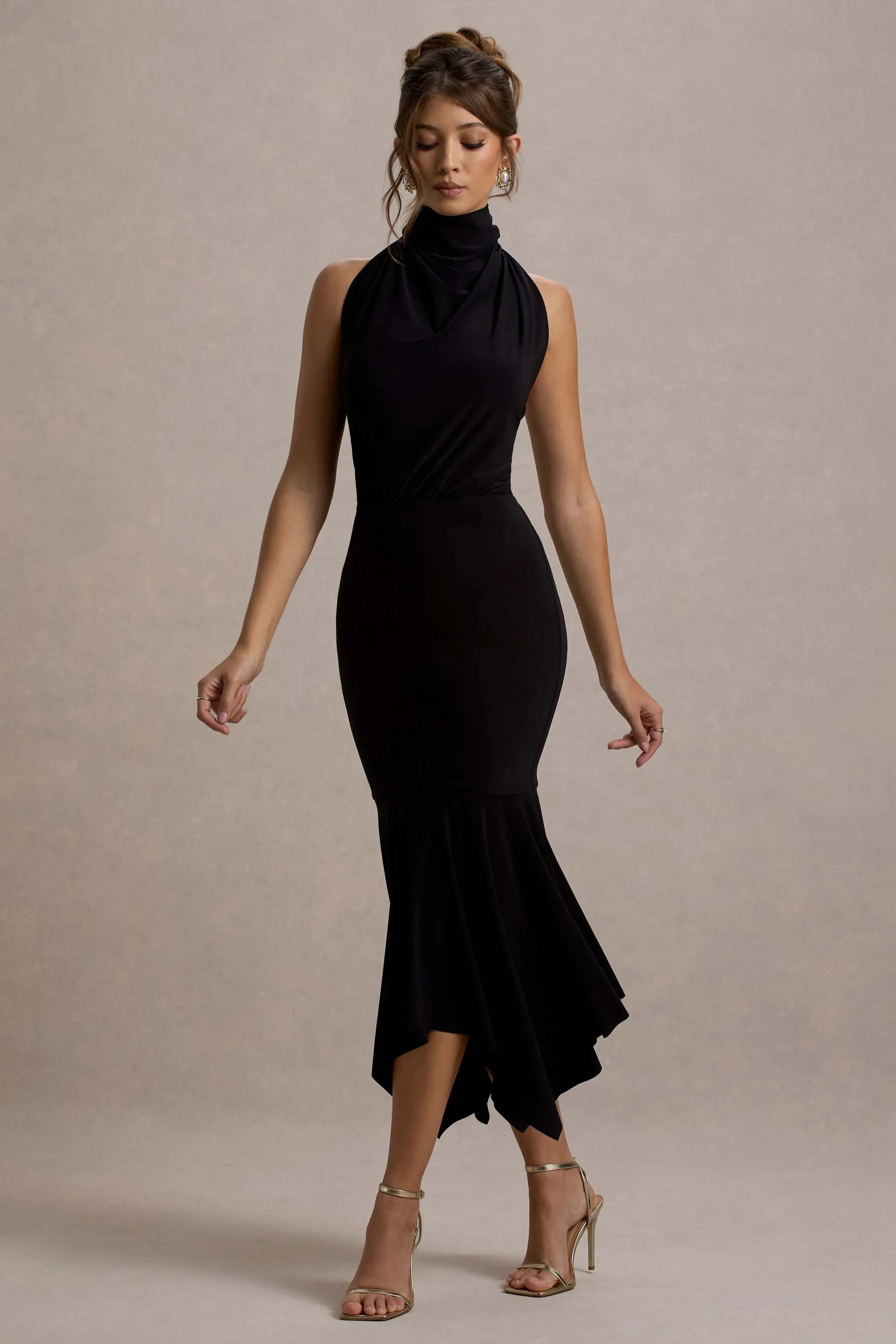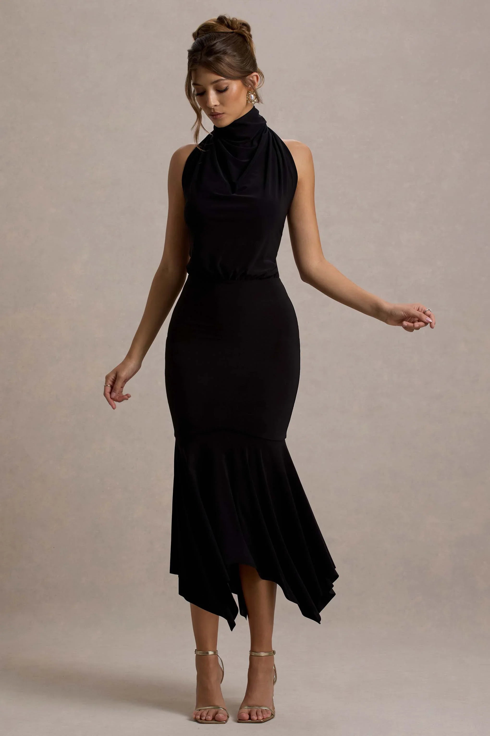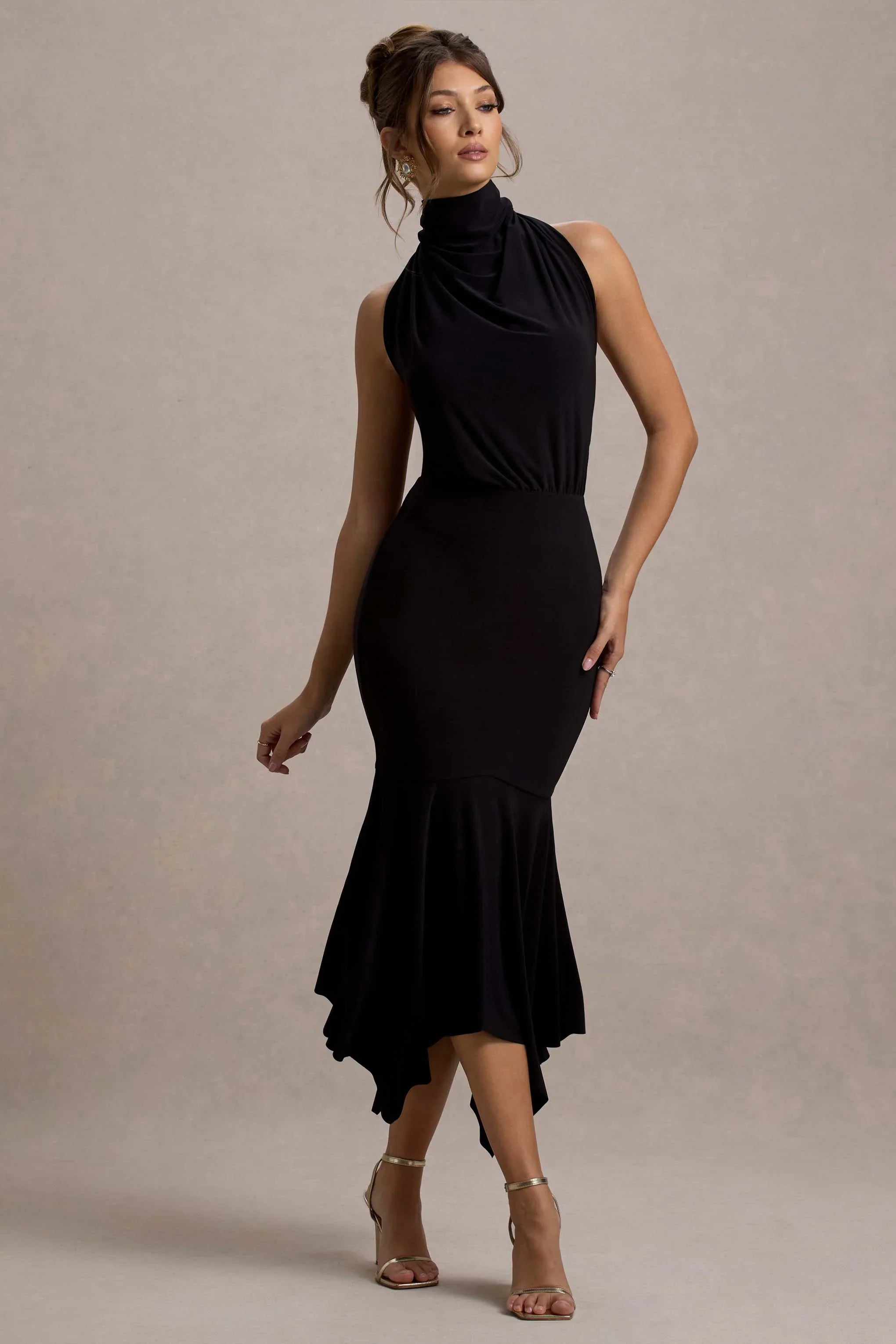 Defined by its sculptural elegance, Prianyka is a striking choice for your next special occasion. Crafted from our premium scuba crepe, this black midi dress features a sophisticated high neckline and expertly draped bodice that cascades into a sleek silhouette. Designed to enhance your curves, Prianyka brings effortless drama with its minimalist yet refined details. Pair it with statement earrings and sleek heels to let this captivating gown command attention at your next event.