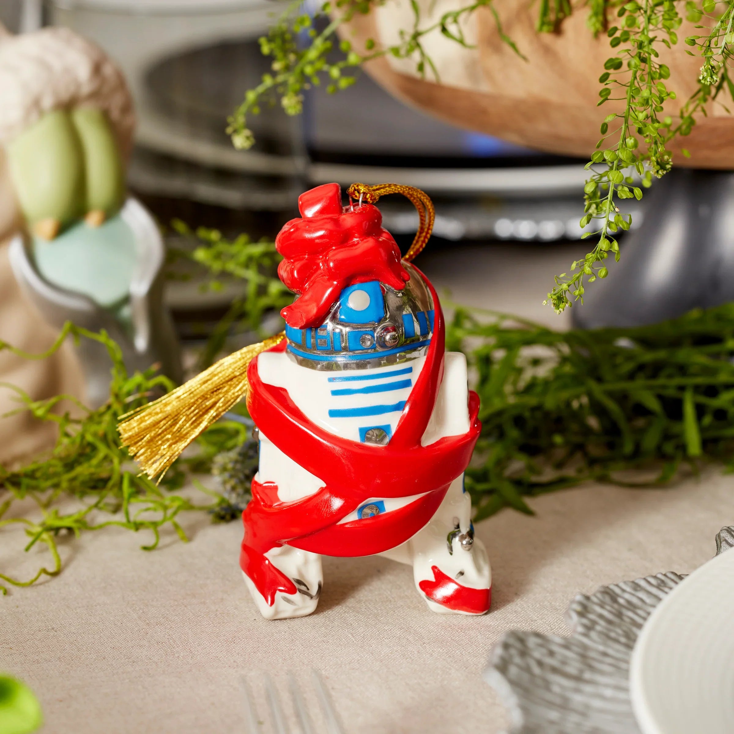 R2-D2 is wrapped up and waiting for the Christmas celebrations to start! This delightful droid is decked out for the season with a bright red bow and ribbons, and is ready to take your holiday out of this world.