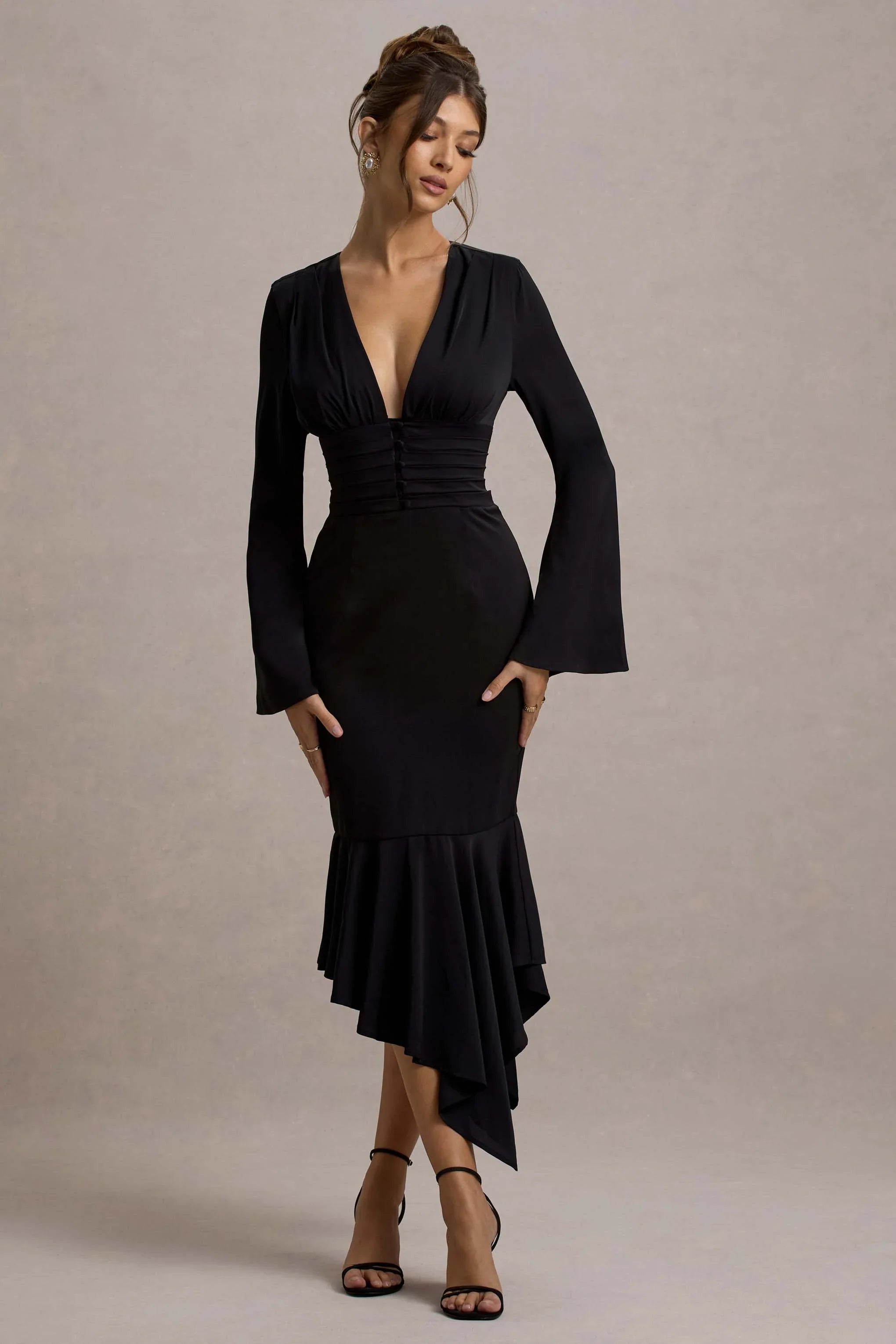 Defined by striking details that exude sophistication, Rehna is the perfect choice for your next special occasion. Crafted from our premium crepe, this black midi dress features a dramatic plunge neckline that accentuates your curves and elegant bell sleeves that add a touch of vintage charm. Designed to contour and flatter, Rehna is best paired with bold earrings and sleek heels for an effortlessly chic ensemble.