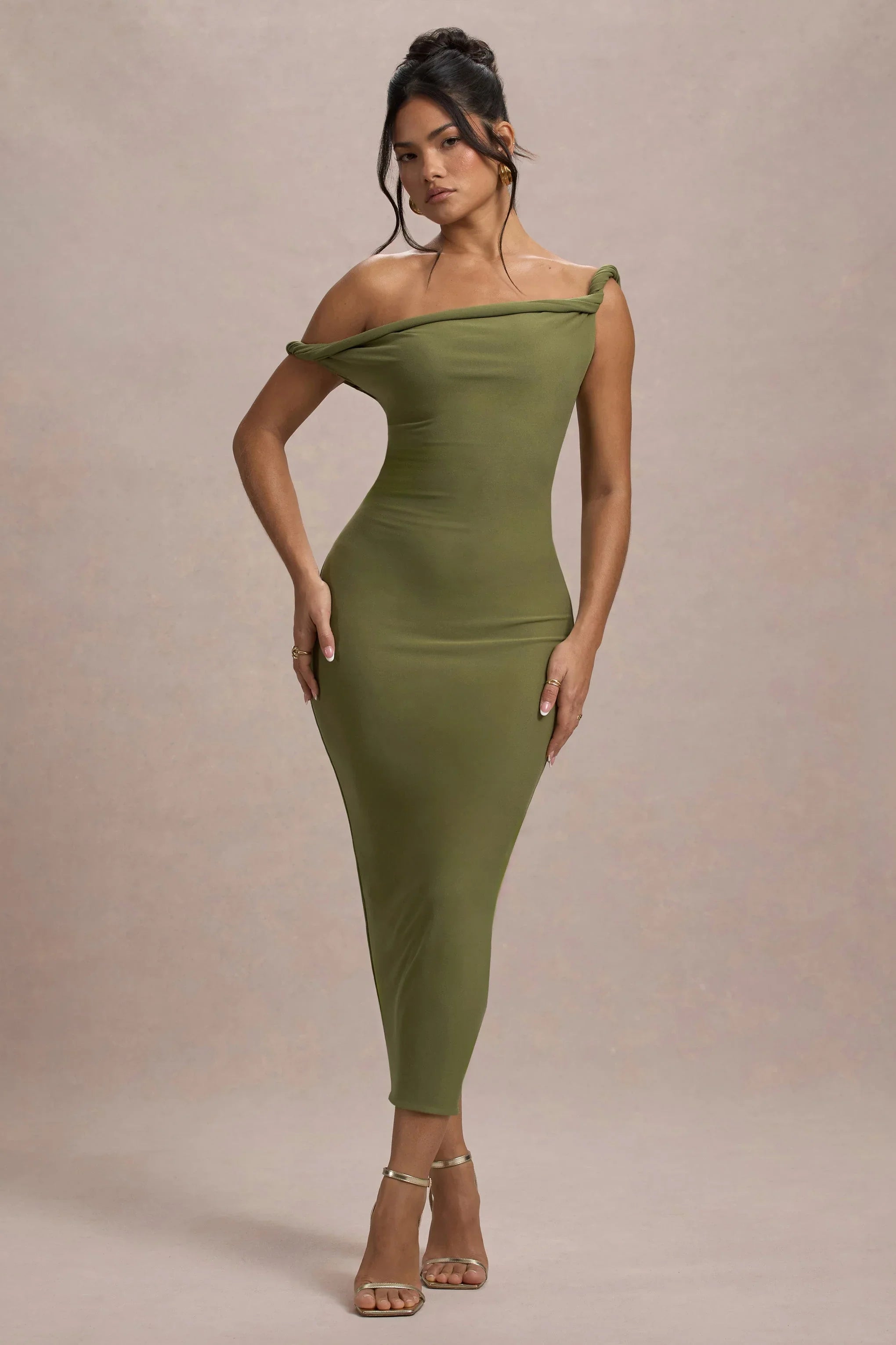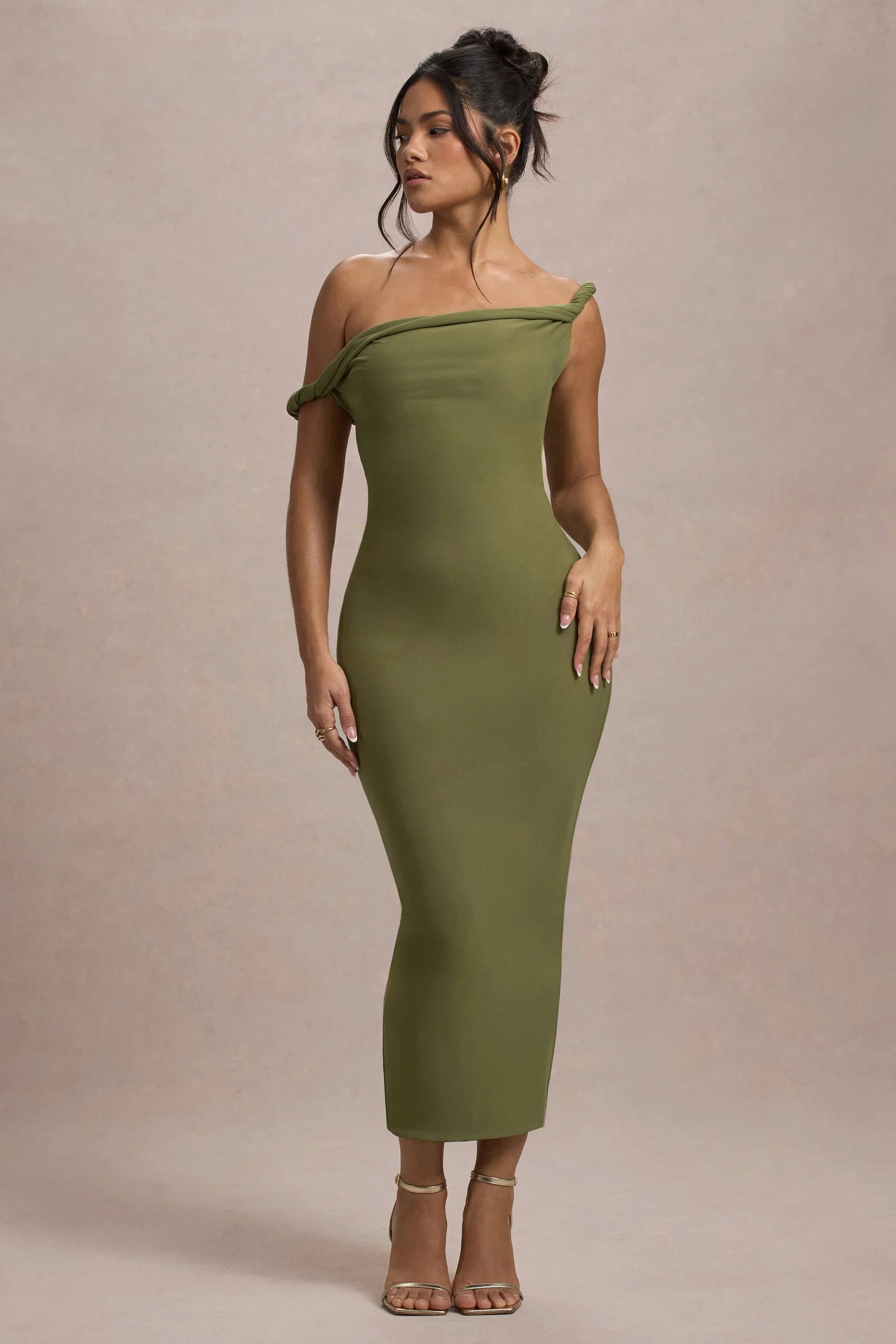 Minimalistic with a twist, say hello to Salome. This midi dress in olive has been crafted in our premium brushed jersey for figure-flattering comfort. Detailed with an asymmetric twisted neckline for a new season shape, keep Salome at the forefront with a sleek updo and gold accents.