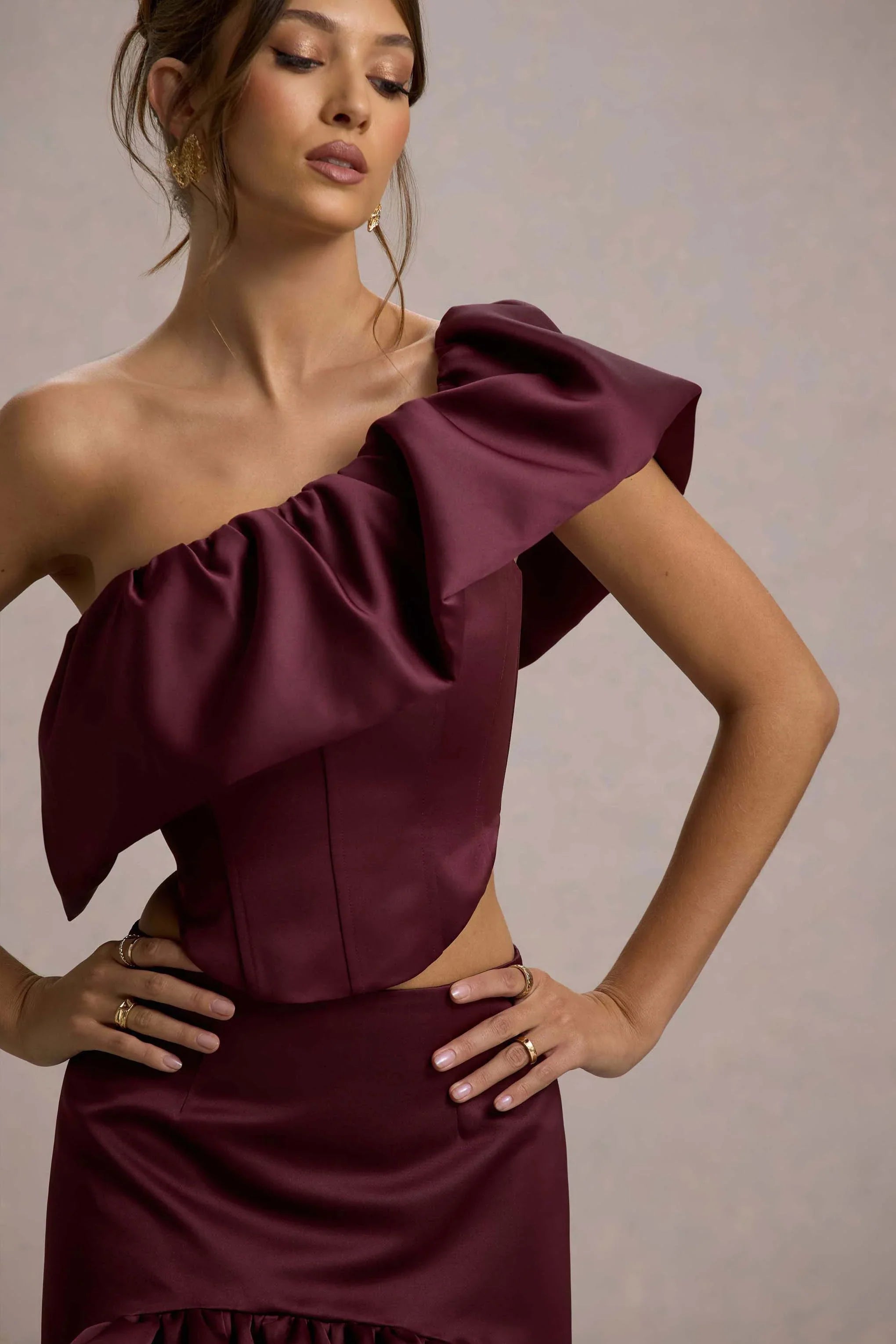 Every closet needs a corset, and Sandie is no exception. Designed in a deep merlot shade of our premium satin fabric, this asymmetric corset boasts an artful ruffle trim, boned bodice and flattering dipped hemline. For a lavish party ensemble, style yours with its matching maxi skirt Ruby.