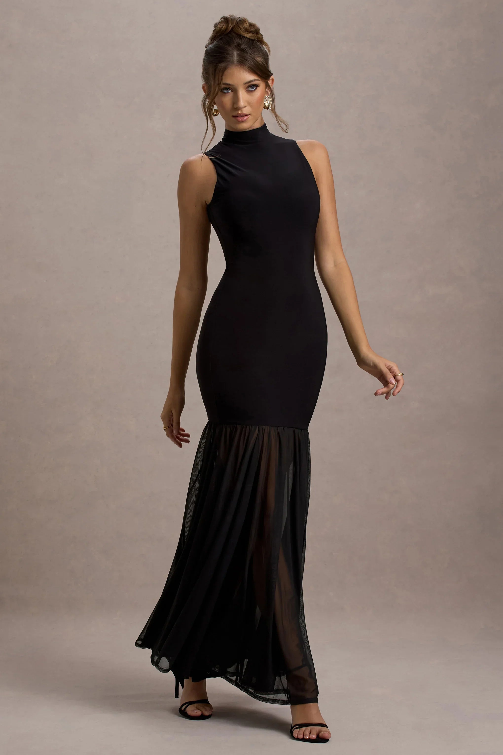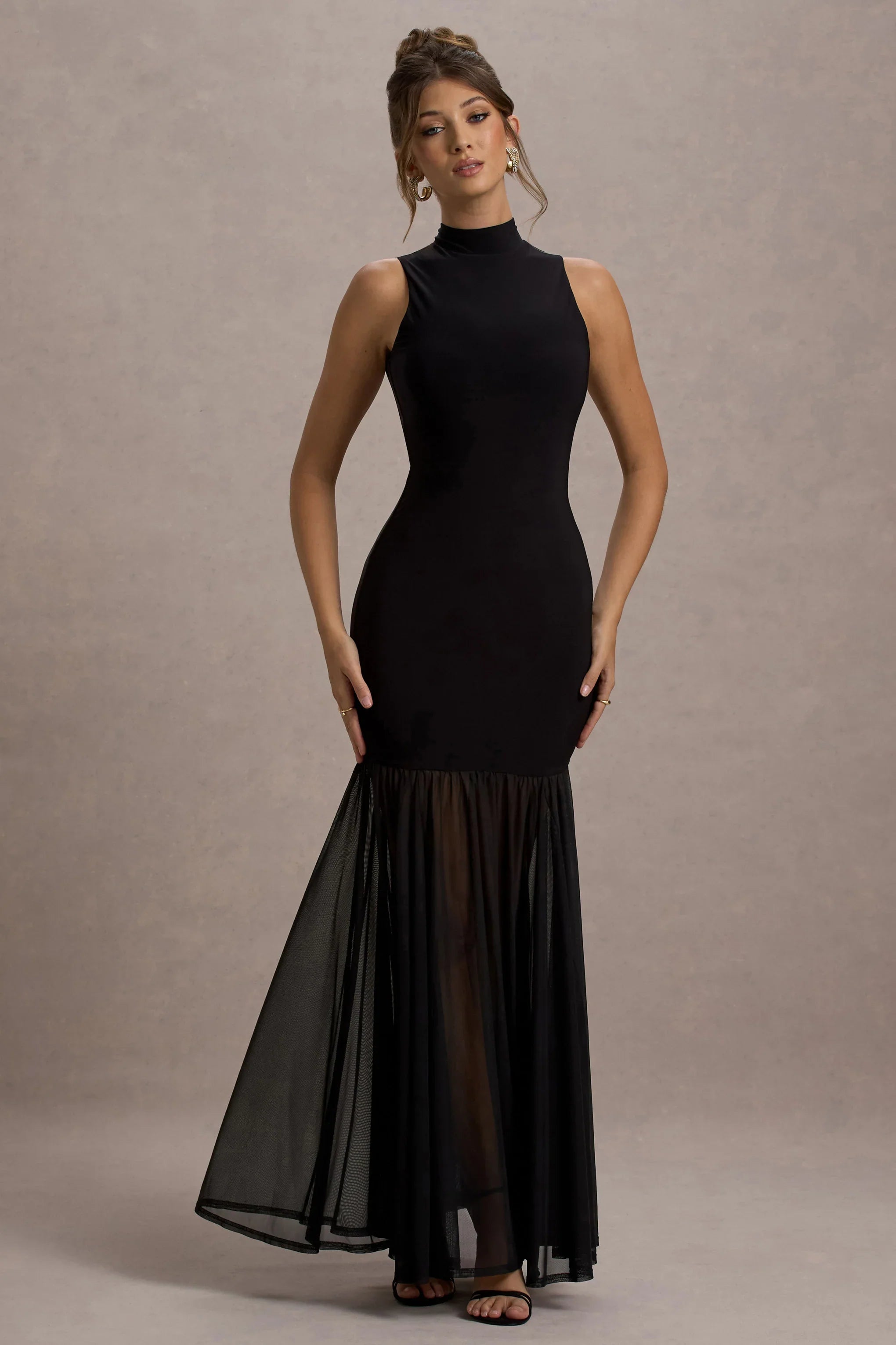 Defined by its ethereal elegance and captivating design, Shae is an enchanting option for your next special occasion. Crafted from premium soltan, this black maxi dress features a high neckline for a refined, sophisticated look. The sheer skirt adds a touch of allure, creating a graceful silhouette with every movement. Perfect for evening events or formal celebrations, keep Shae in focus with delicate accessories and strappy heels for a look that effortlessly blends romance and modern sophistication.