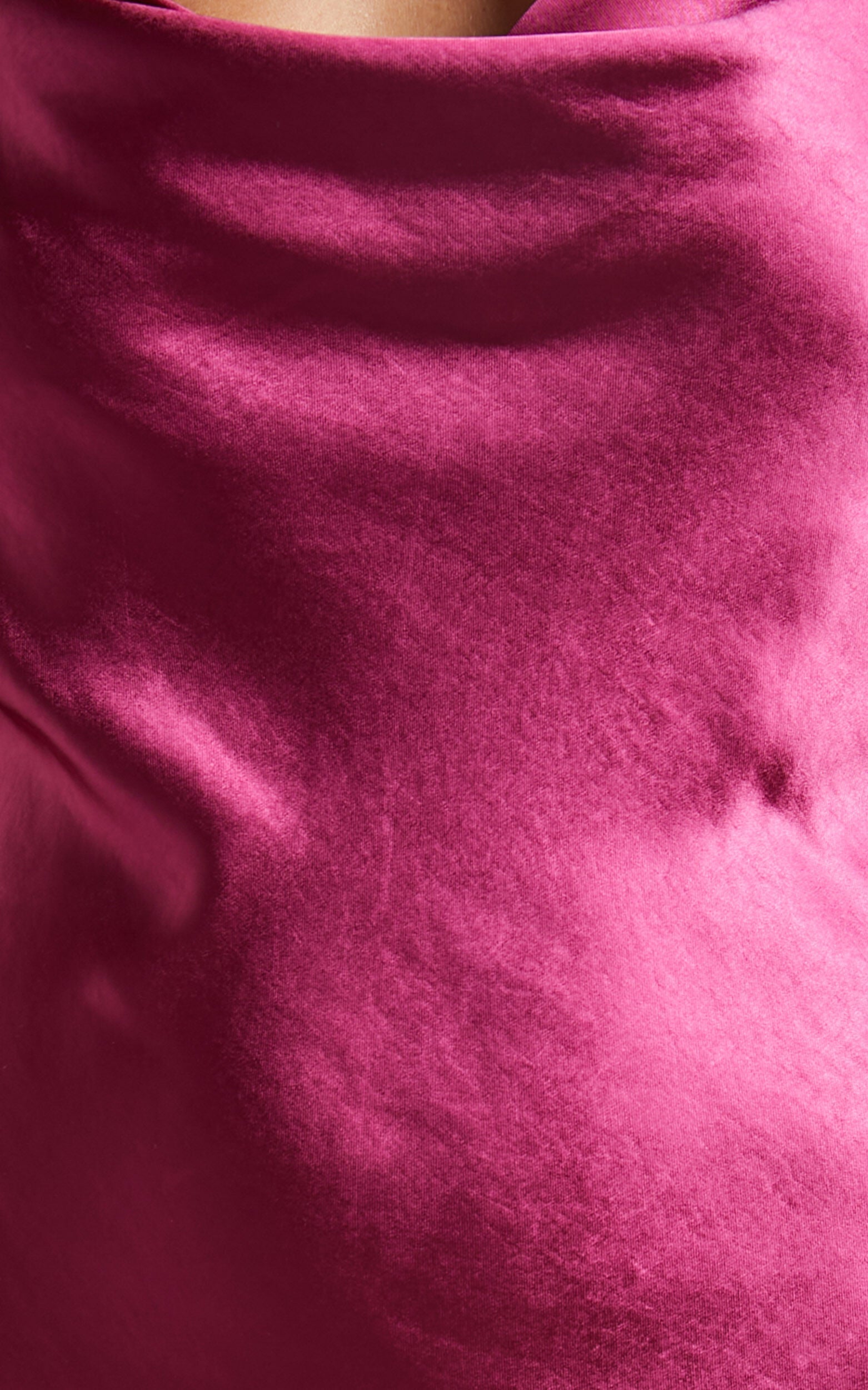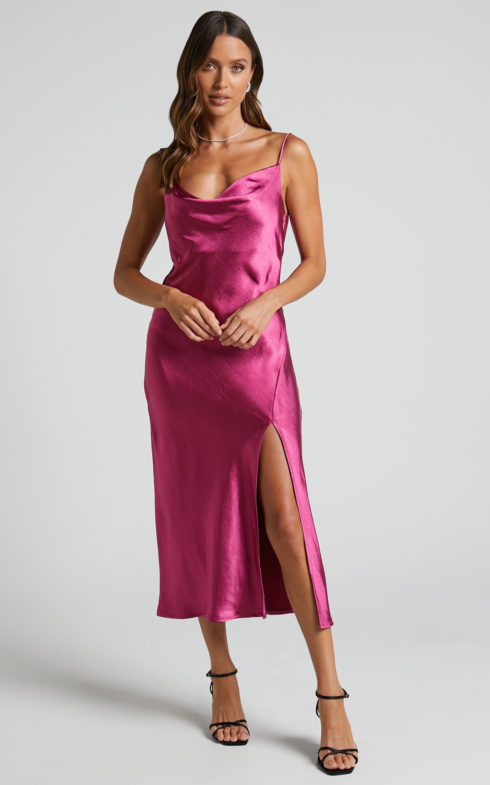 Calling all goddesses! Our Sherrie Midi Dress will highlight your natural glam at that next special event or party. A sultry satin style with a cowl neckline at the front and a matching draped look at the back, it��s made to be worn with strappy heels, glittering jewels and a fancy clutch!