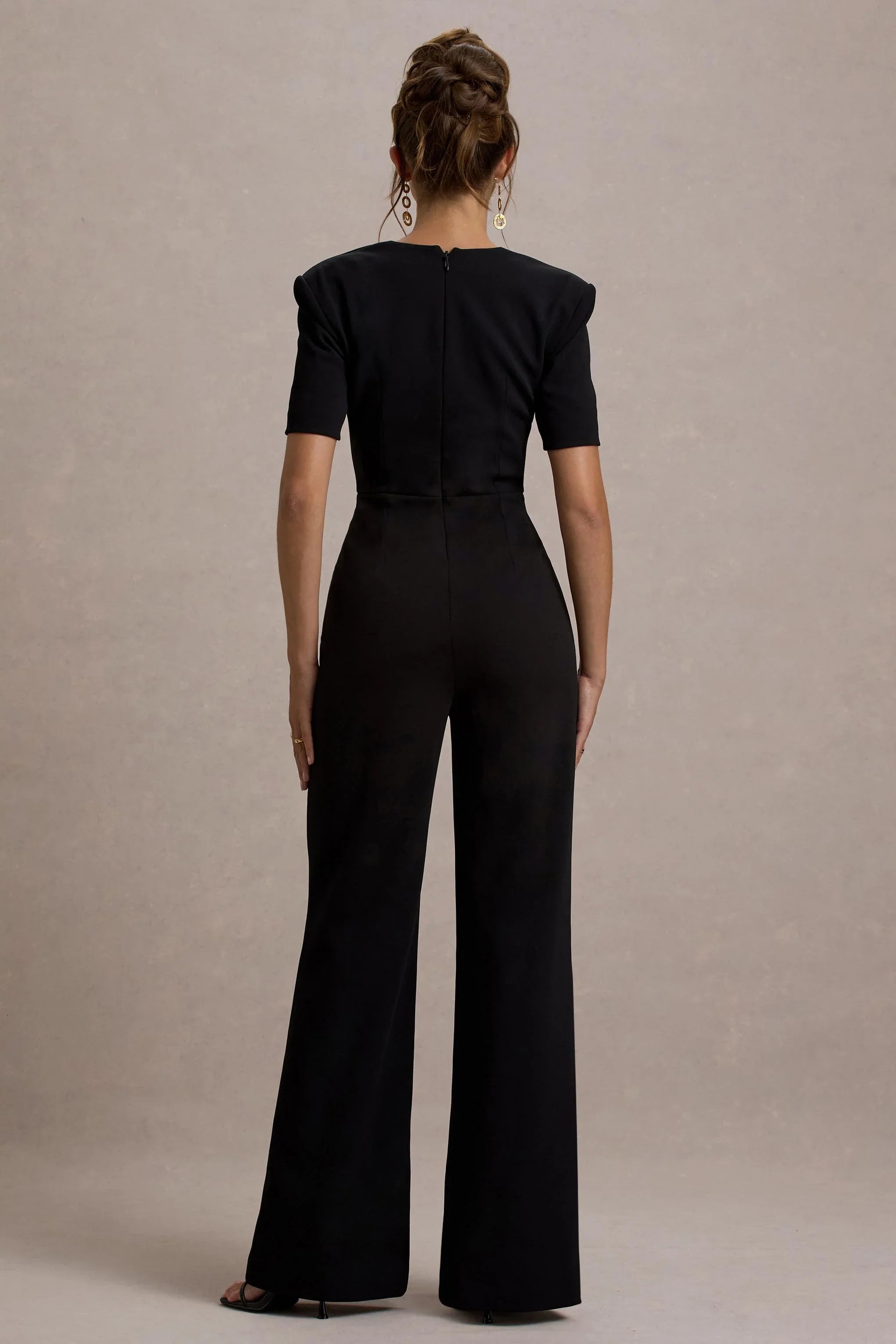 Defined by sophisticated details and modern elegance, Simone is a standout piece for your next special occasion. Crafted from our premium crepe, this black jumpsuit features a flattering sweetheart neckline and chic short sleeves that exude timeless allure. The wide-leg silhouette creates a dramatic flow, designed to elongate your frame while adding effortless glamour. Perfect for evening events or cocktail parties.