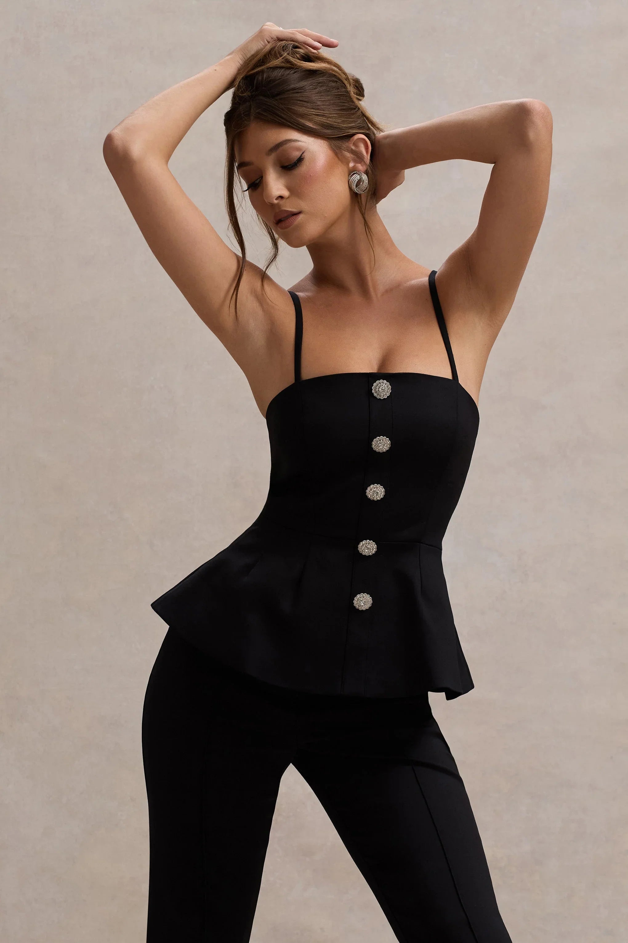 Look no further for your perfect staple summer top - Skyla has arrived. Curated in a black premium cotton modal, this flattering piece is decorated with diamante buttons and a gorgeous peplum hem for that utter feminine look. Dress Skyla up with a pair of strappy heels or dress it down with some chic trainers.