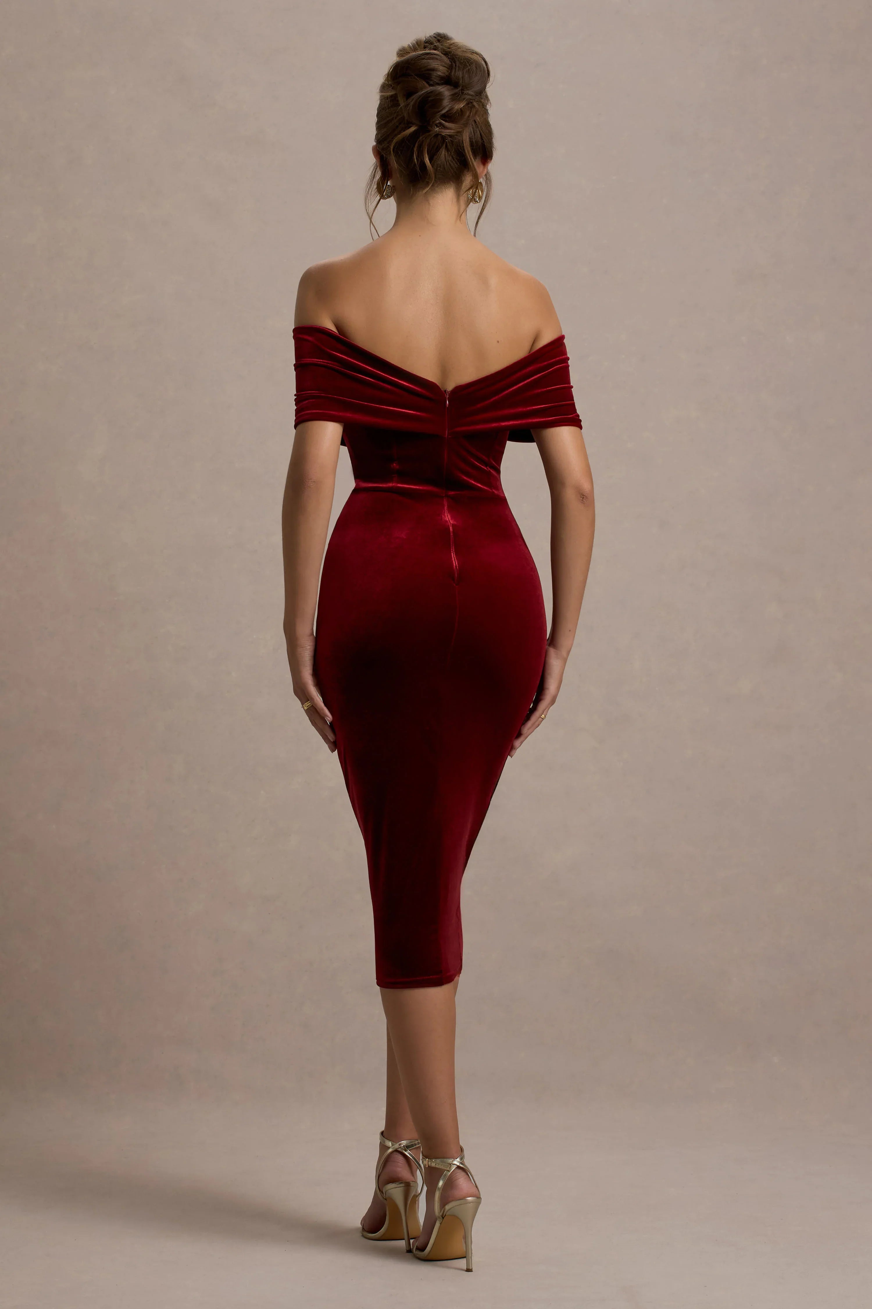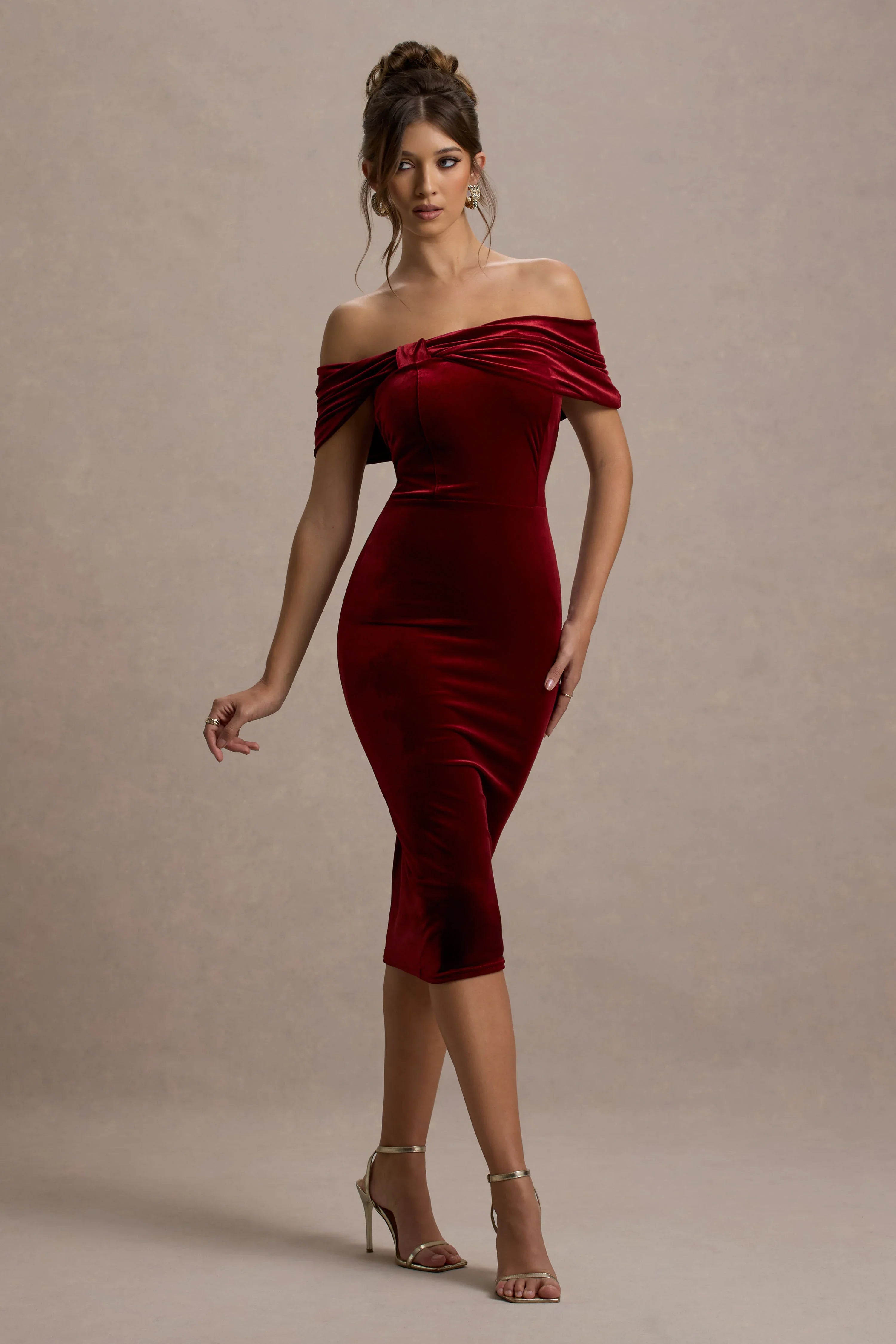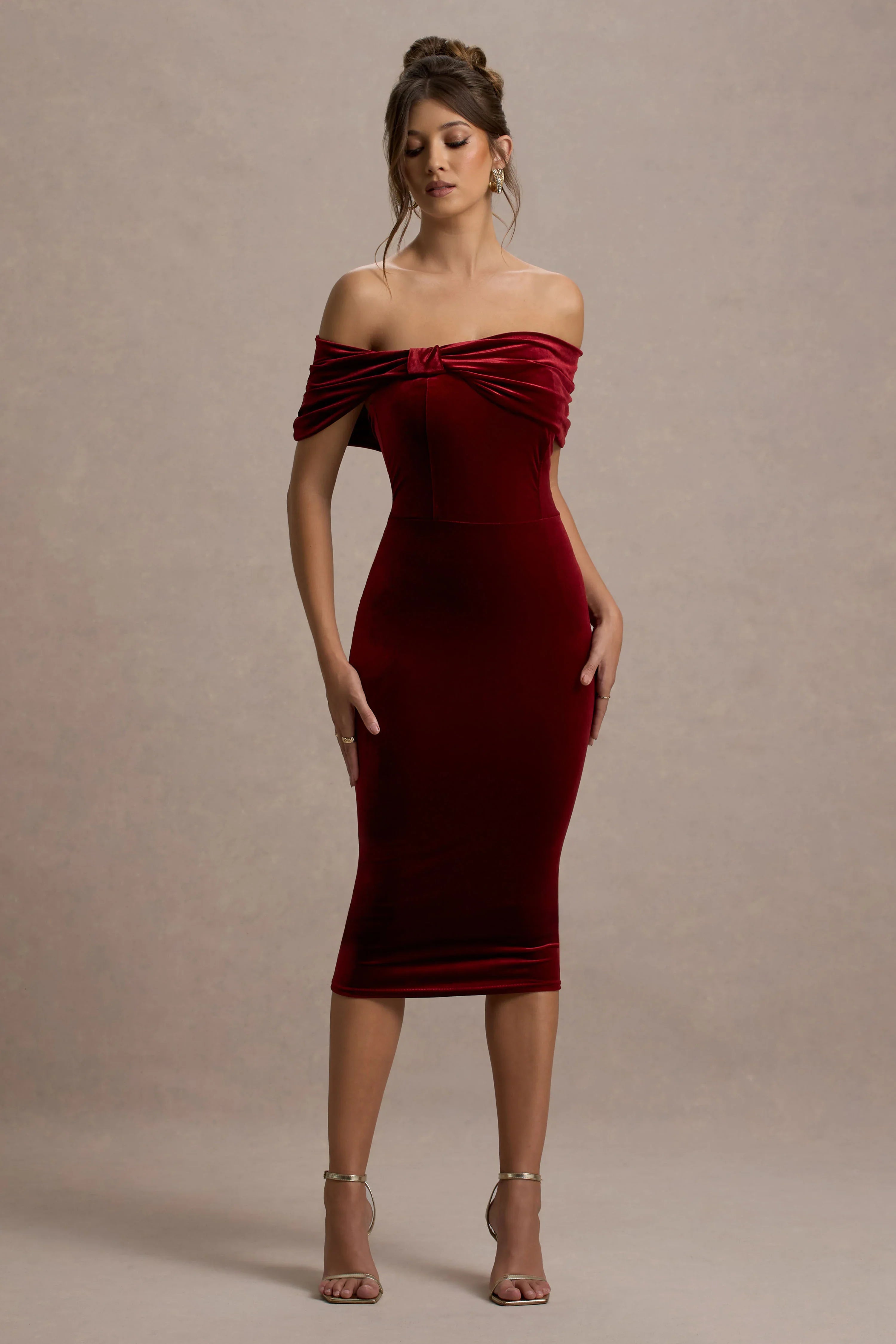 Meet Snowflake, our must-have midi dress made from a rich berry velvet that's both supportive and sculpting. Sure to turn heads at any formal event from birthdays to baby showers, this bodycon dress features a bardot neckline wrapped by a large bow and a split fitted skirt.
