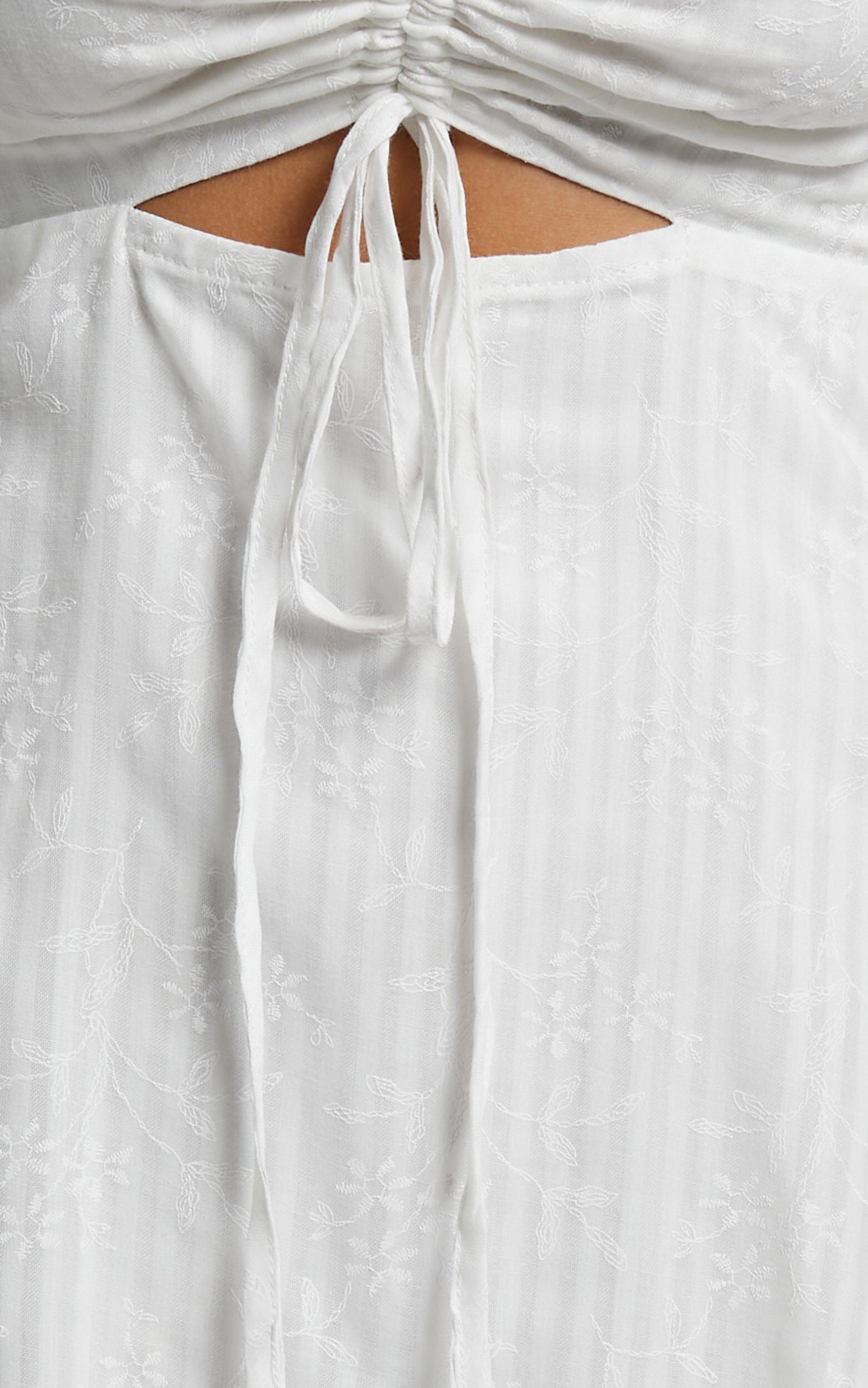 You'll be all set for that summer day date or party with our Soft Mention Dress! This pretty and sweet floral embroidered mini features a sweetheart neckline with ruching at the bust and a small cut out, and sheer puff sleeves with ruffle detail. It's the perfect LWD for any upcoming event or occasion, and it can easily be dressed up or down. Wear it with heeled sandals, a statement necklace and mini handbag to match!