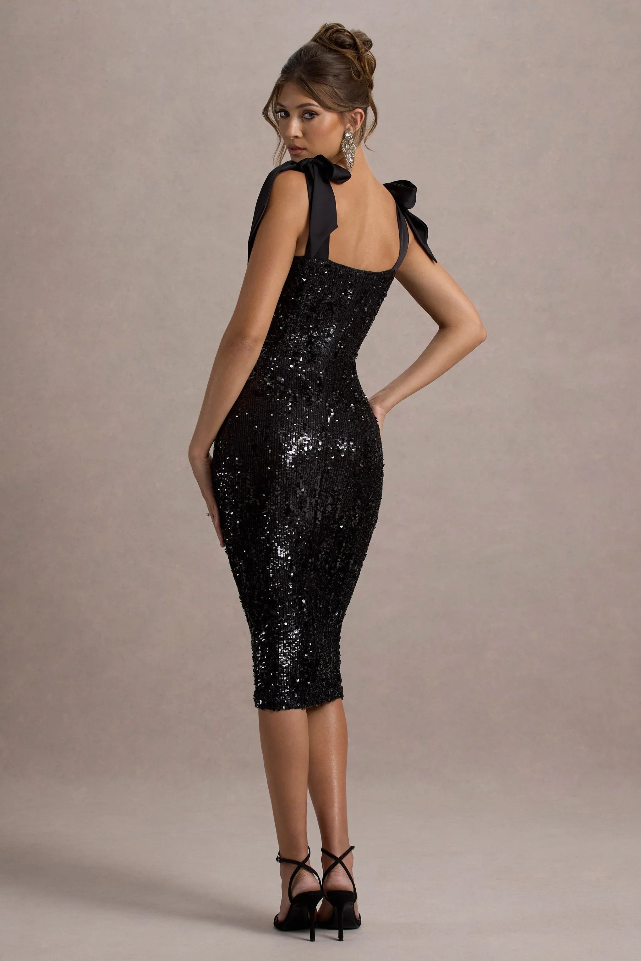 Designed to dazzle, party season calls for a dress like Solaria. Designed in a shimmering bodycon silhouette of black sequins, this midi dress is defined by a sculpting square neckline and eye-catching bow straps. Keep Solaria at the forefront of your next event by styling yours with some simple stilettos like Nostalgia.