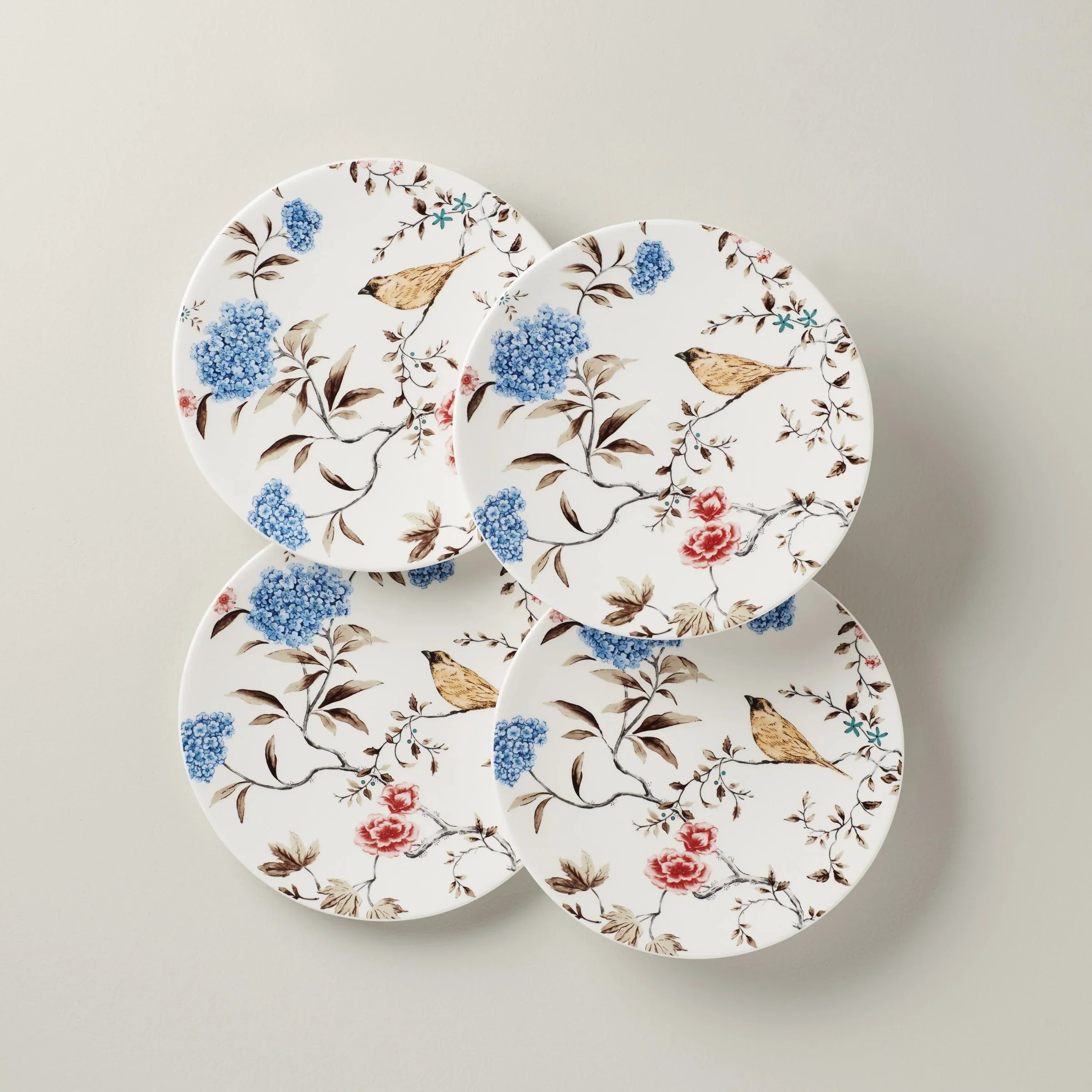 Open your home to a lush English garden with the Sprig & Vine collection. Inspired by the beauty of vintage textiles, this set of four accent plates combines birds and bright botanicals for a backyard aesthetic that will bring new life to your table. A sliver of metallic adds a gleaming touch to give this floral set its golden finish.