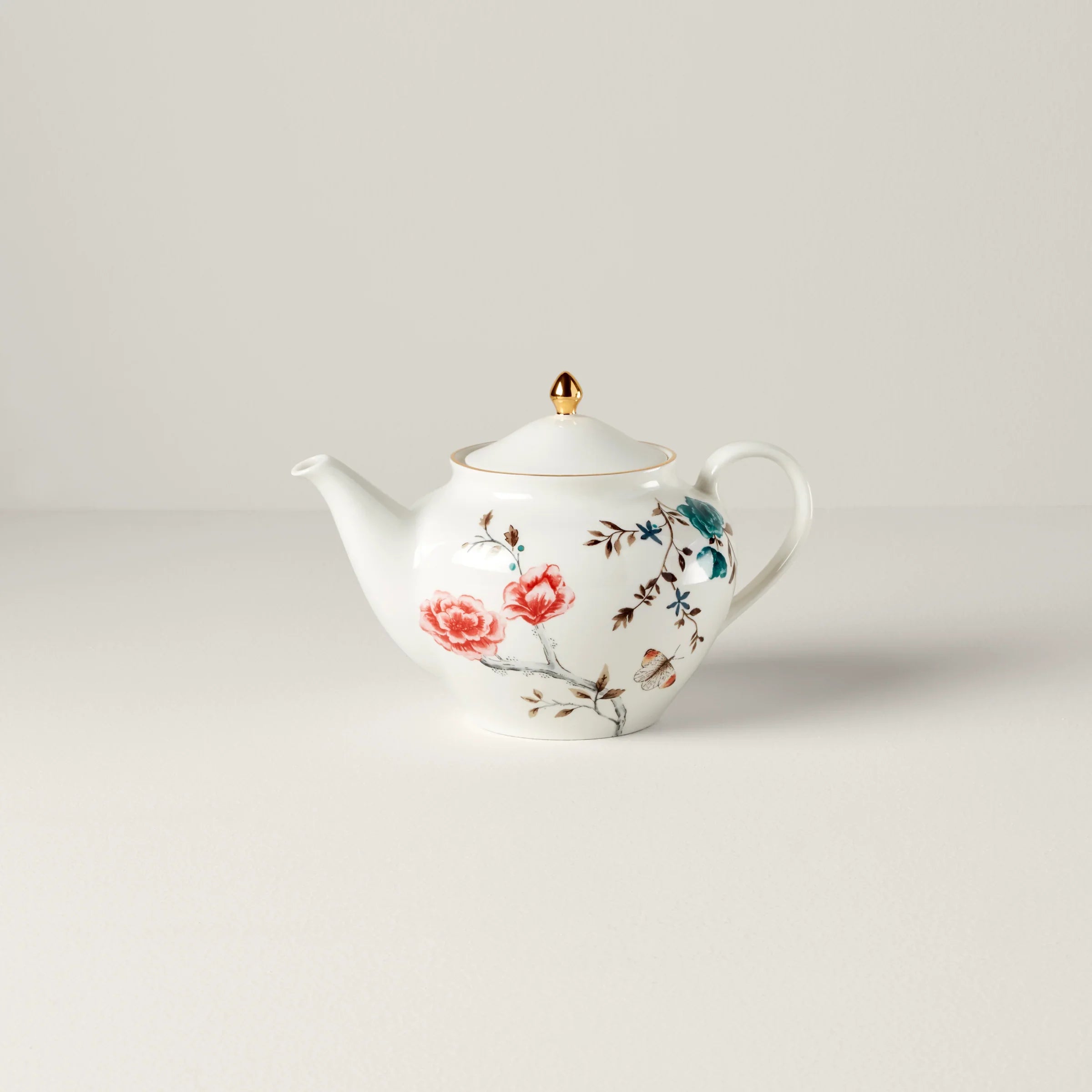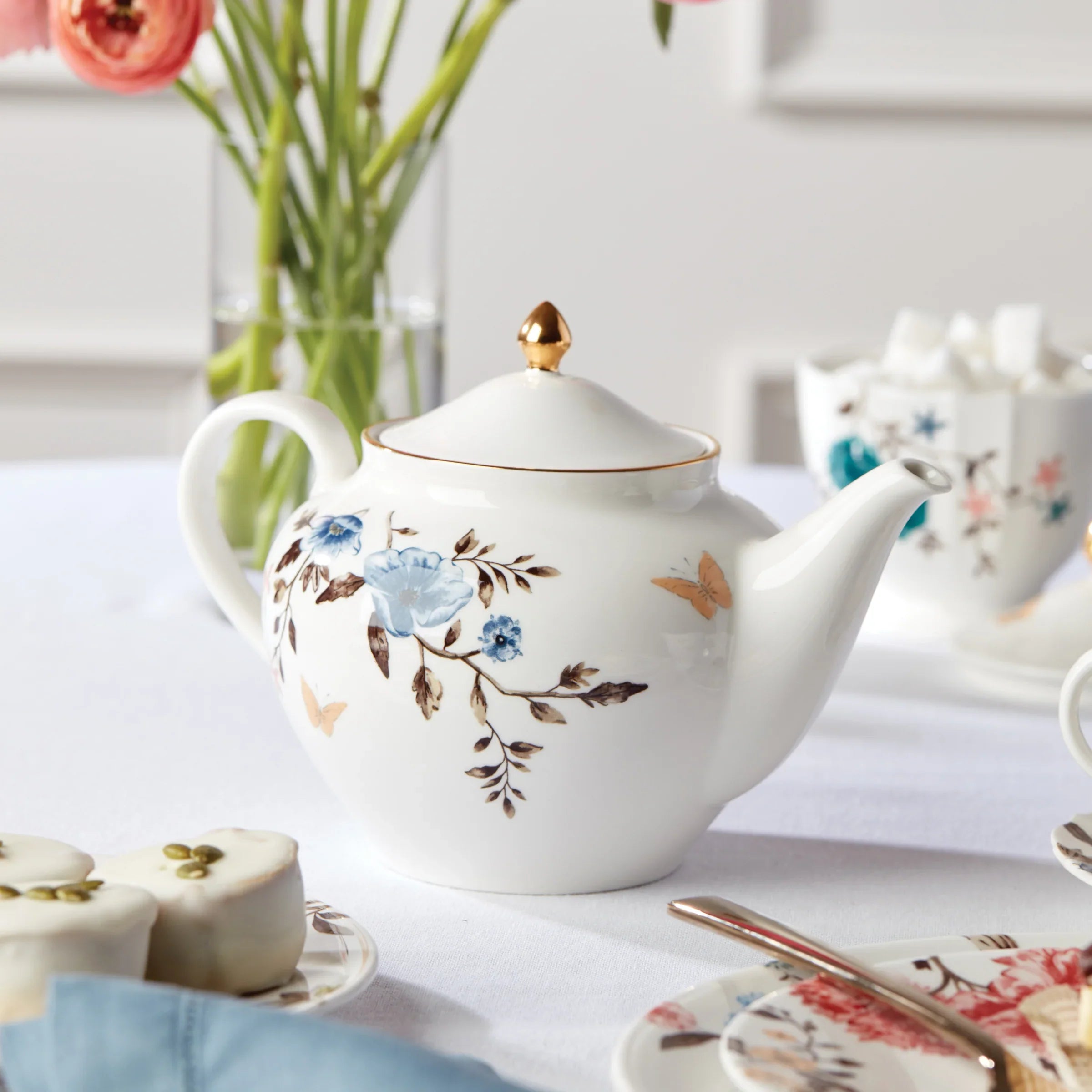 The Sprig & Vine teapot is the perfect way to enjoy your favorite tea. Inspired by the beauty of vintage textiles, this collection brings the bright botanicals and butterflies of a lush English garden to your home. A sliver of metallic adds a gleaming touch to give this floral teapot its golden finish.