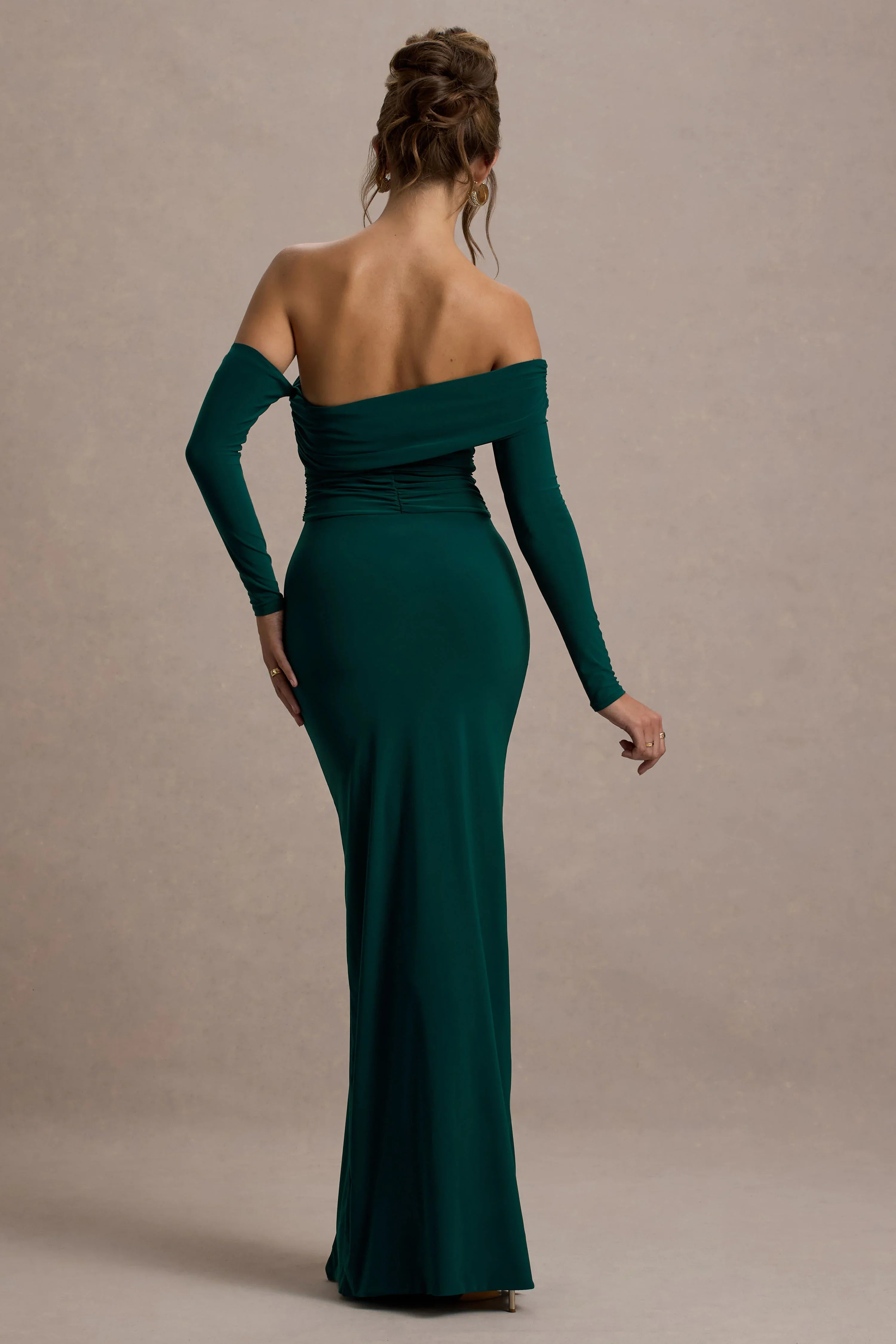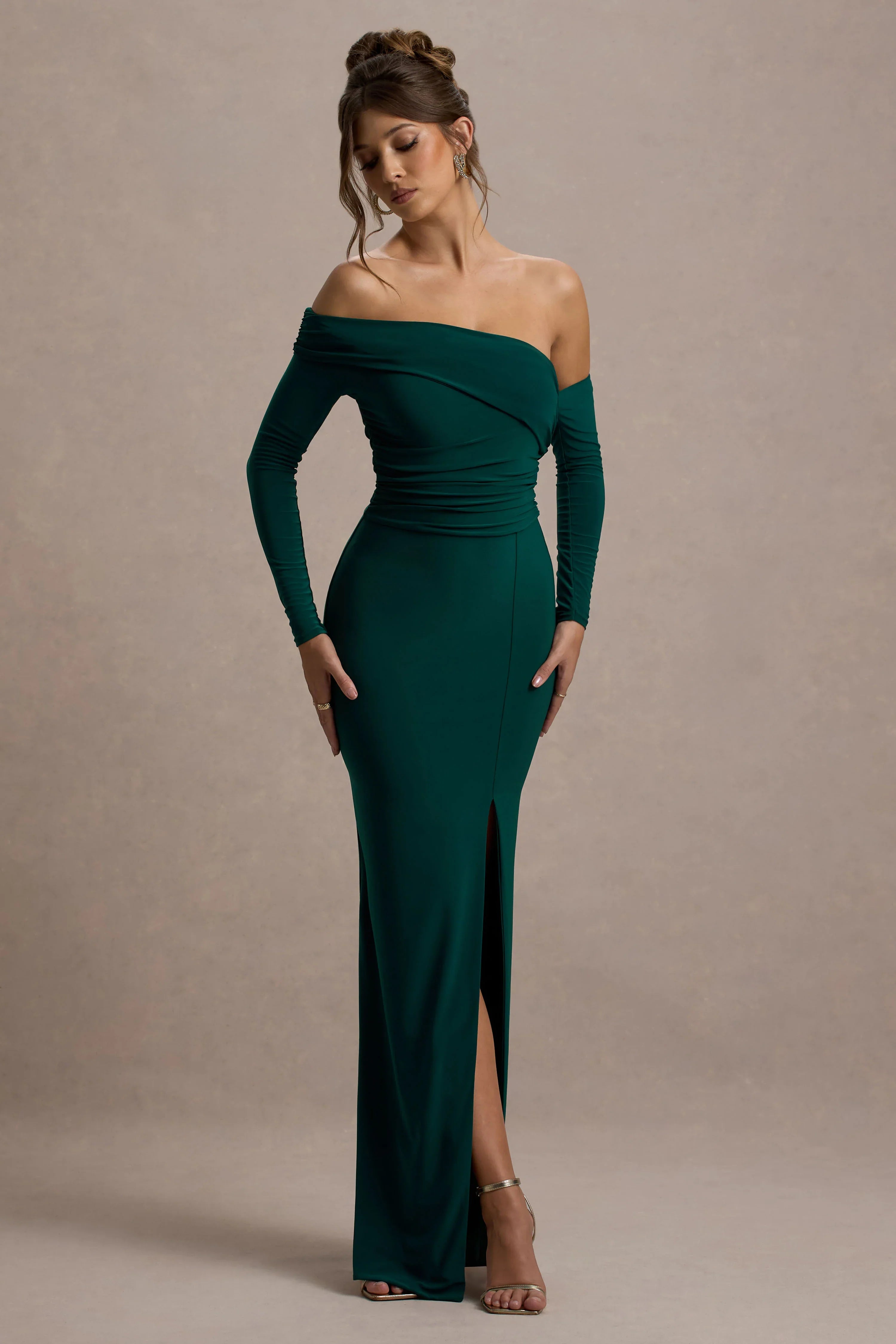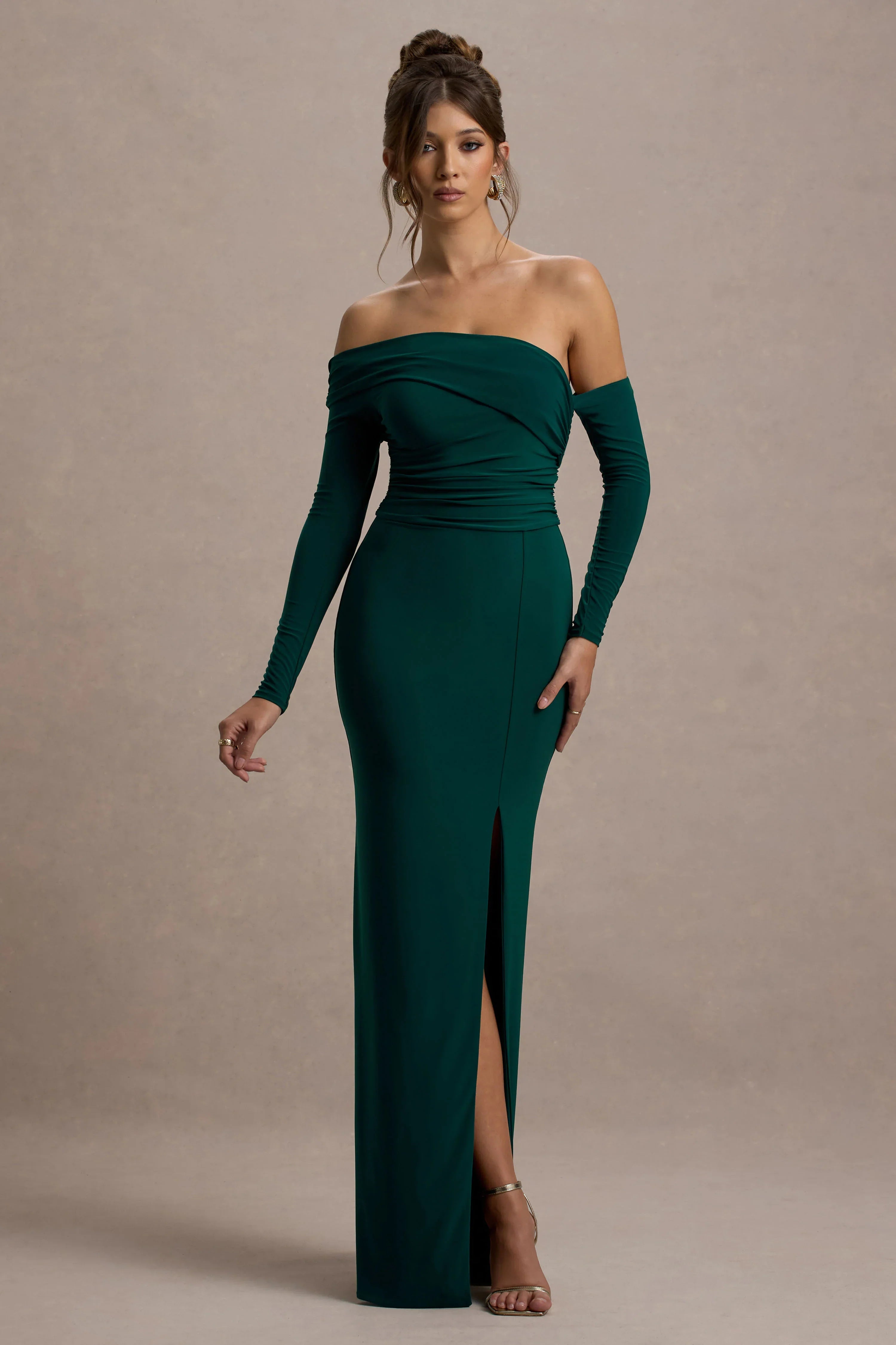 Accentuate your curves and flatter your figure in our Stand Out maxi dress. Crafted in a stretch jersey for a soft finish, our bodycon dress is complete with a seductive bardot neckline and all-over ruching for a flattering fit. This bottle green dress is perfect for all occasions this party season.