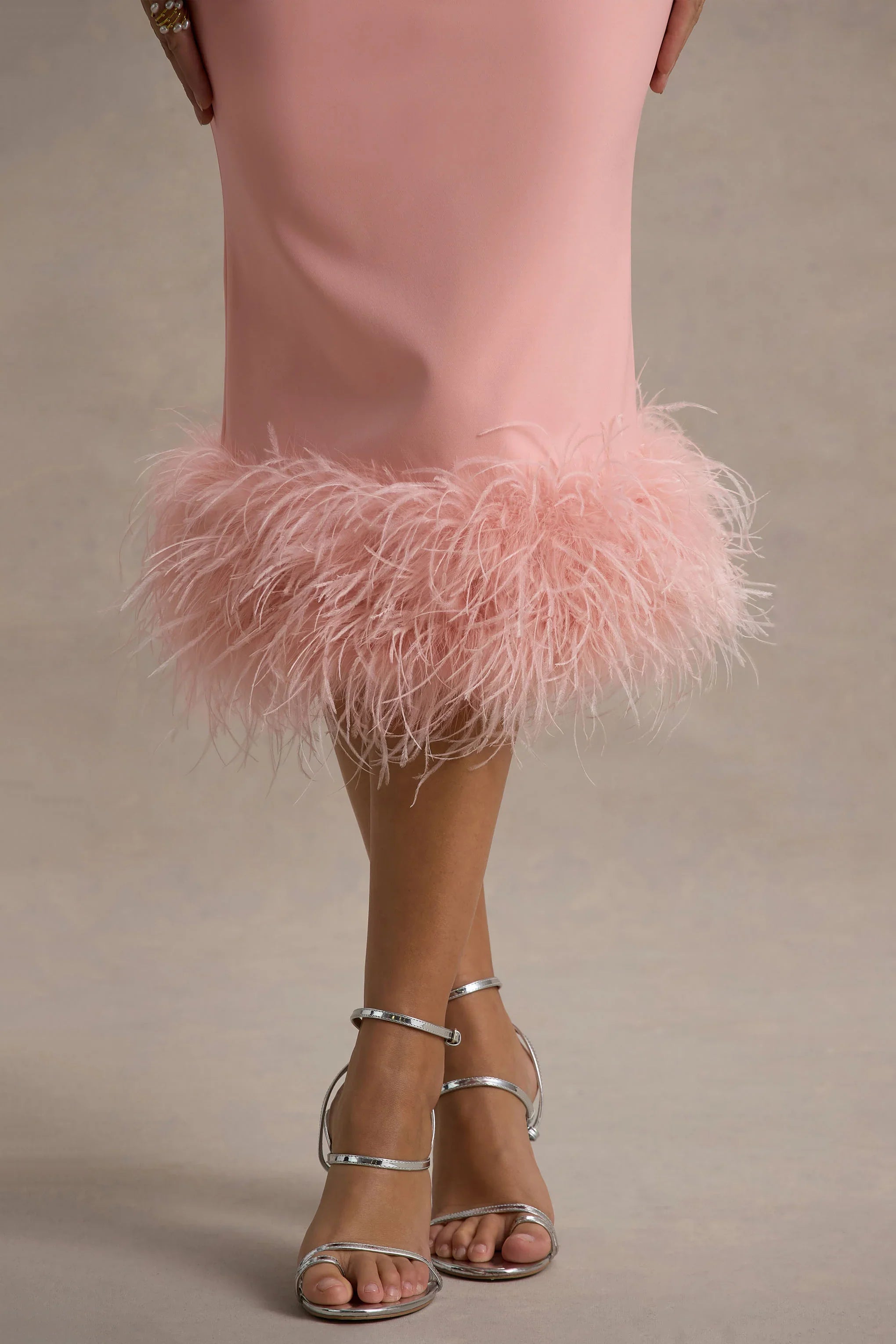 Defined by a striking blend of textures and silhouettes, Titania is your ultimate statement piece for any special occasion. Crafted from our luxurious premium crepe, this pink midi dress features a dramatic twist-neckline that elegantly frames the shoulders. The sleek, body-skimming fit is finished with an ethereal feather hem that adds a touch of playful elegance to every step.