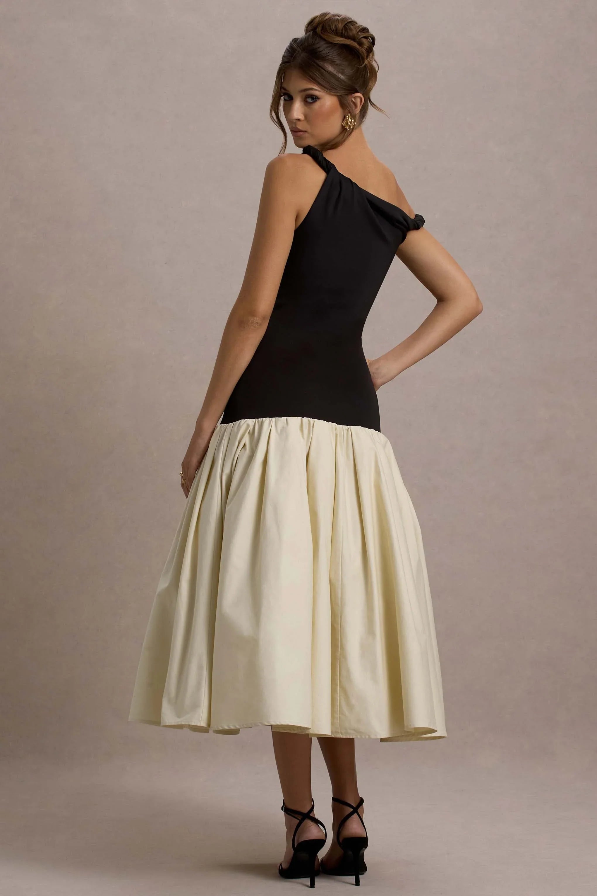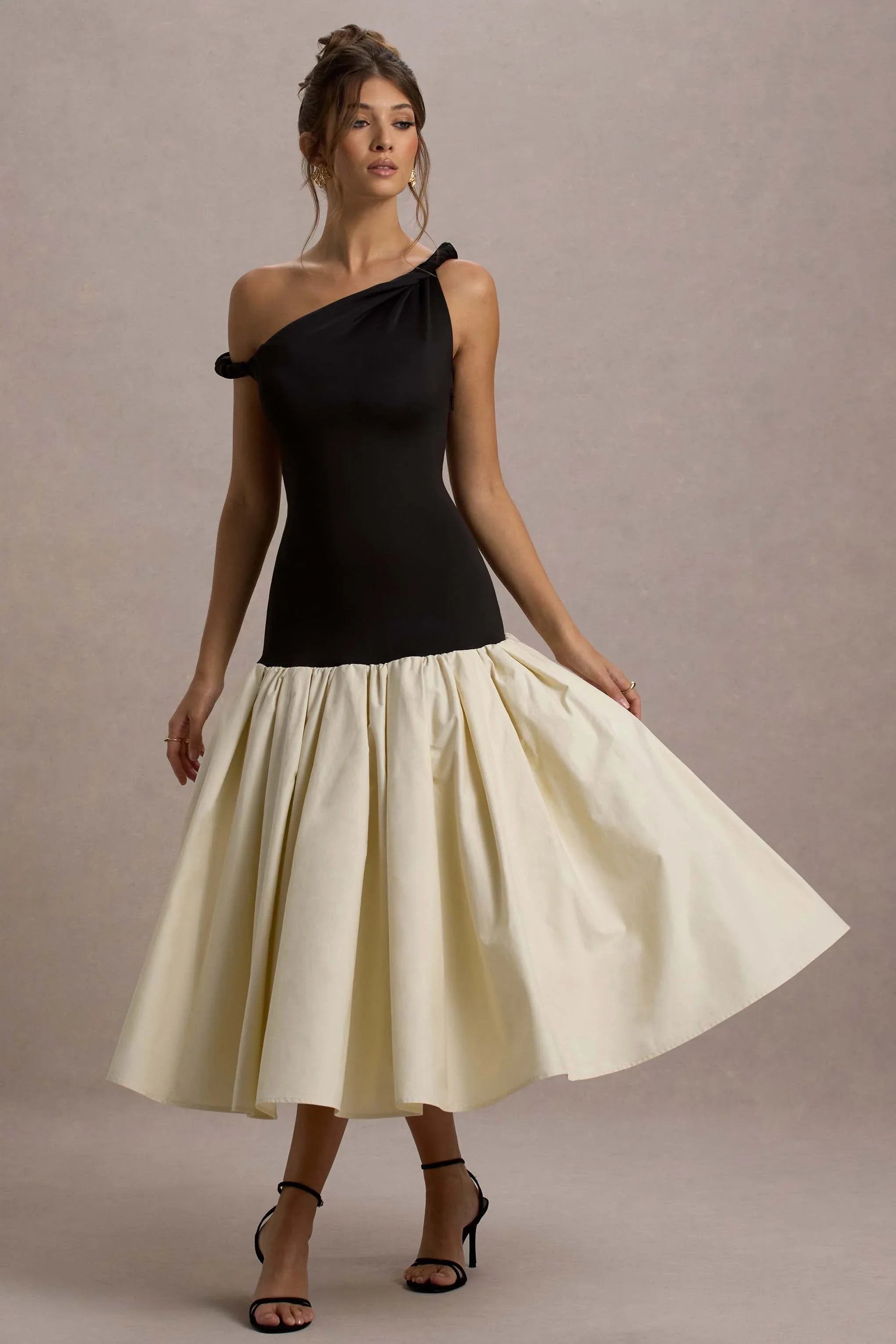 Offering up a playful feminine charm, gift your wardrobe this season with Whitley. Crafted in a premium jersey, this drop-waist midi dress boasts a twisted asymmetric neckline before falling to a cream cotton poplin volume skirt. For an elegant wedding guest ensemble, team yours with a pop of colour like Flashing Lights.