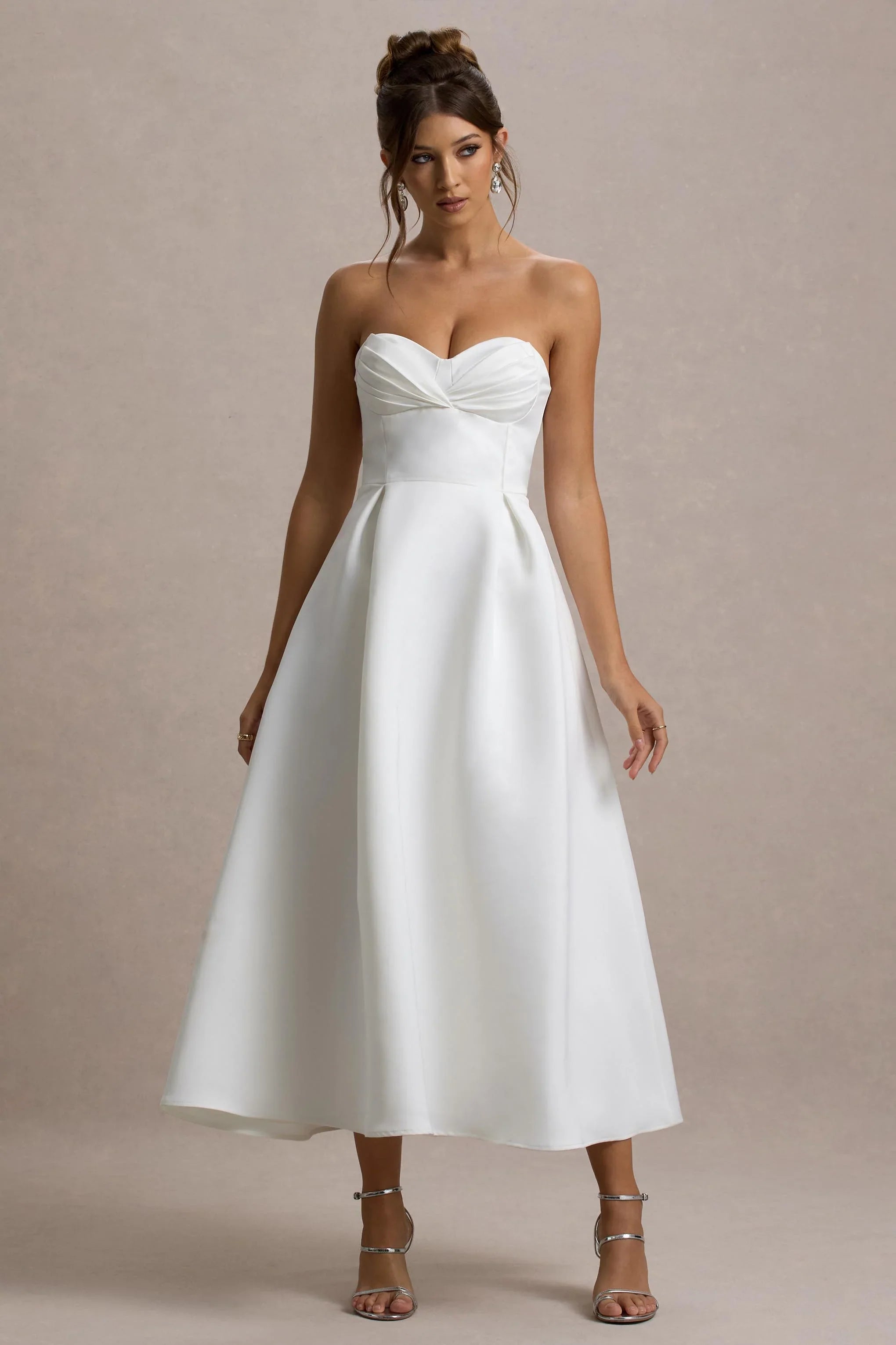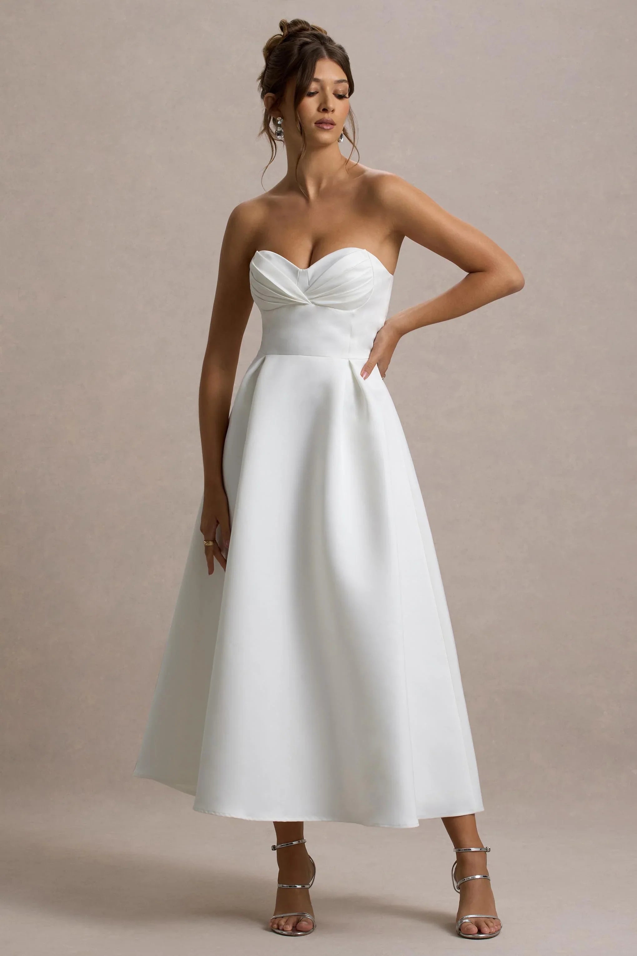 Add some feminine flair to your closet this party season with Wintour, our couture-like midi. Designed in a crisp white shade of our luxurious satin, this strapless show-stopper boasts a sweetheart neckline, boned corset bodice and fluid pleated skirt.