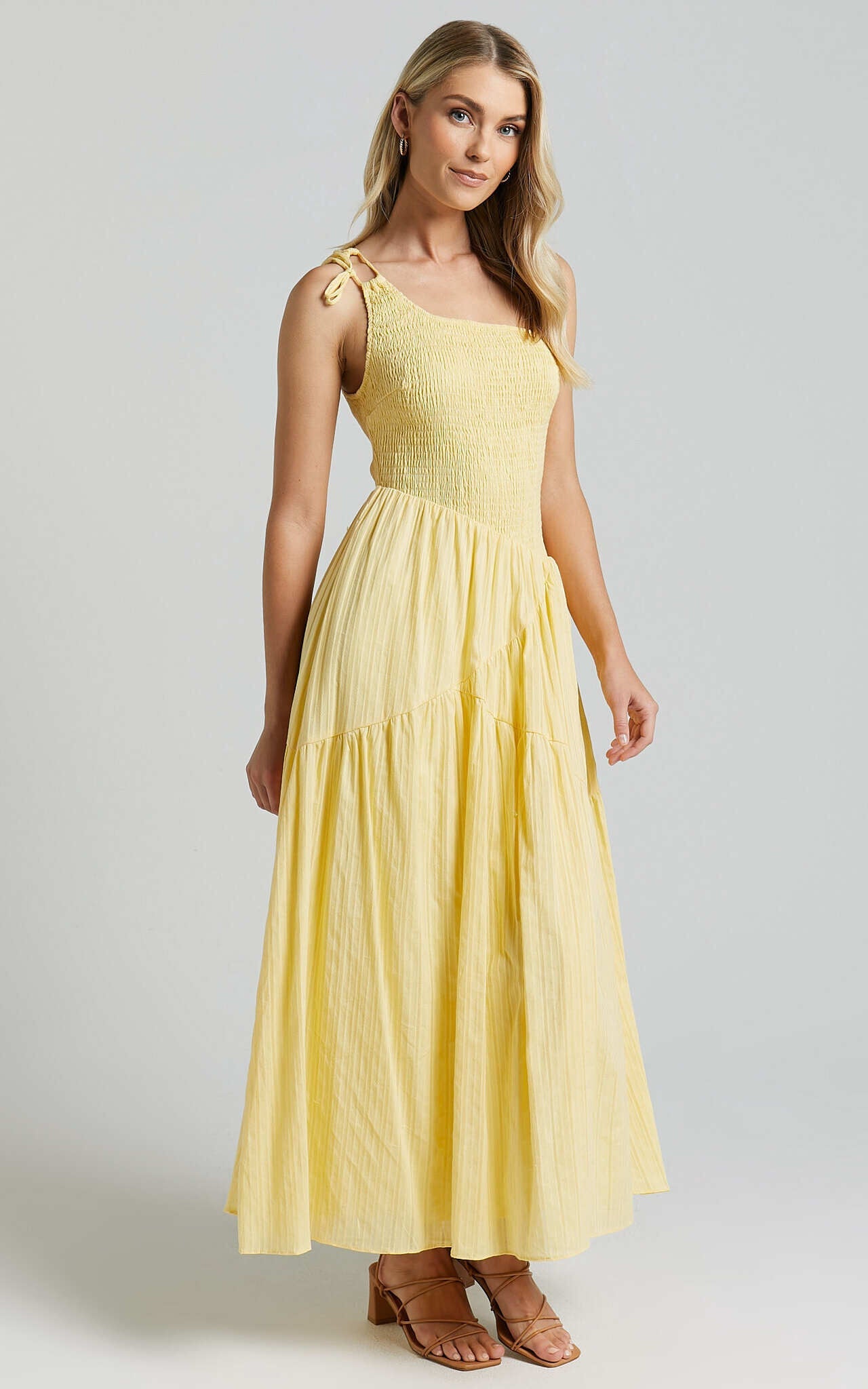 Get ready to turn heads in the Zhibet Midaxi Dress! This one shoulder tie fit and flare dress in yellow is perfect for any party or special occasion. Made from a blend of rayon and cotton, this midi dress is not only stylish but also comfortable. The fit and flare silhouette flatters all body types, while the one shoulder design adds a touch of elegance. Whether you're going to a daytime event or a night out with friends, this dress will make you feel confident and empowered. So why wait? Add some sunshine to your wardrobe with the Zhibet Midaxi Dress today!